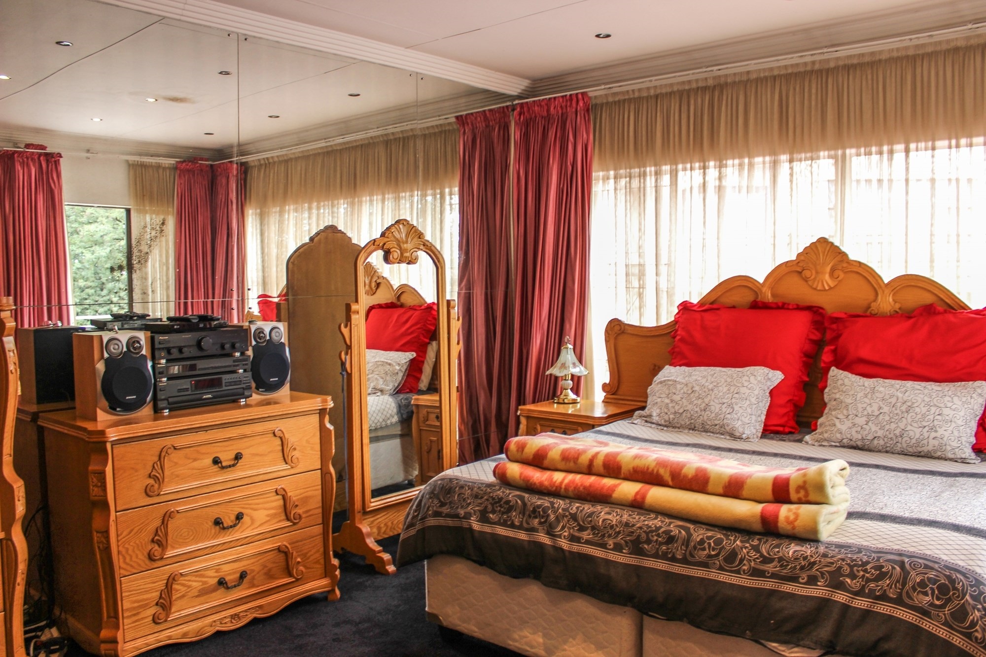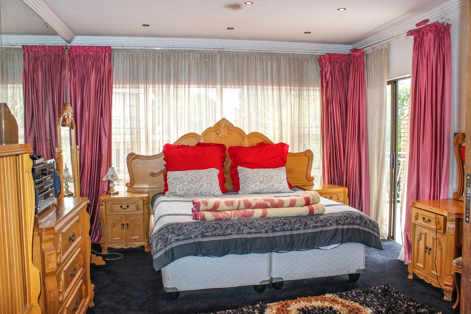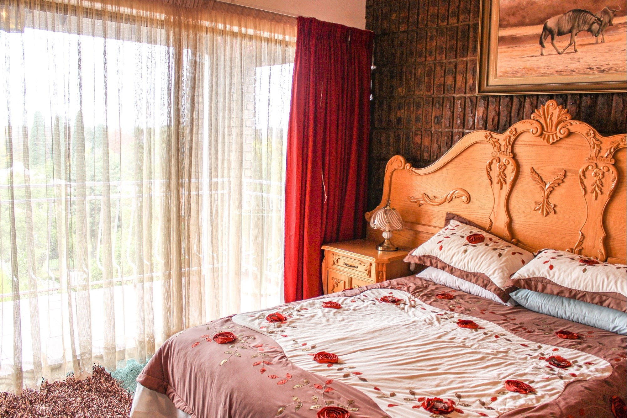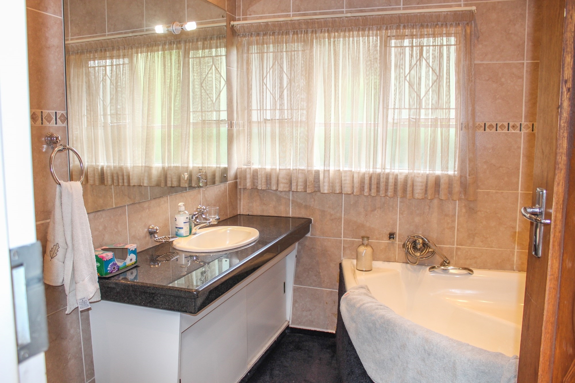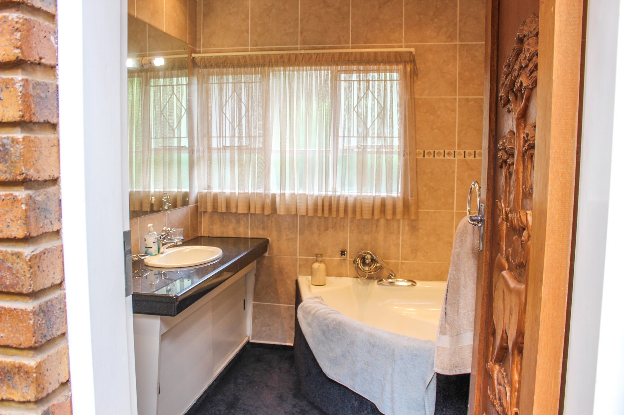The kitchen is a chef’s dream: solid wood cabinetry, granite counters, a central island, and modern appliances set the scene for memorable meals. A separate scullery/laundry and walk-in pantry add practicality. Step out to your expansive back garden, complete with staff quarters, a wendy house, and elevated views.