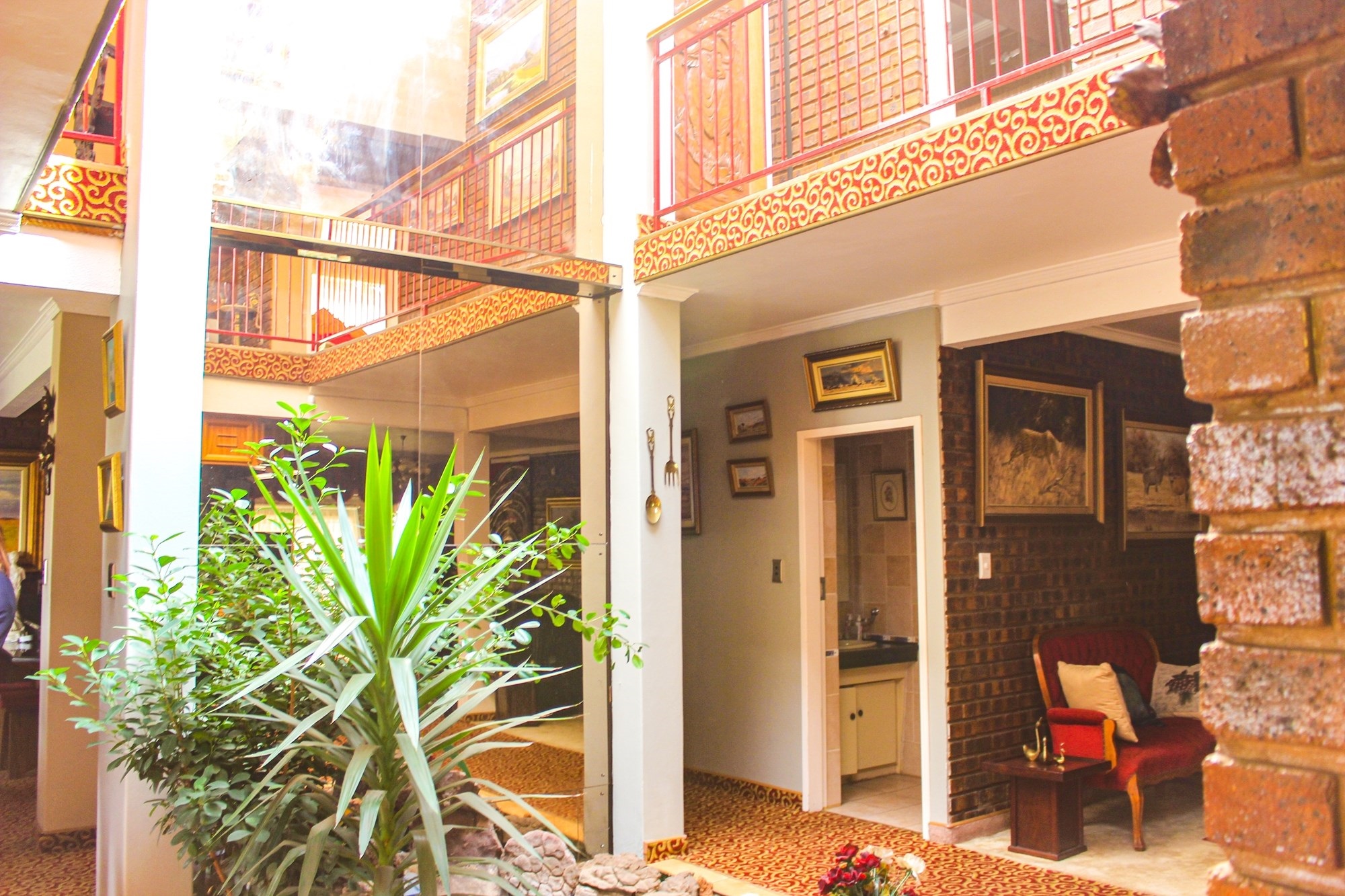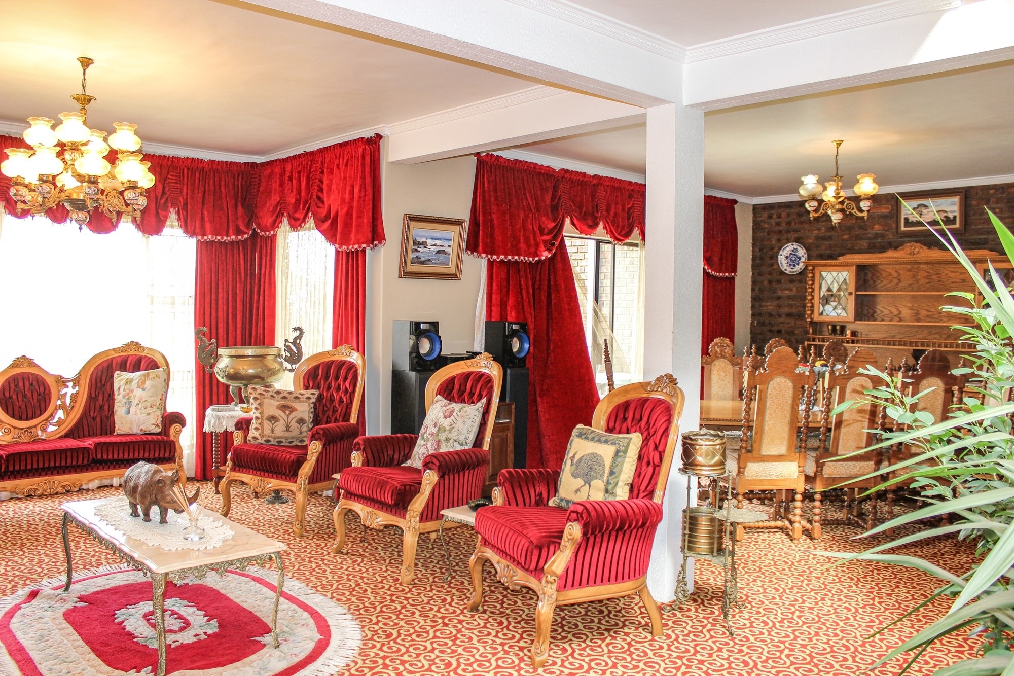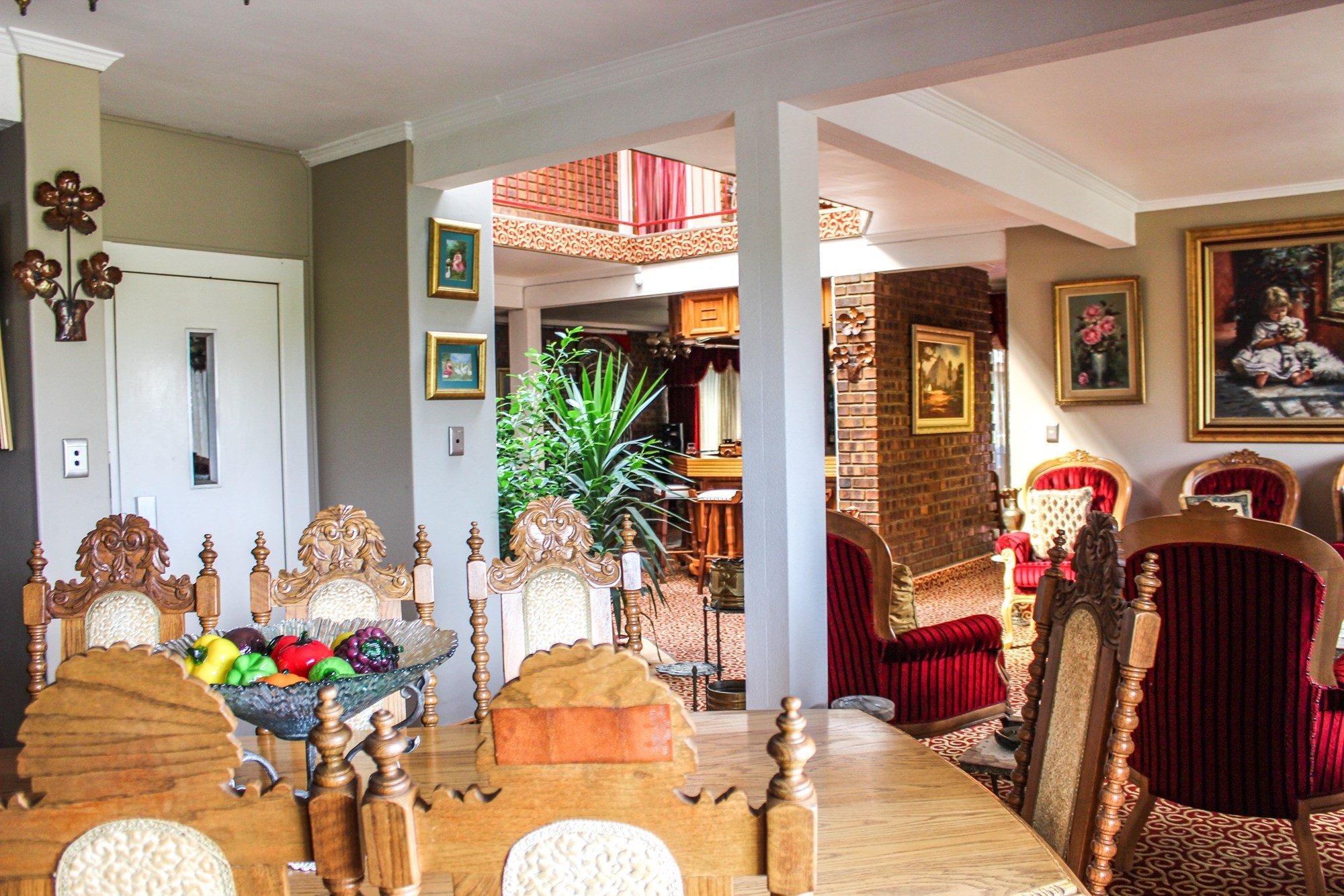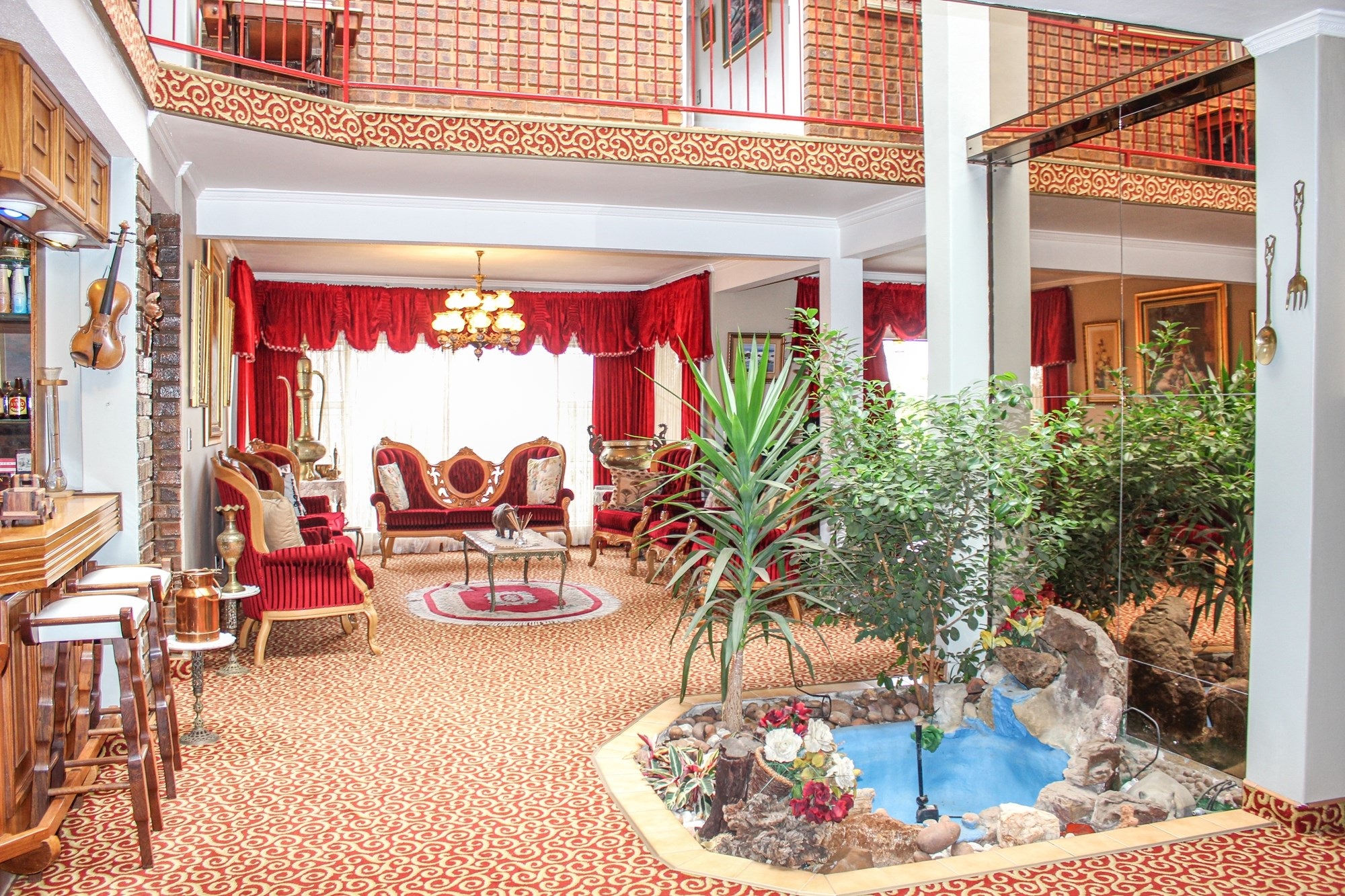 The heart of the home beats upstairs, where multiple living areas flow seamlessly. A formal lounge features a central indoor garden and fountain, while a cosy TV room with underfloor heating is ideal for relaxed evenings. Entertain in style in the elegant dining room, which opens to a balcony with built-in braai and panoramic views.