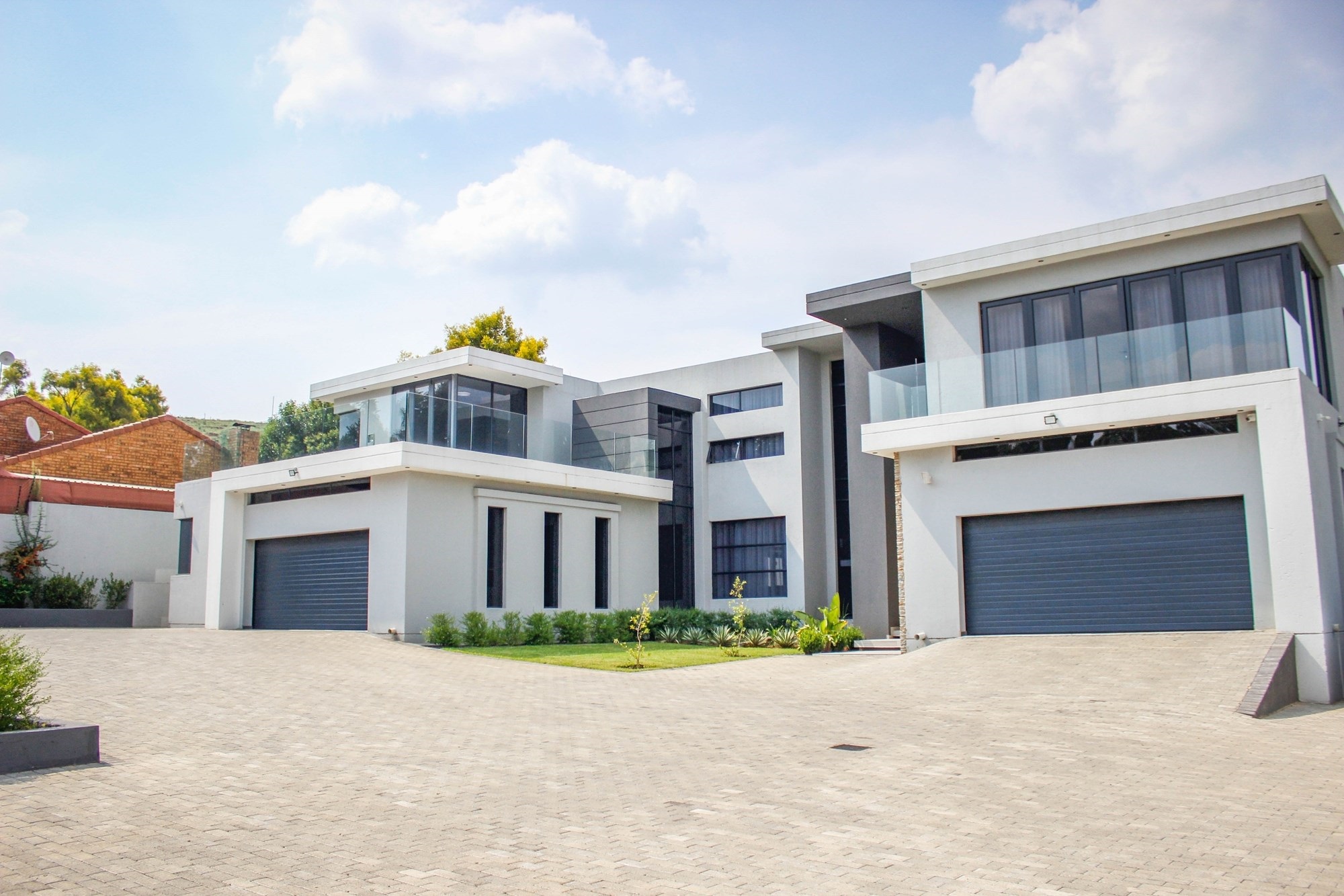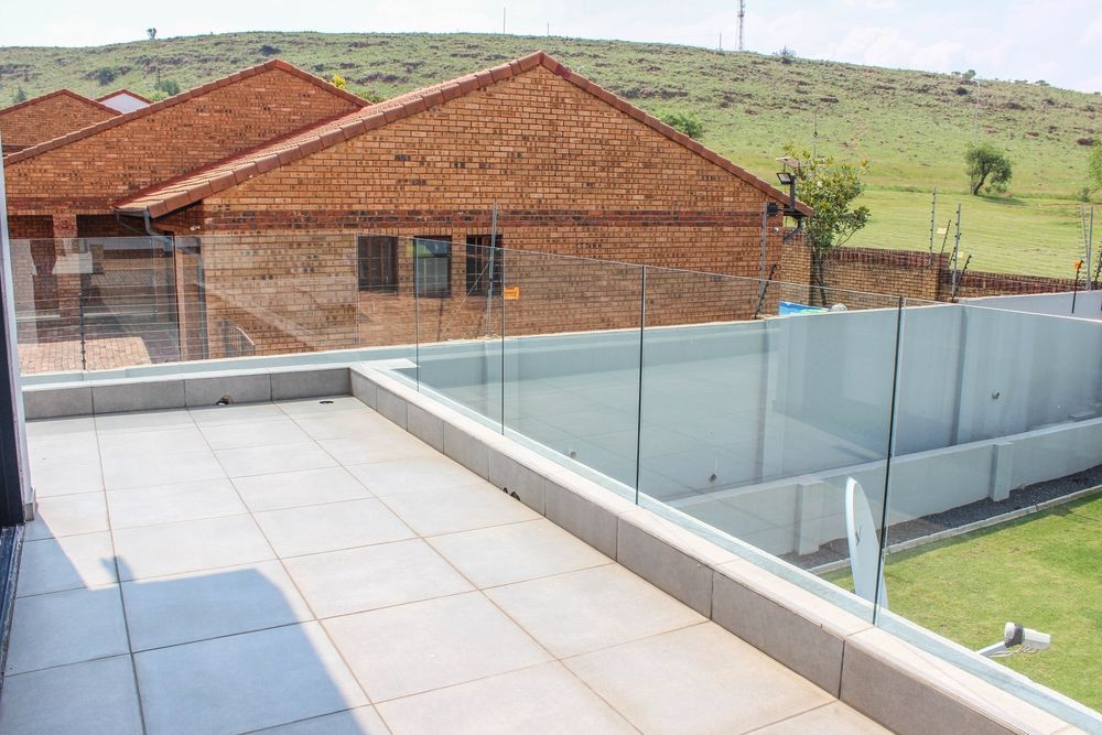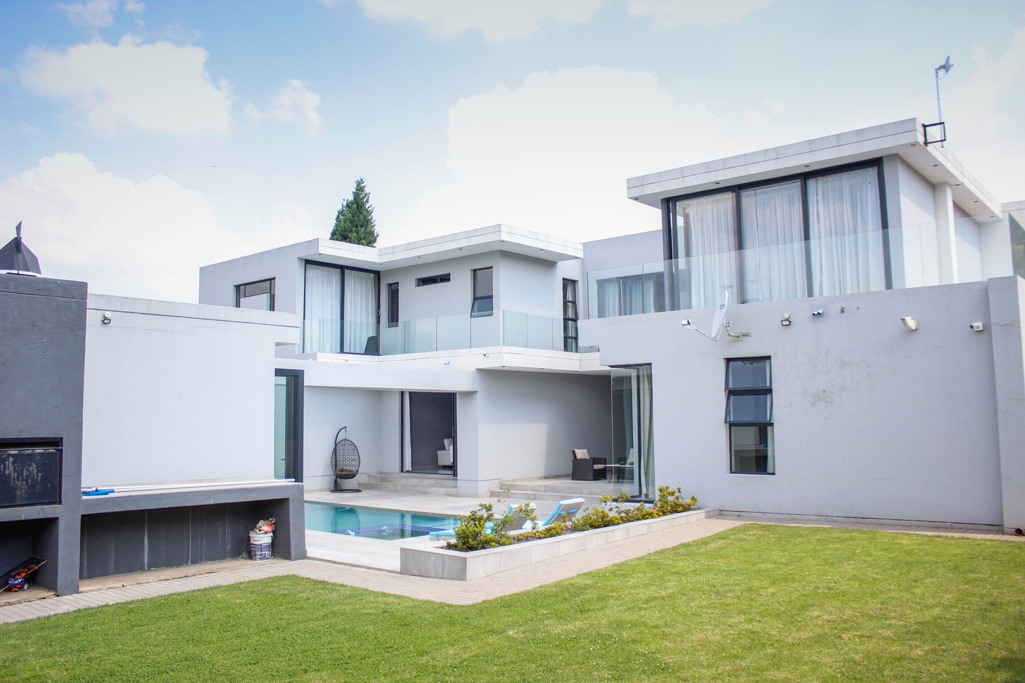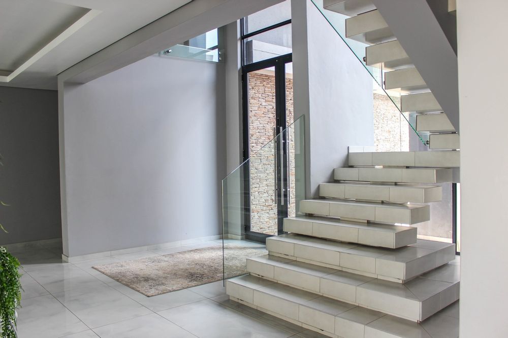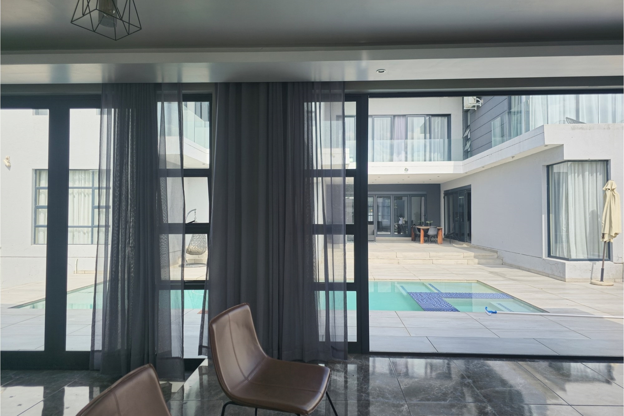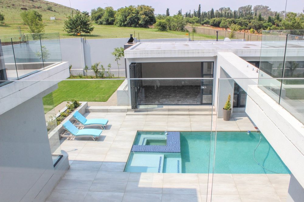 Additional features include a gym with balcony, potential sauna room, wine cellar, library, home office, and games room. Two double garages (fully tiled), staff quarters, two storage rooms, a water filtration and borehole system, Vacuflo system, and a state-of-the-art security setup ensure every convenience is at your fingertips.