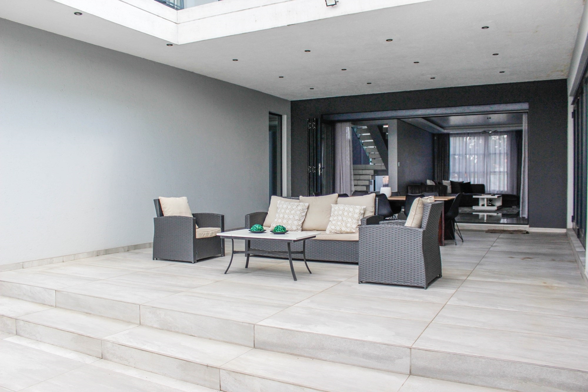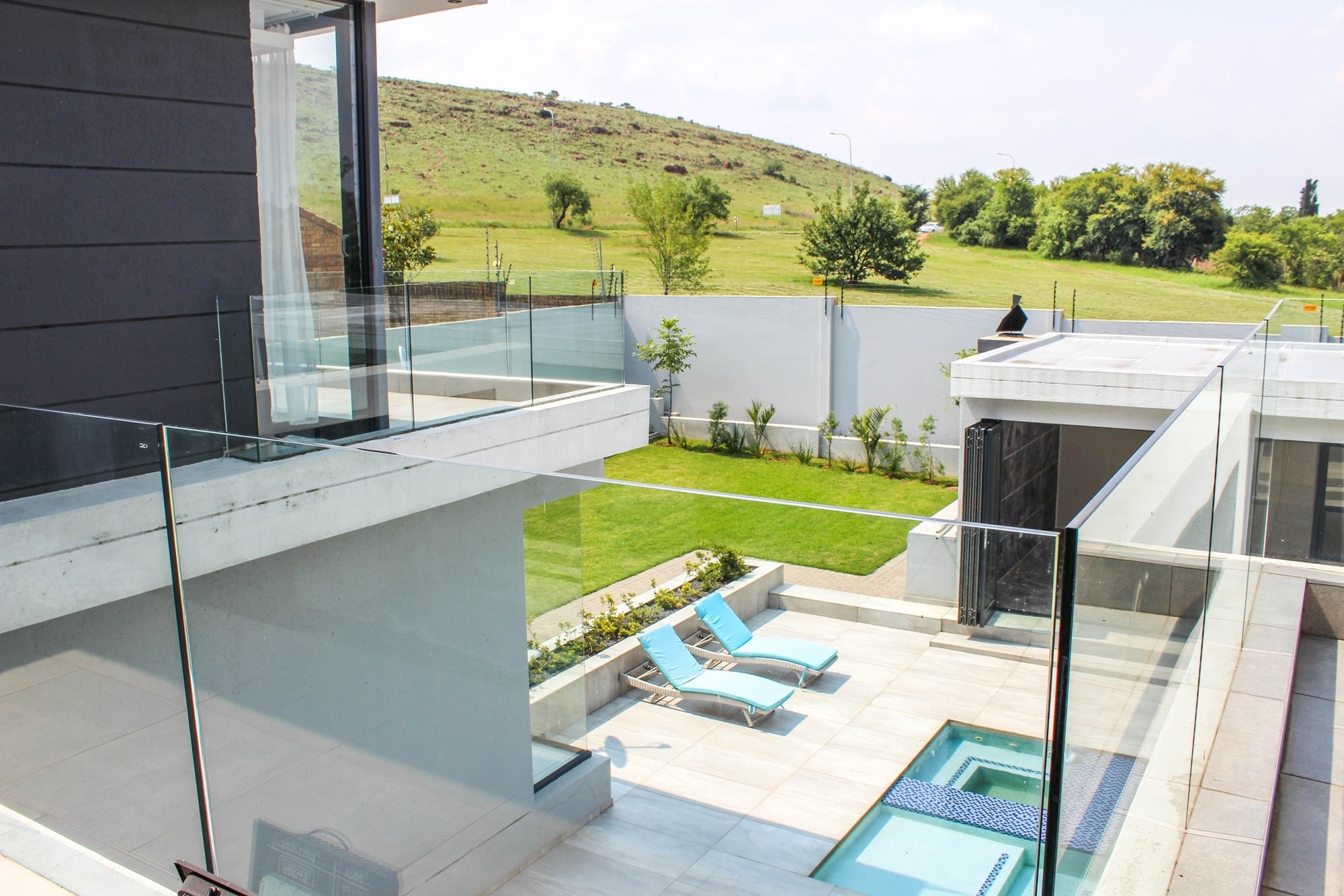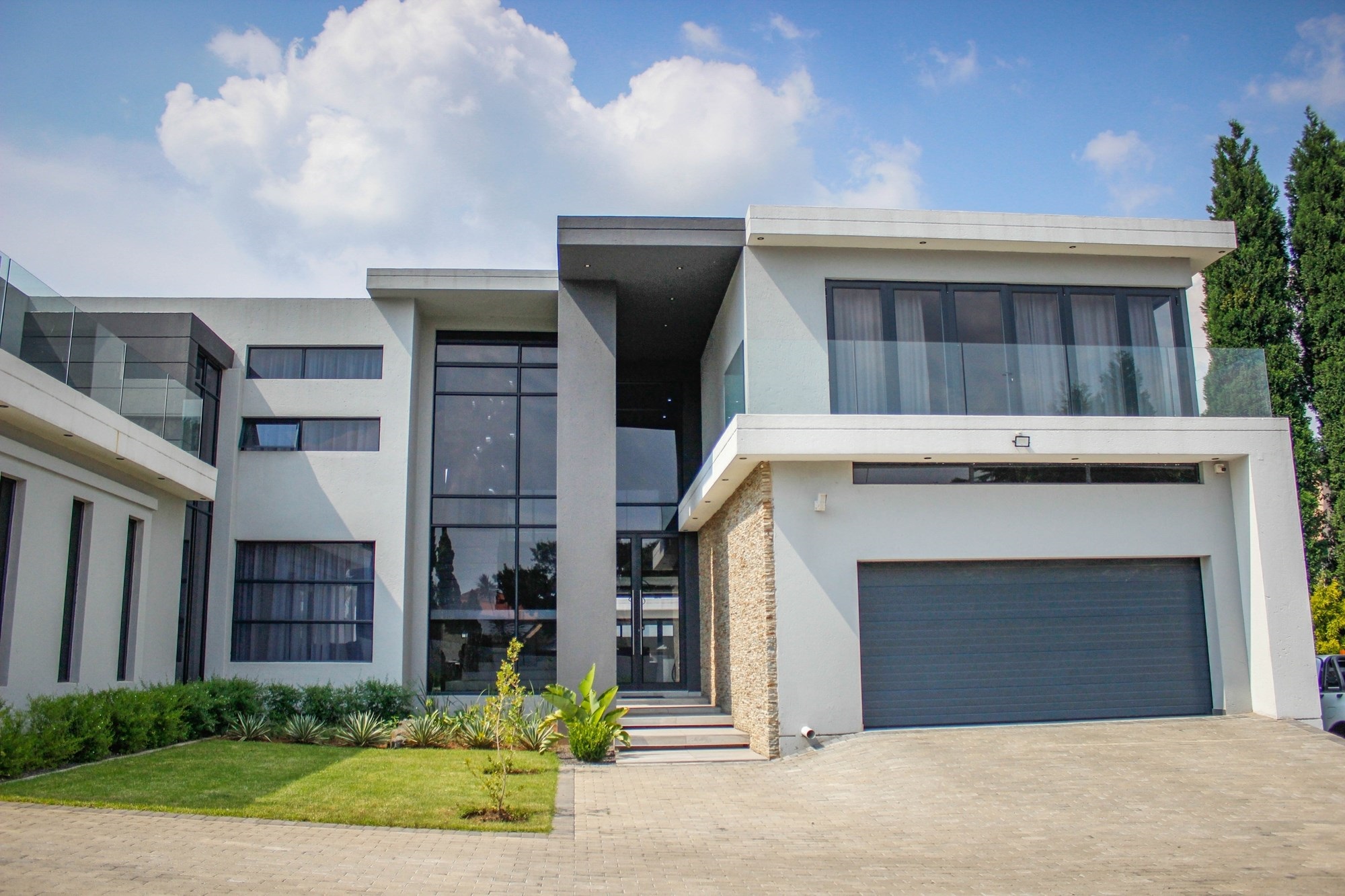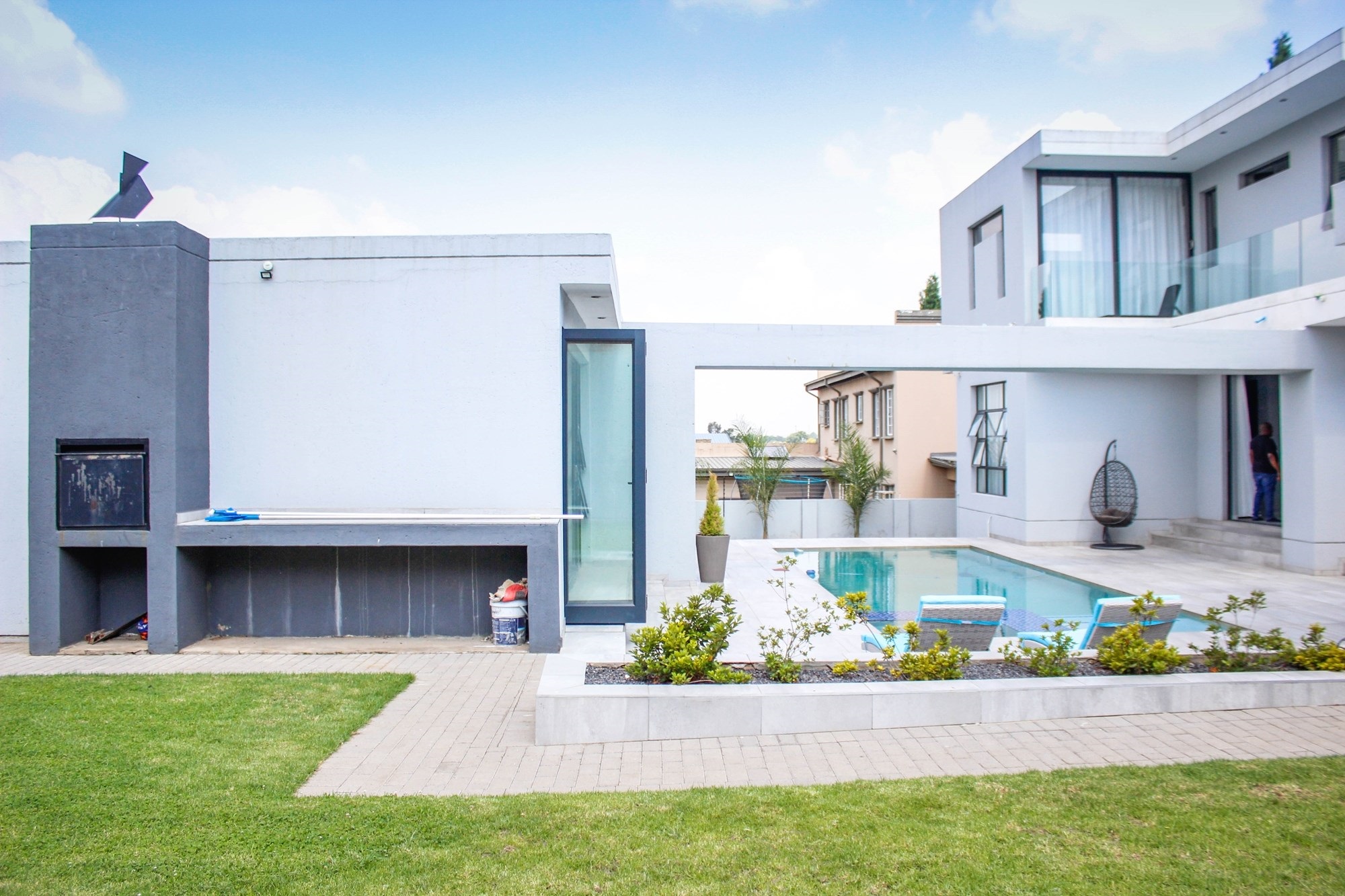 Additional features include a gym with balcony, potential sauna room, wine cellar, library, home office, and games room. Two double garages (fully tiled), staff quarters, two storage rooms, a water filtration and borehole system, Vacuflo system, and a state-of-the-art security setup ensure every convenience is at your fingertips.