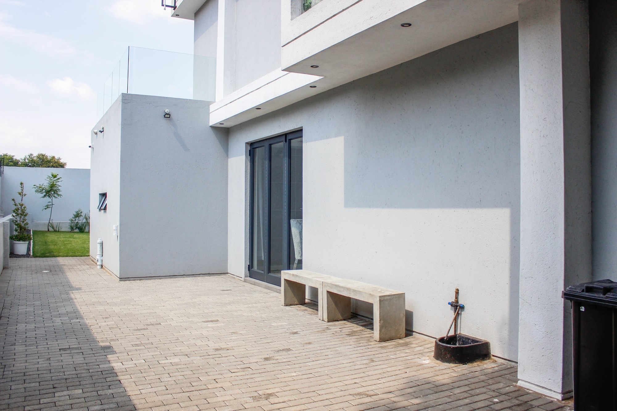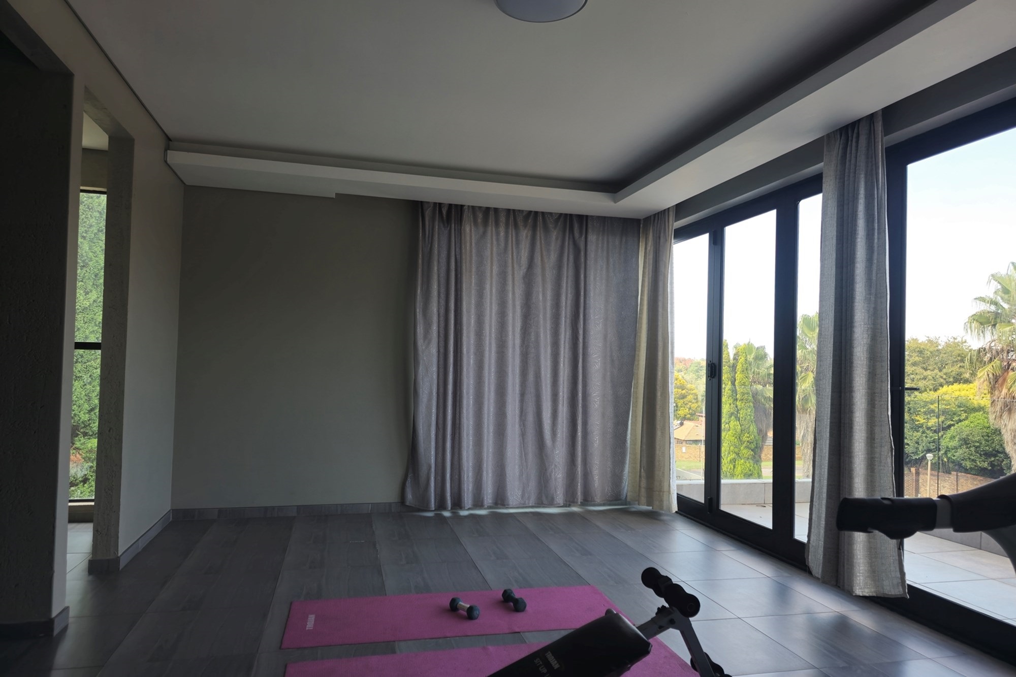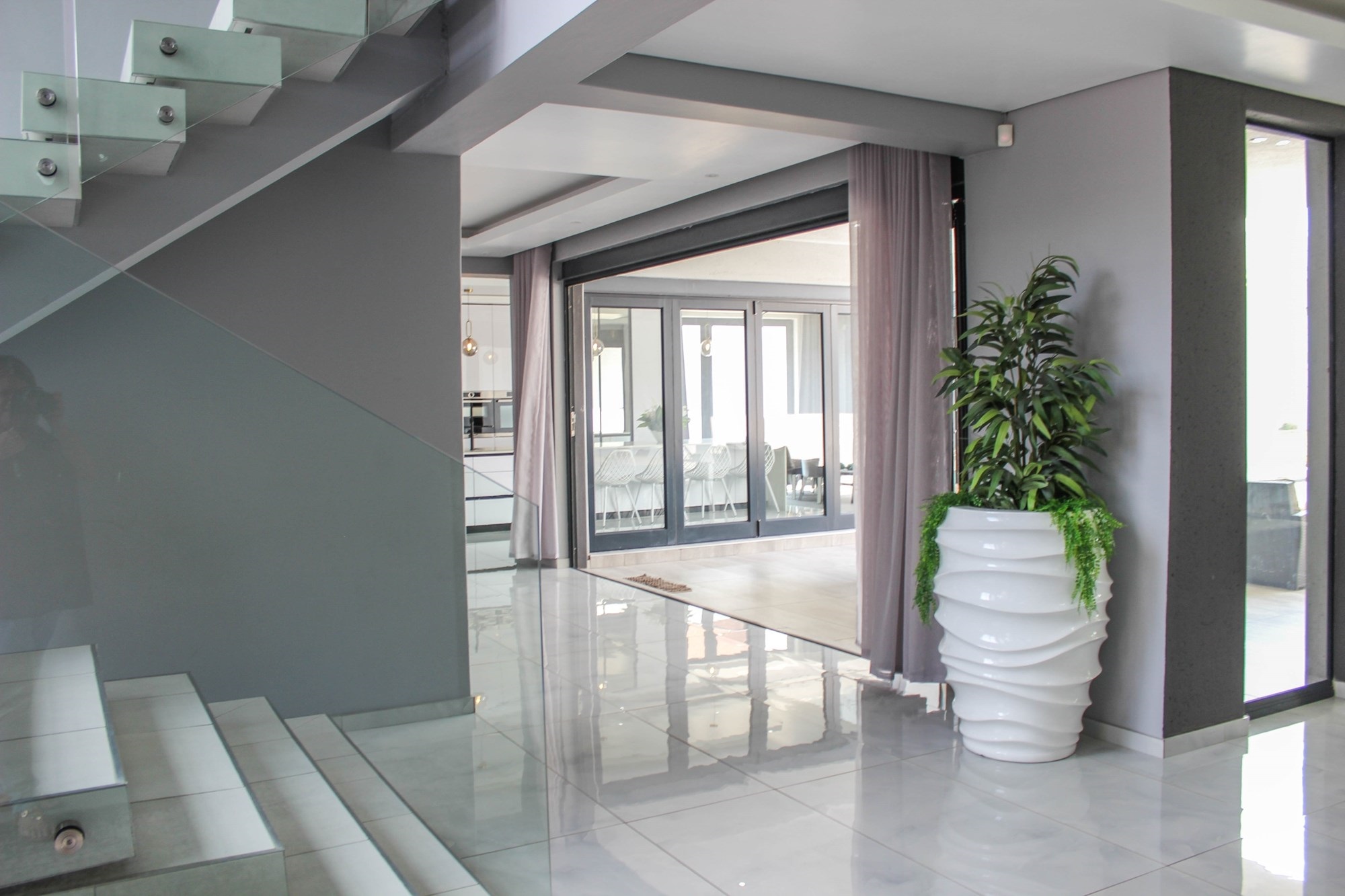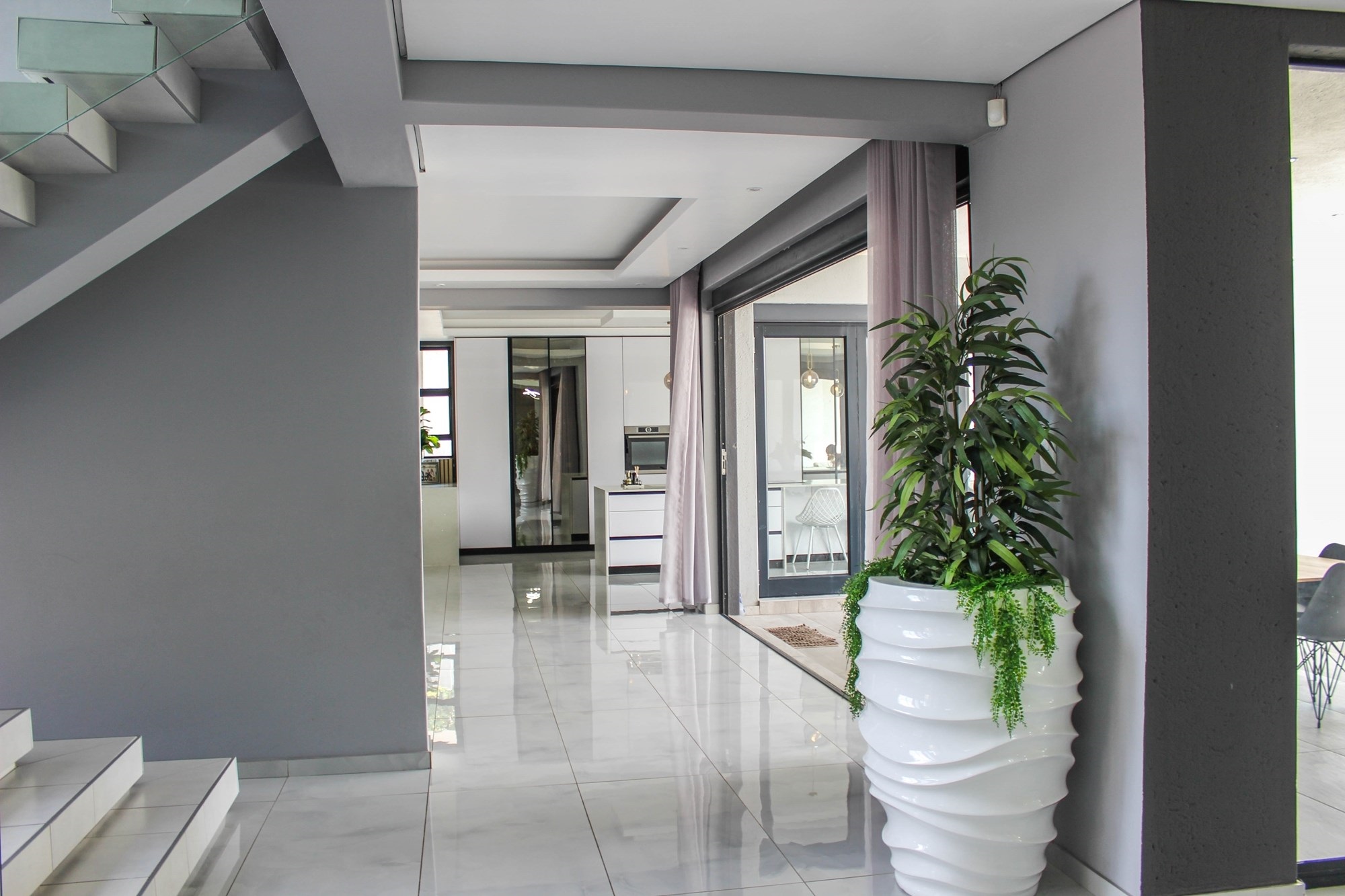 Additional features include a gym with balcony, potential sauna room, wine cellar, library, home office, and games room. Two double garages (fully tiled), staff quarters, two storage rooms, a water filtration and borehole system, Vacuflo system, and a state-of-the-art security setup ensure every convenience is at your fingertips.