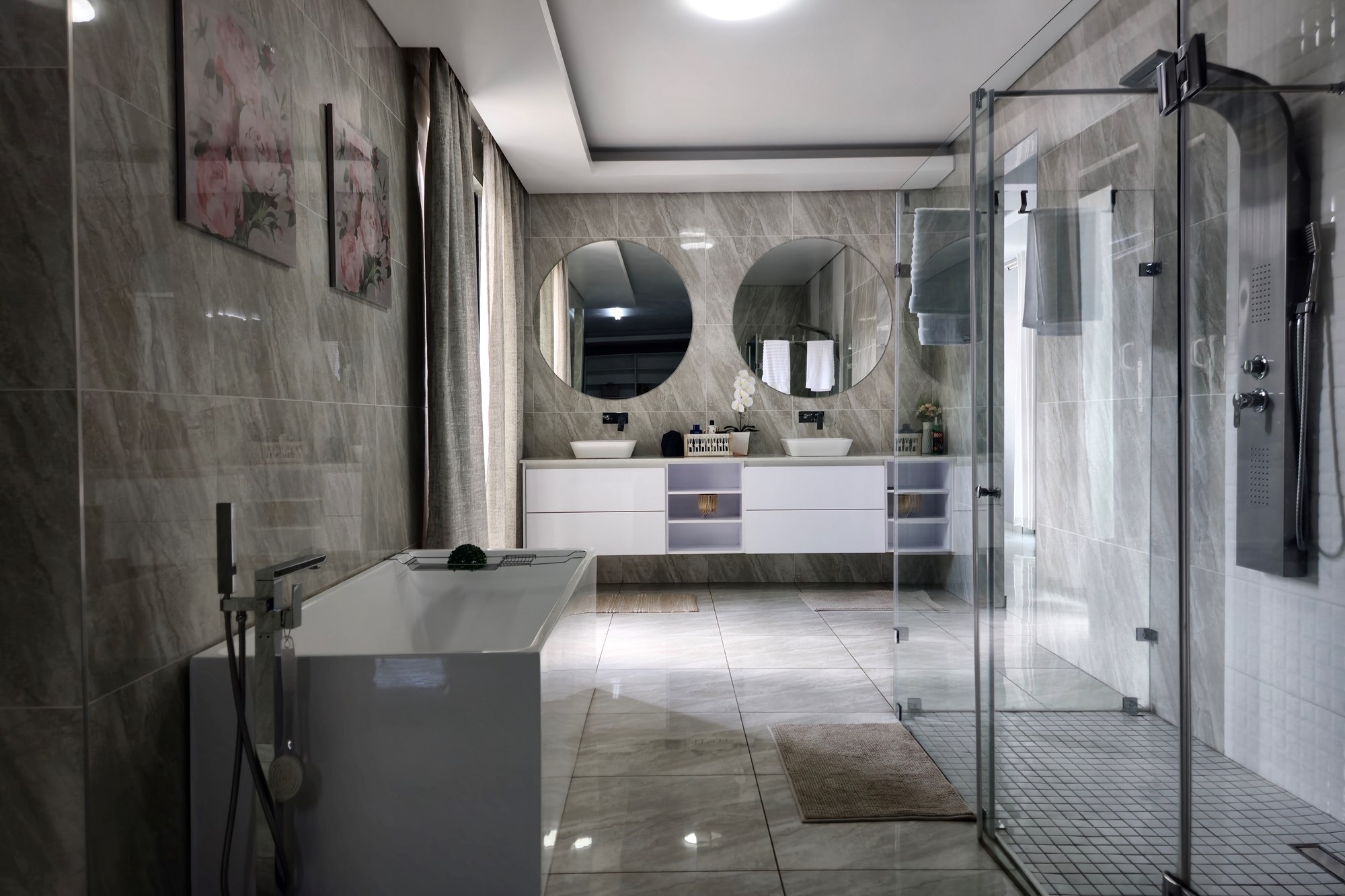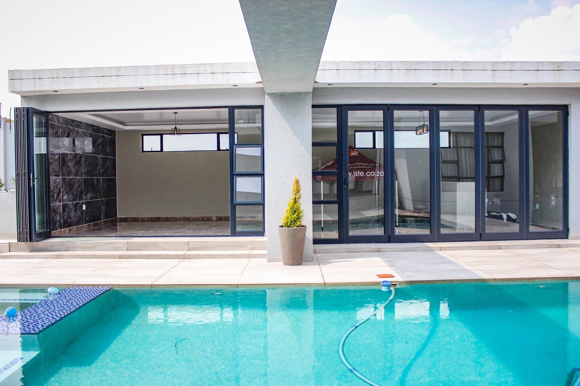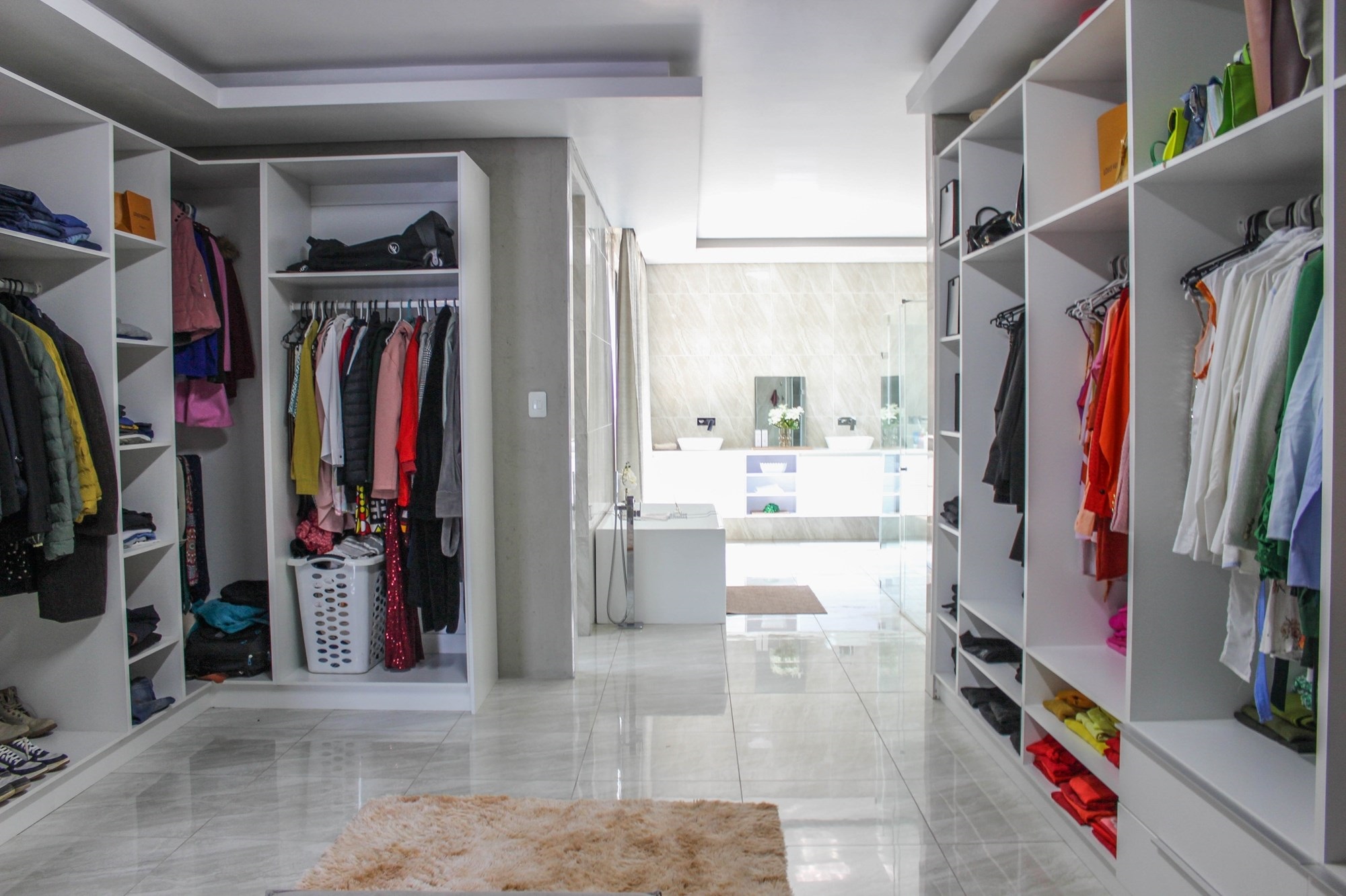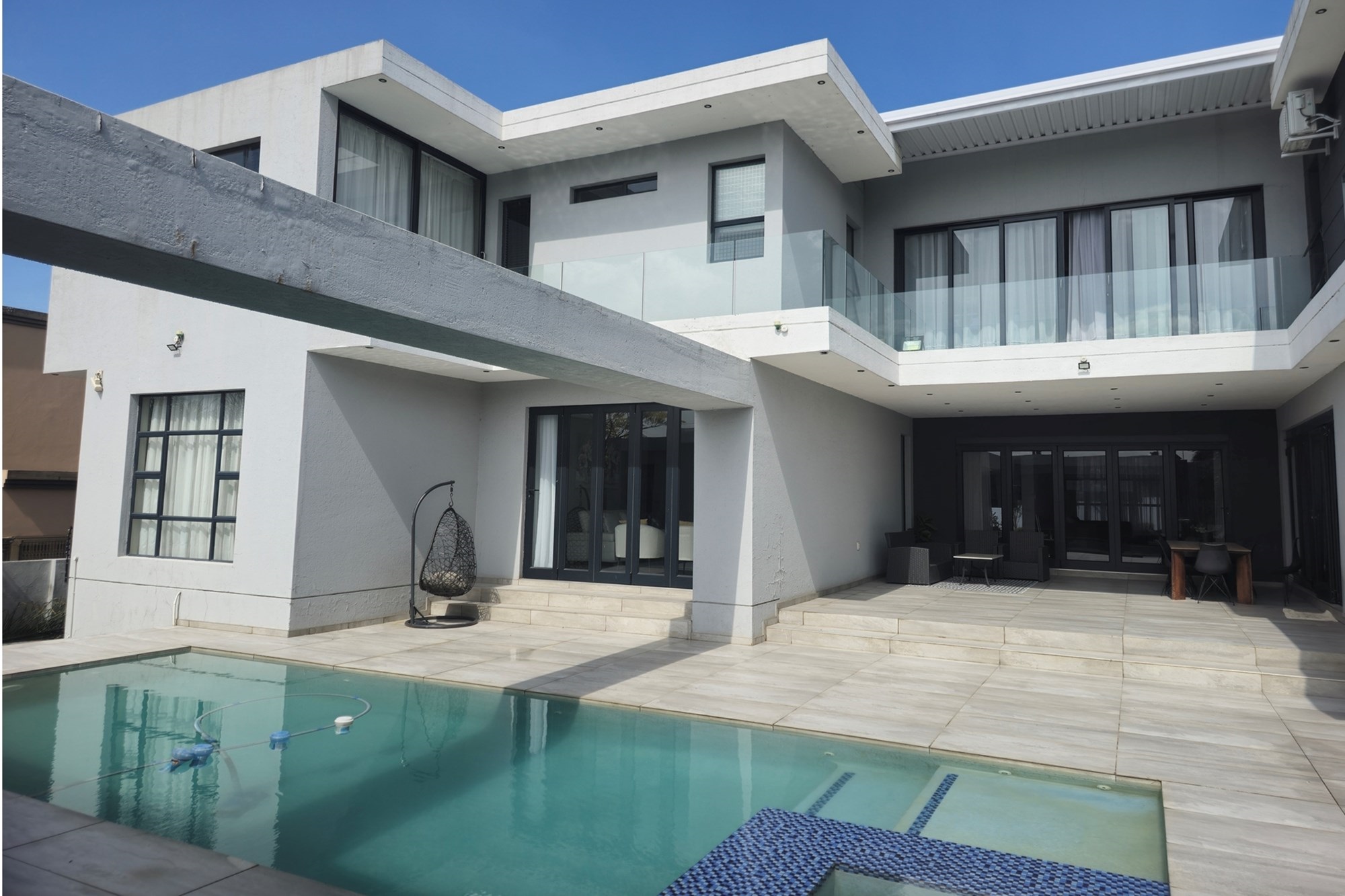 The home offers two stylish downstairs bedrooms, including a guest suite with an en-suite bathroom and poolside views. Upstairs, a pyjama lounge with balcony leads to four en-suite bedrooms. The master suite is a sanctuary, complete with balcony access, a spa-like bathroom with double jet showers, large bathtub, walk-in closet, and private pyjama lounge.