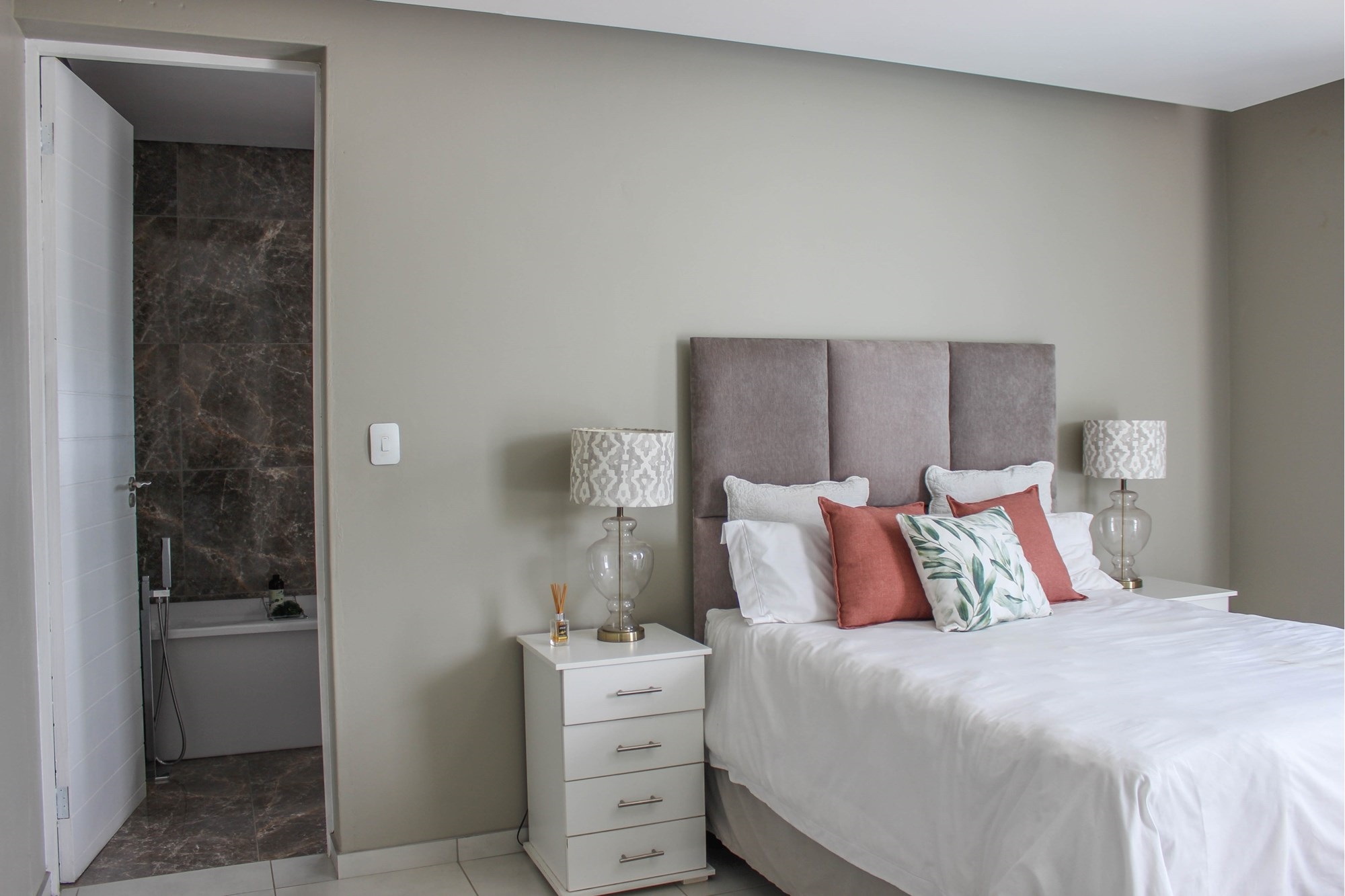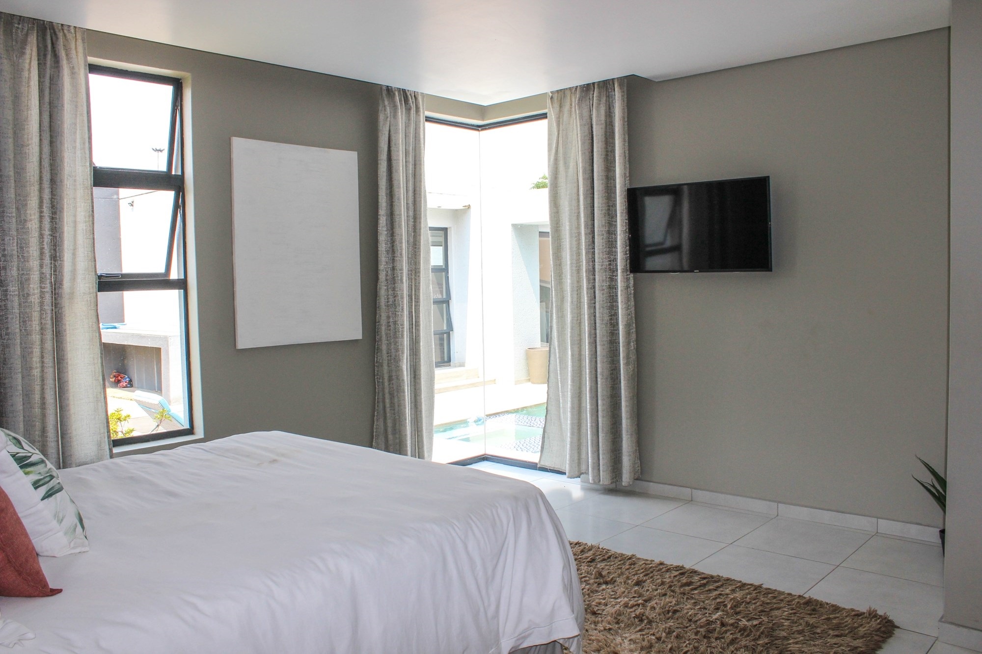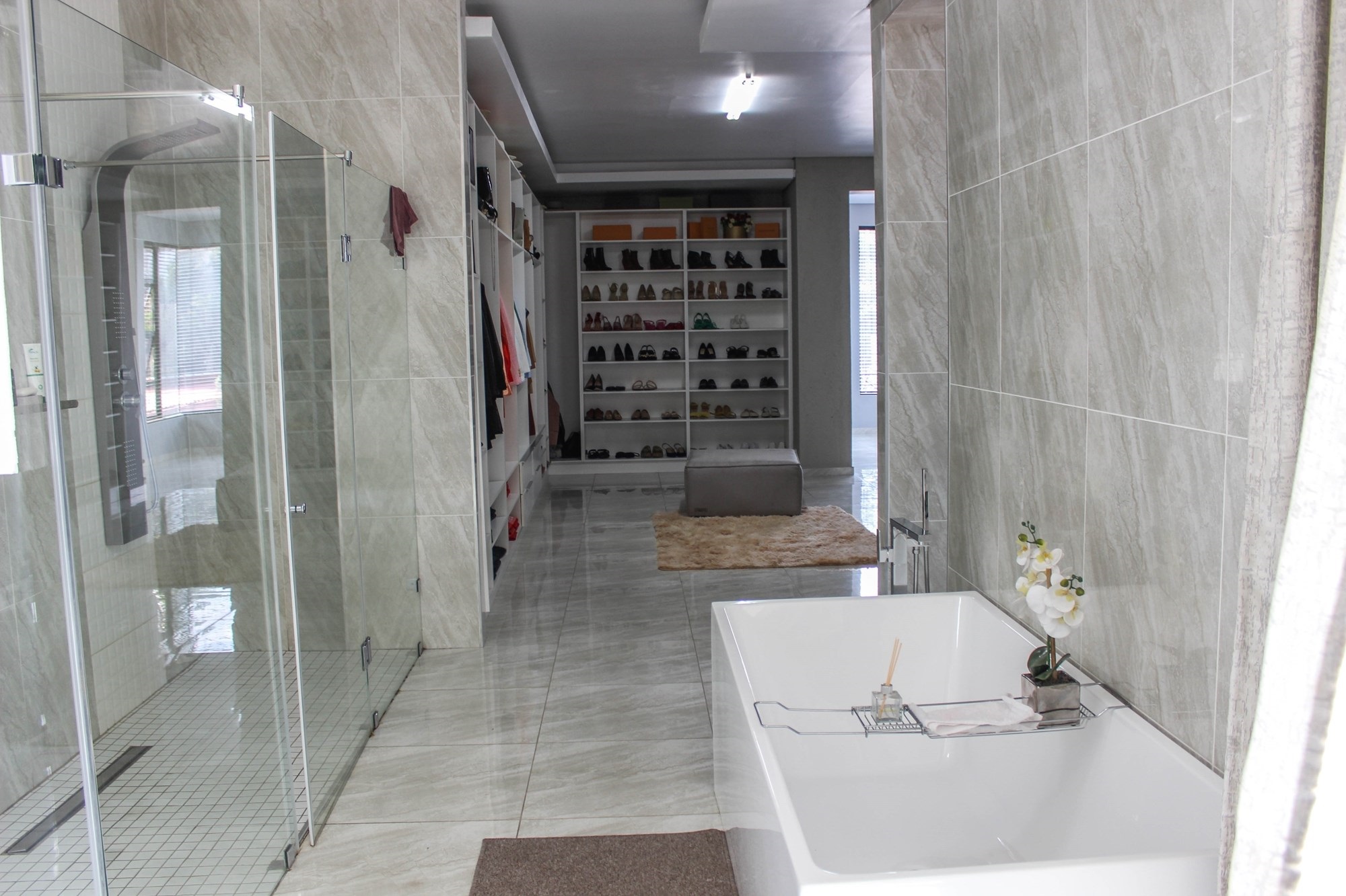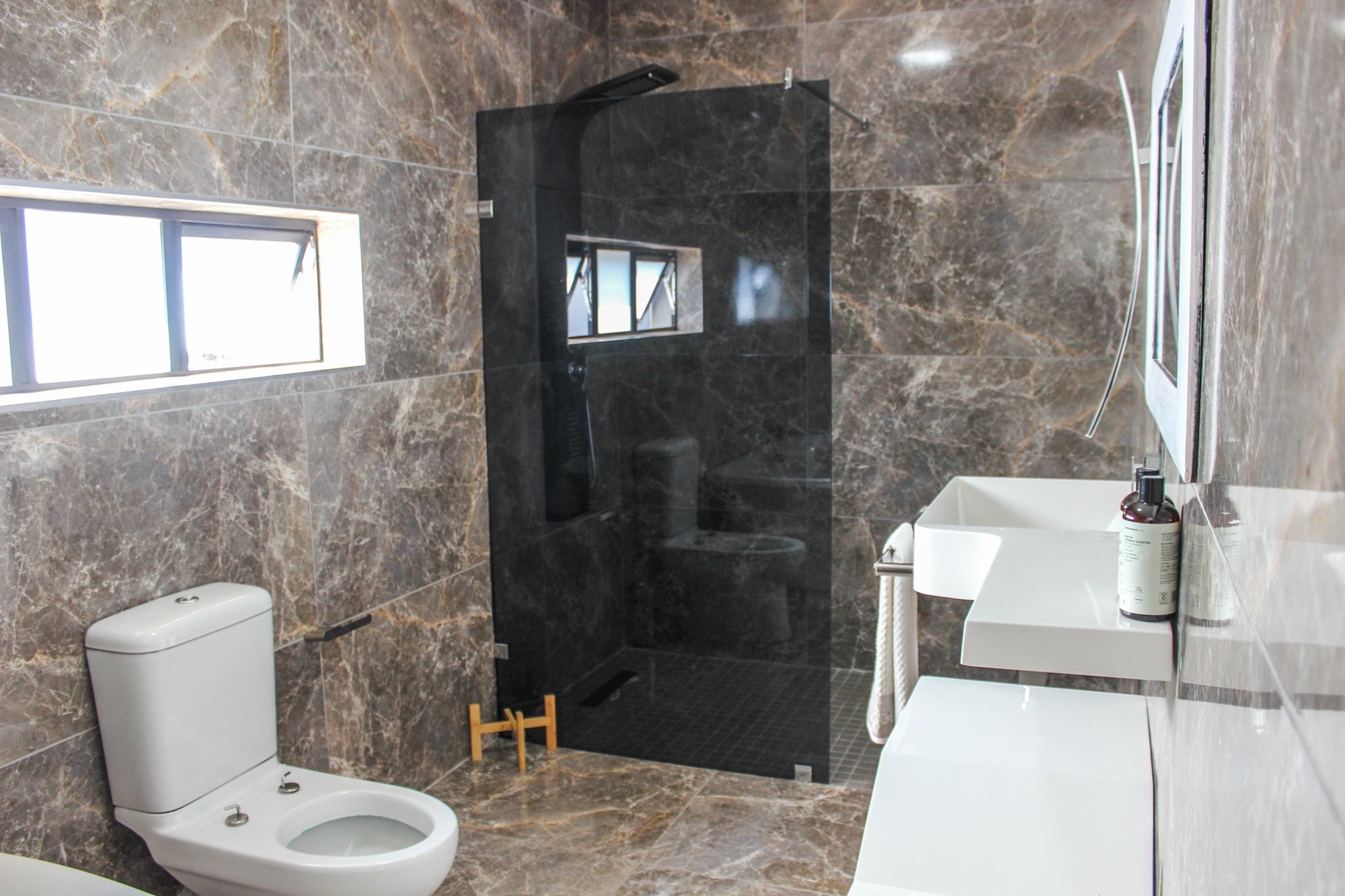 The home offers two stylish downstairs bedrooms, including a guest suite with an en-suite bathroom and poolside views. Upstairs, a pyjama lounge with balcony leads to four en-suite bedrooms. The master suite is a sanctuary, complete with balcony access, a spa-like bathroom with double jet showers, large bathtub, walk-in closet, and private pyjama lounge.