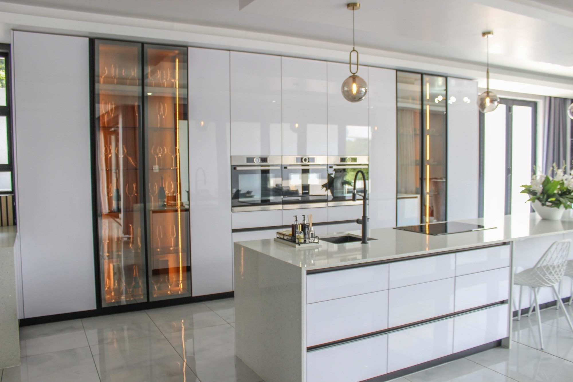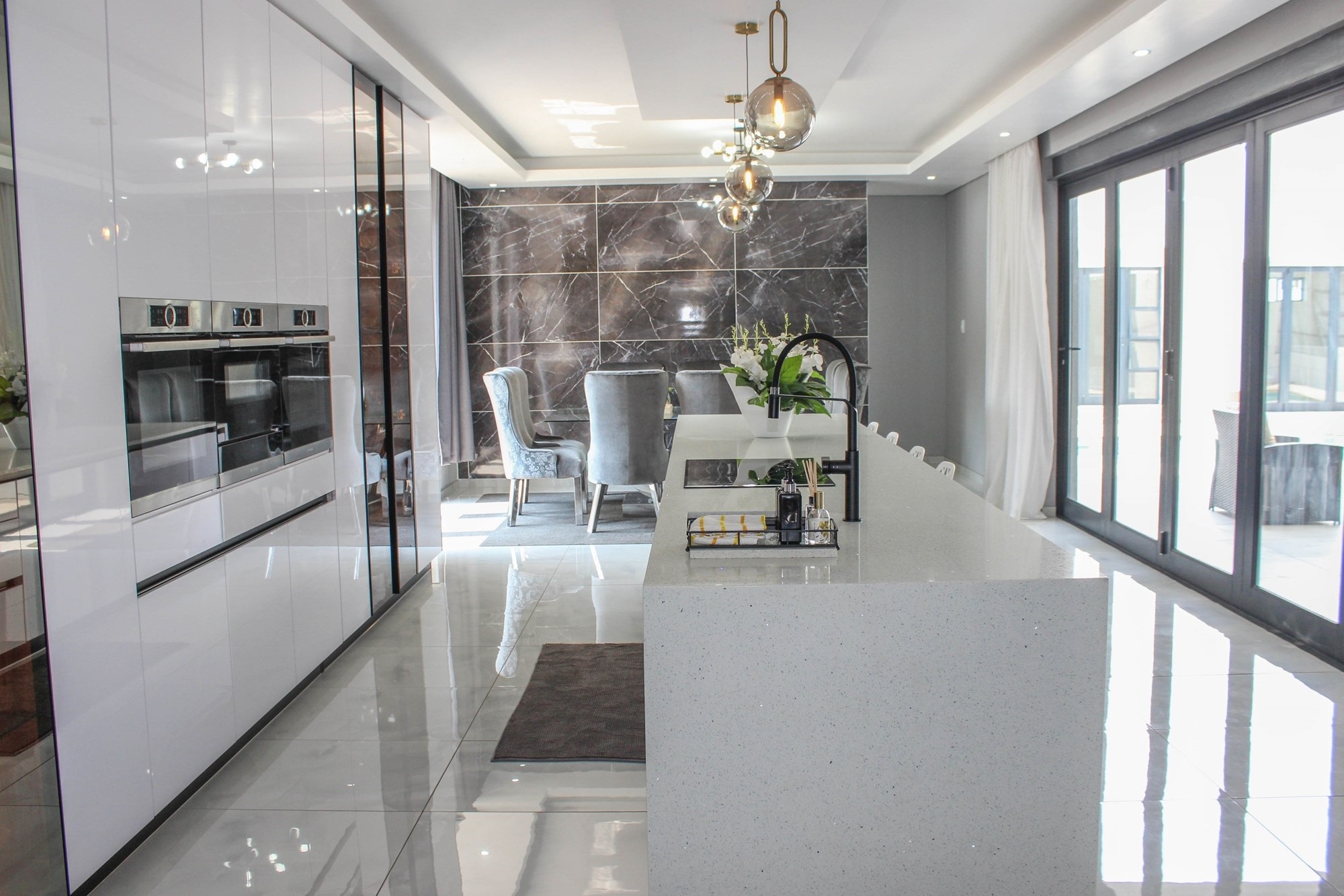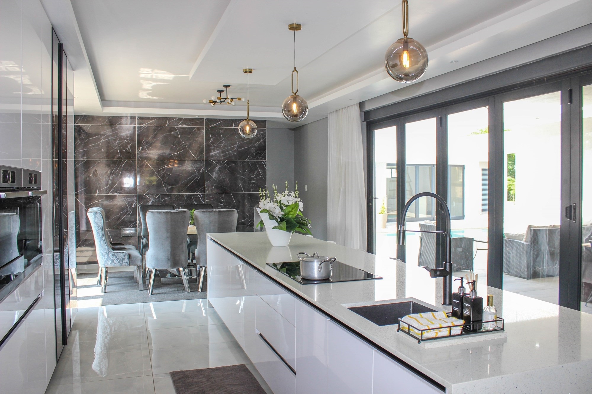 The gourmet kitchen is the heart of the home, boasting a long centre island, built-in appliances, tinted glass display cabinetry, and a separate scullery and laundry with outdoor access. This space opens to the dining area and covered patio overlooking a sparkling pool — ideal for effortless entertaining.