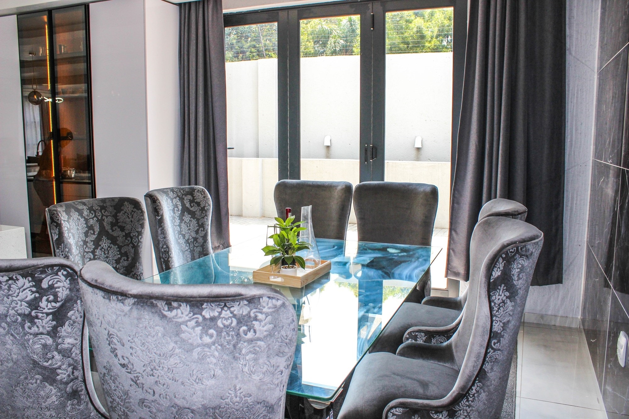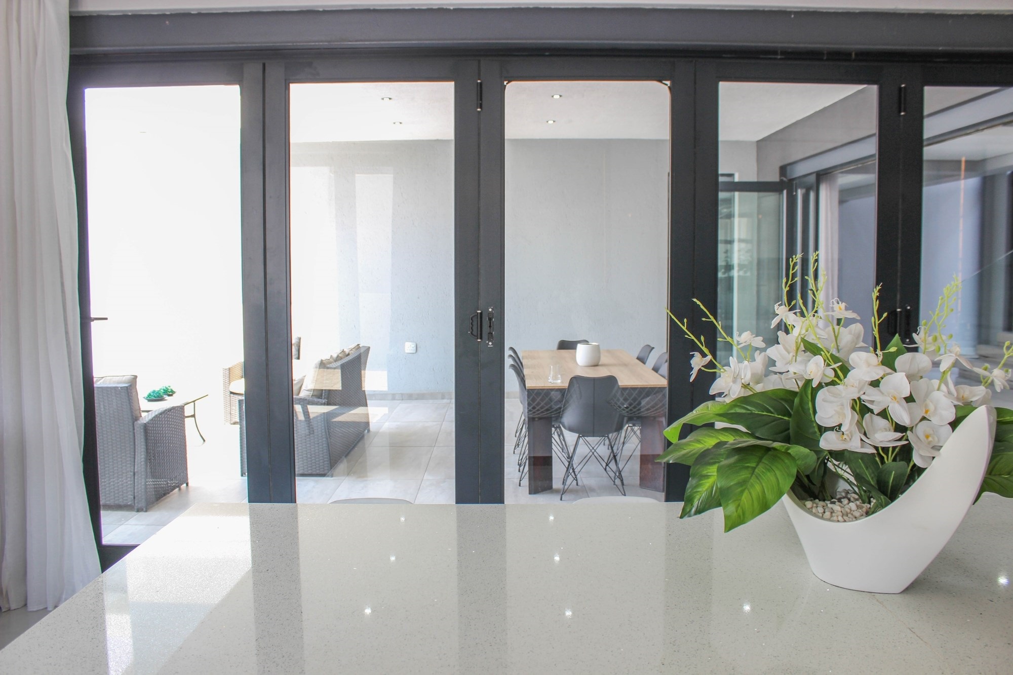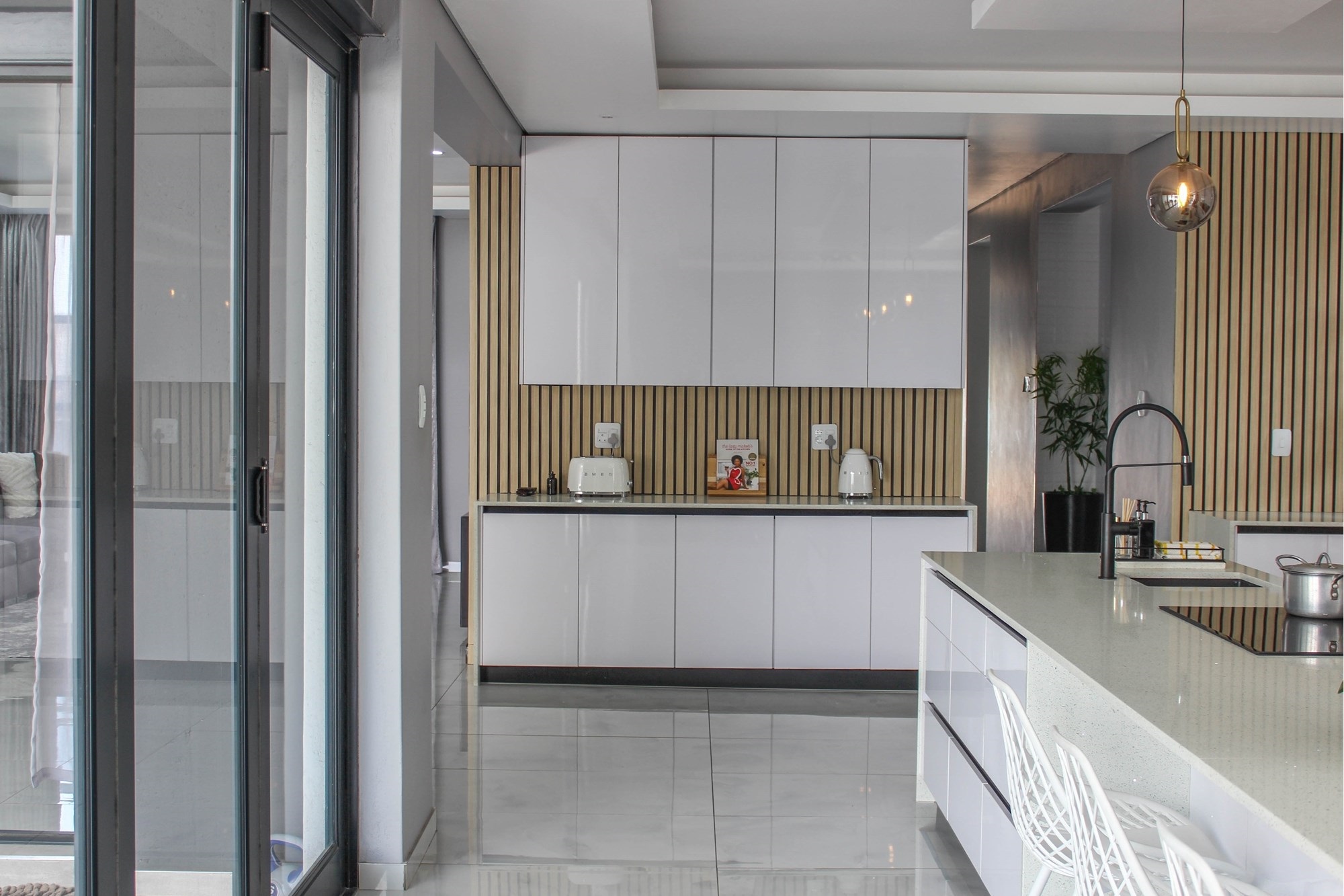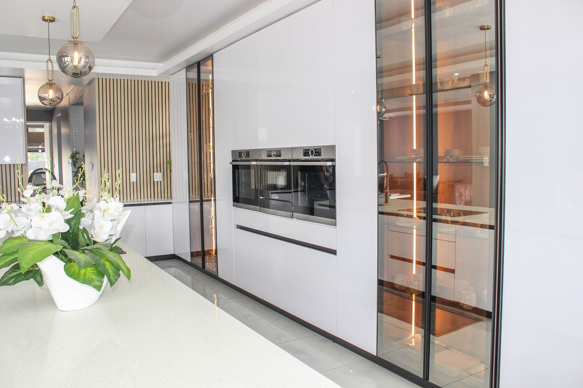 The gourmet kitchen is the heart of the home, boasting a long centre island, built-in appliances, tinted glass display cabinetry, and a separate scullery and laundry with outdoor access. This space opens to the dining area and covered patio overlooking a sparkling pool — ideal for effortless entertaining.
