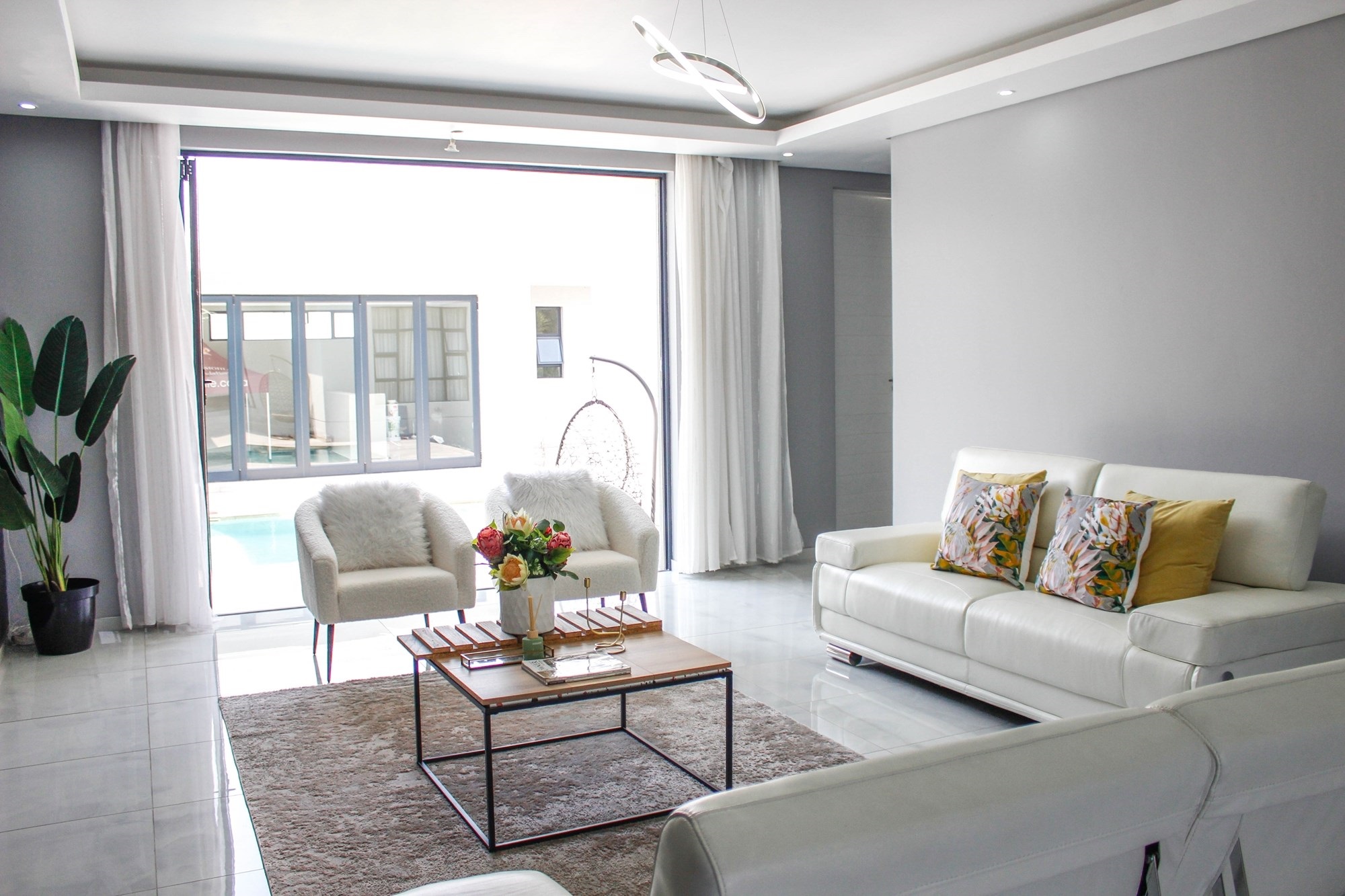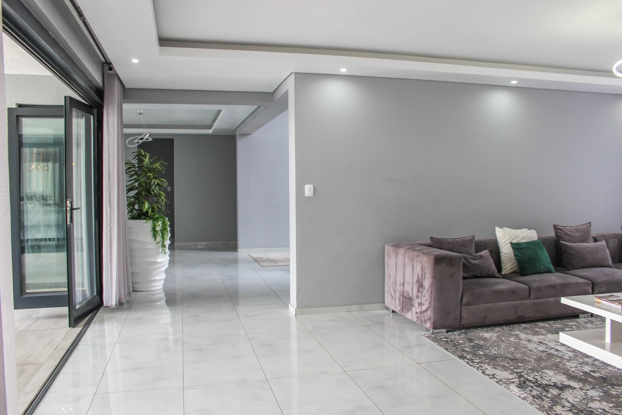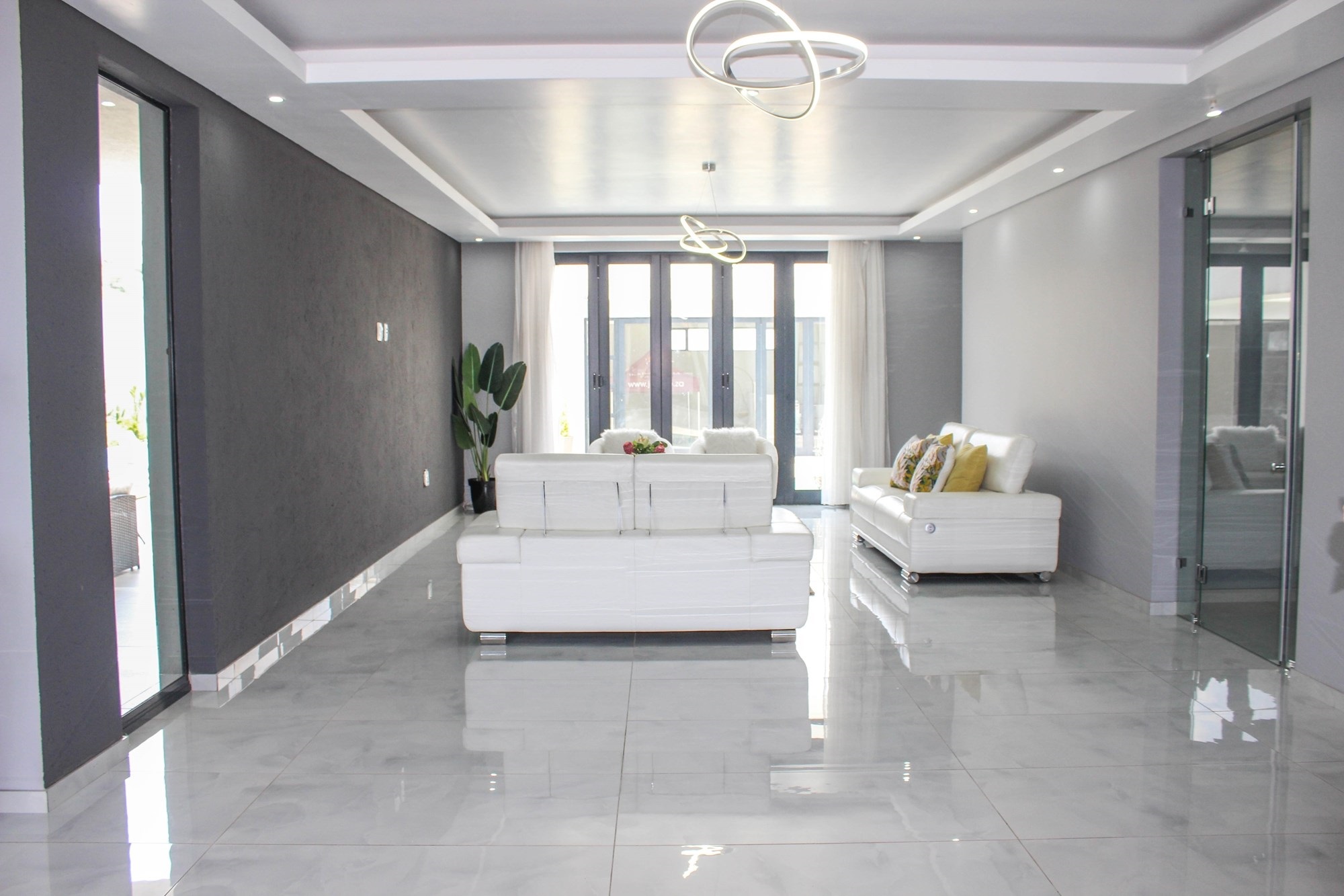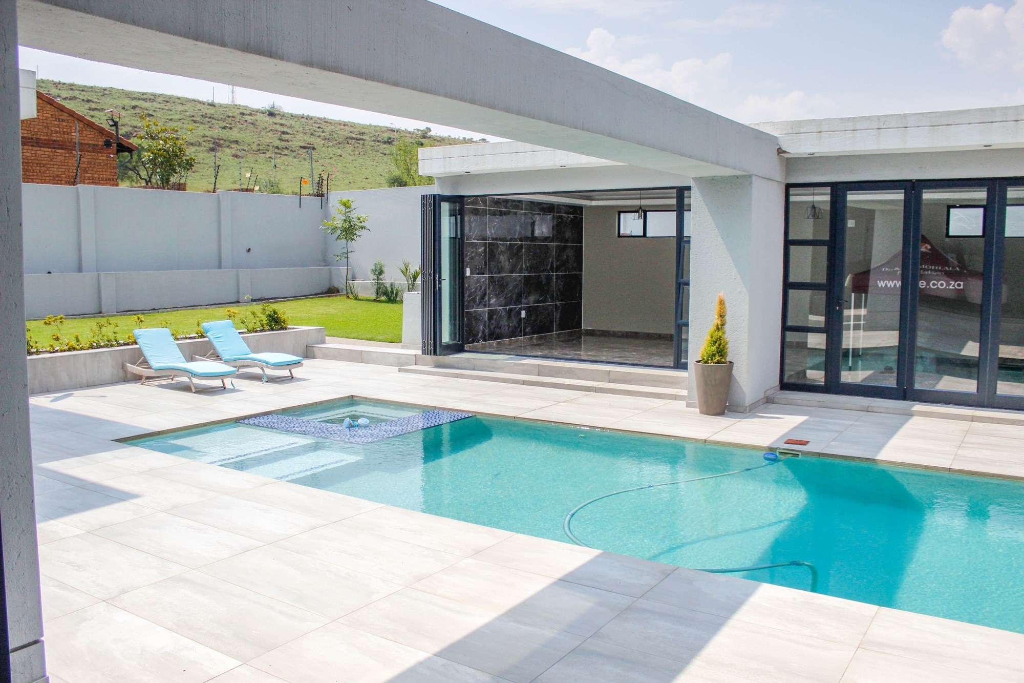 Through grand double doors, you`re greeted by a home that effortlessly blends sophistication with comfort. The open-plan living area features two lounges with stacking doors that create seamless indoor-outdoor flow. A partially completed cinema room promises cozy movie nights for the whole family.