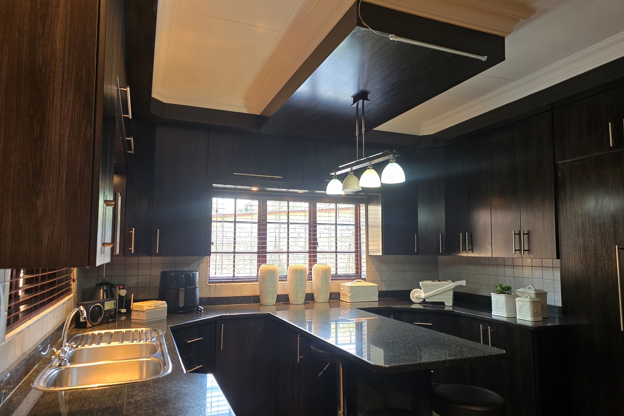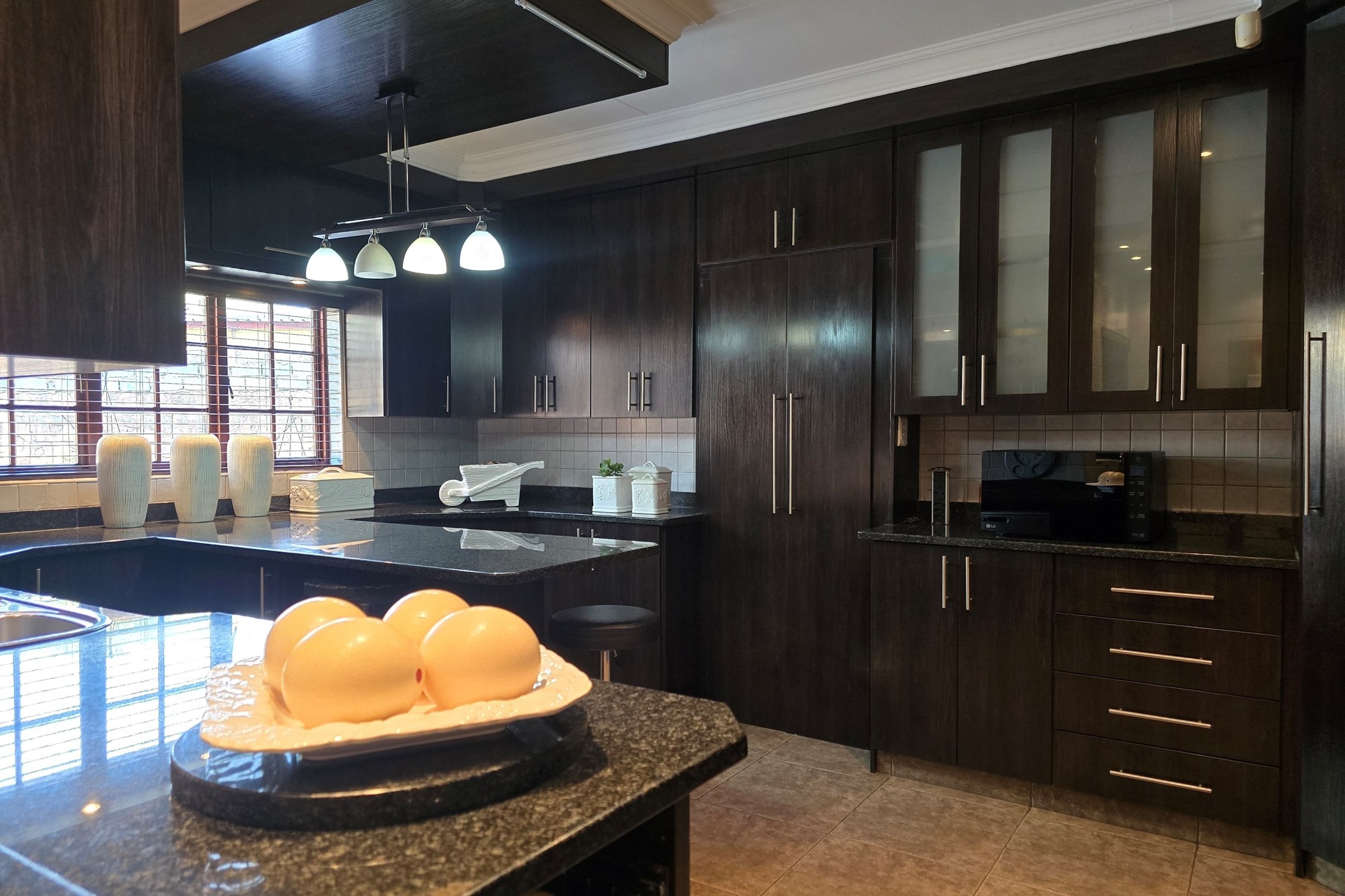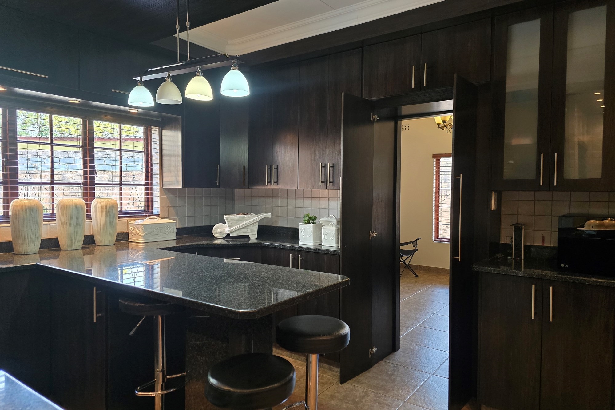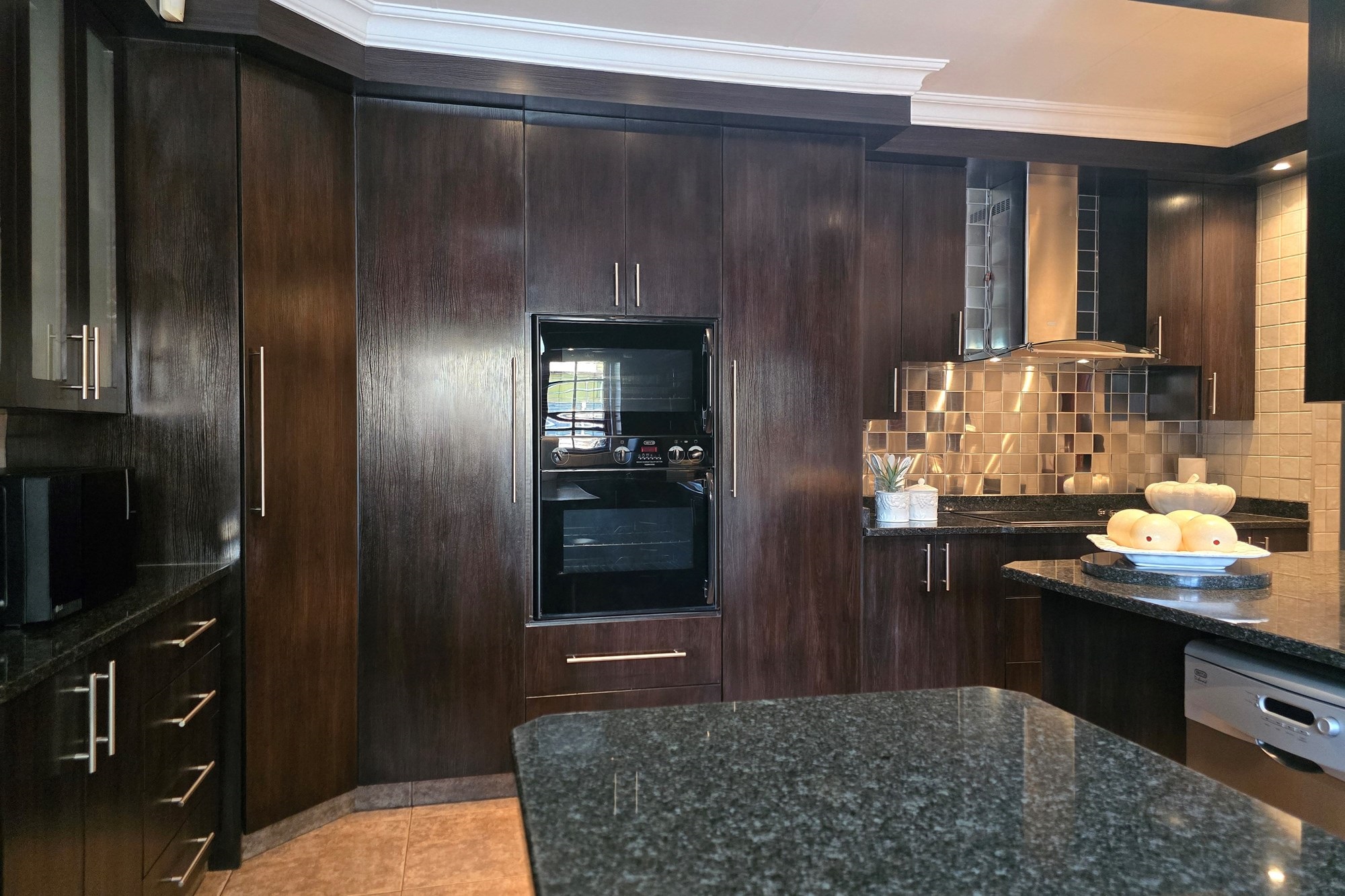 The dining room is cleverly tucked behind doors adjacent to the kitchen, creating an open yet intimate setting. The kitchen is a chef’s delight, featuring dark wood cupboards, granite countertops, a breakfast nook, double eye-level oven, glass top hob with extractor fan, prep bowl, and double basin – plus ample space for your appliances.