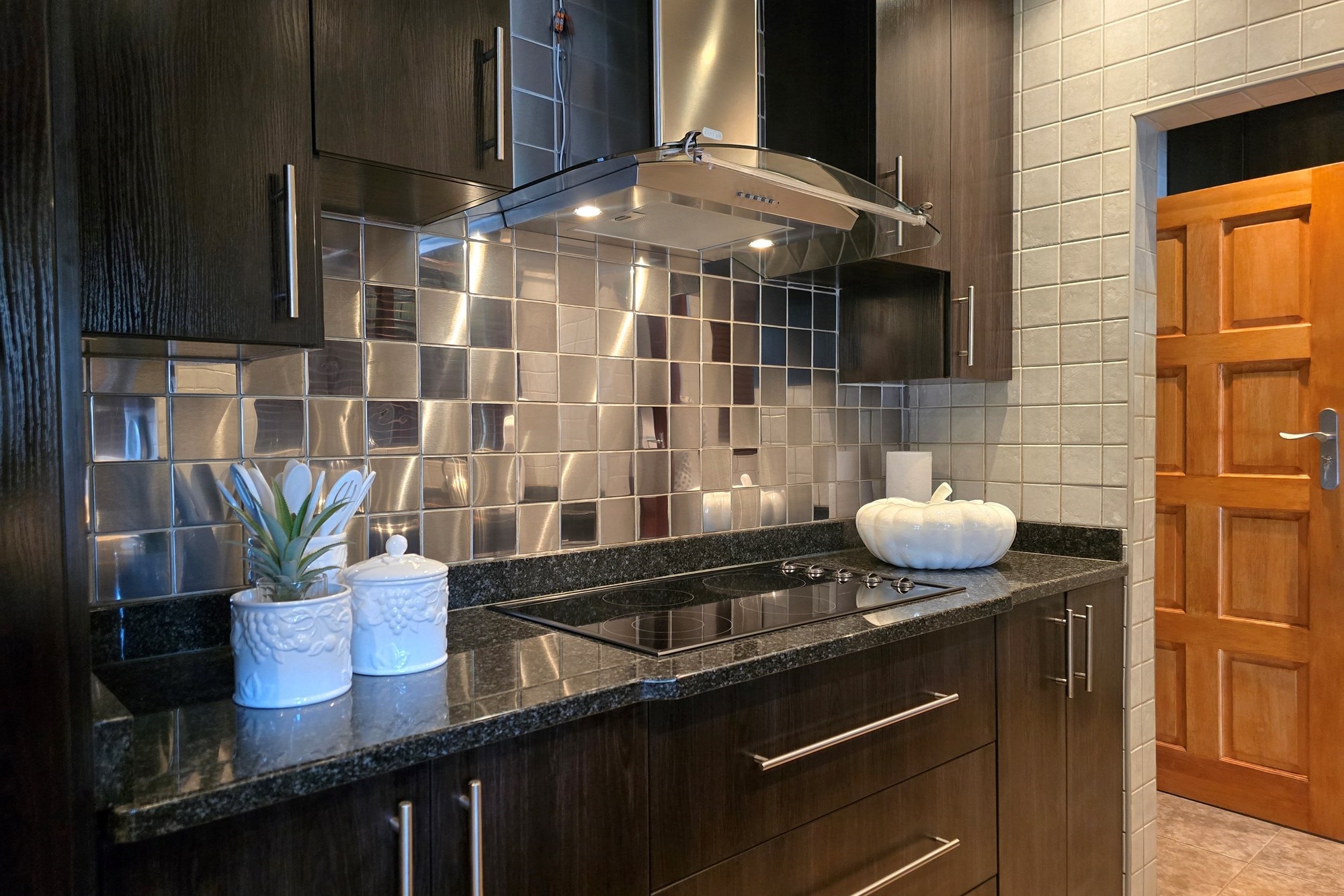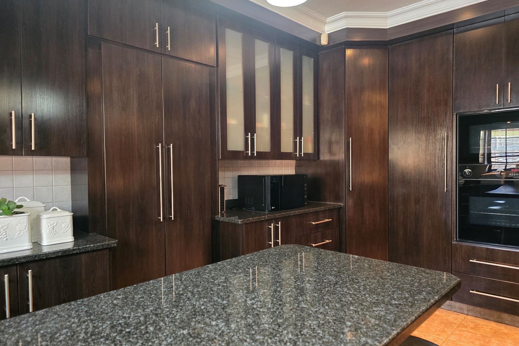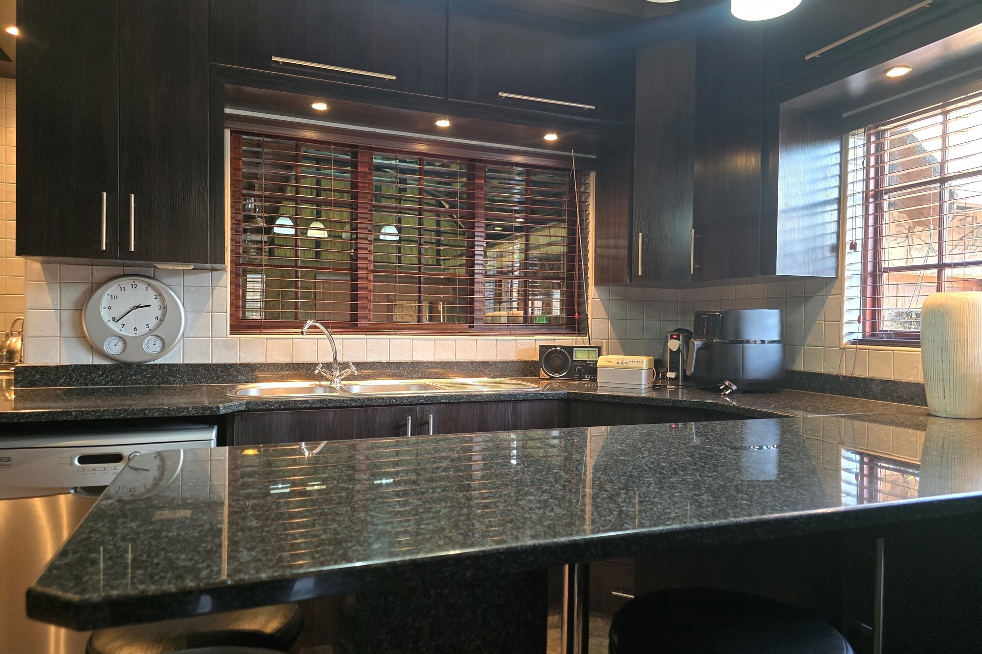 The dining room is cleverly tucked behind doors adjacent to the kitchen, creating an open yet intimate setting. The kitchen is a chef’s delight, featuring dark wood cupboards, granite countertops, a breakfast nook, double eye-level oven, glass top hob with extractor fan, prep bowl, and double basin – plus ample space for your appliances.