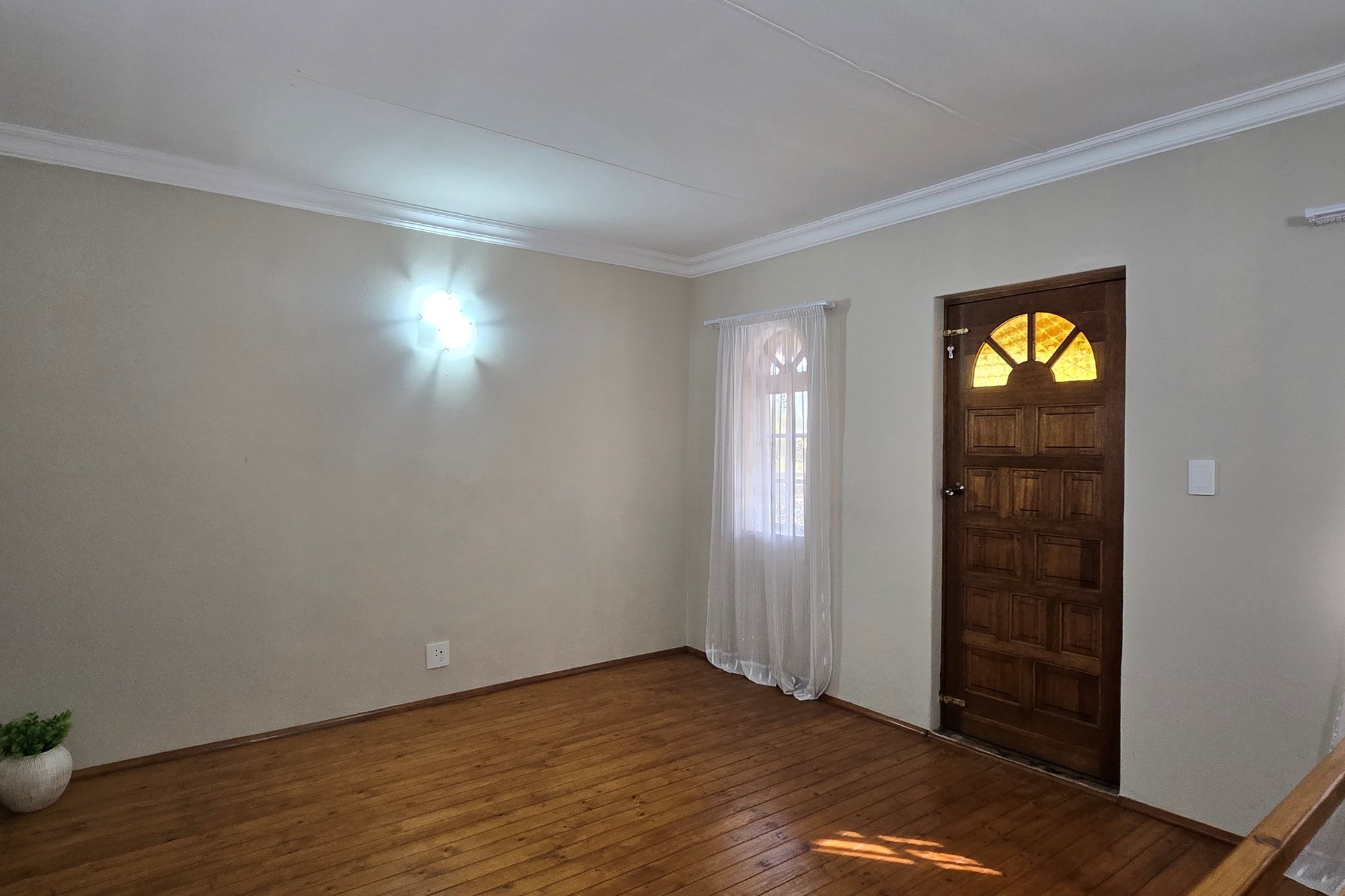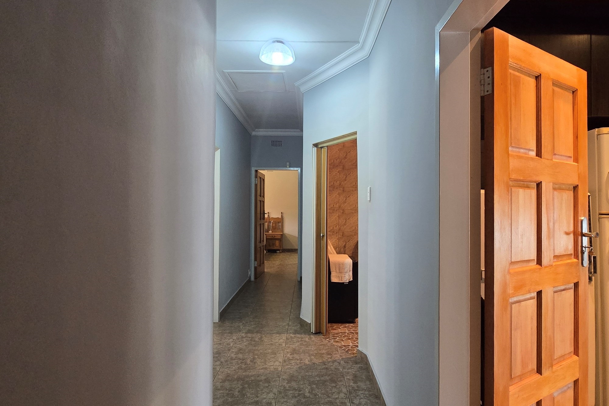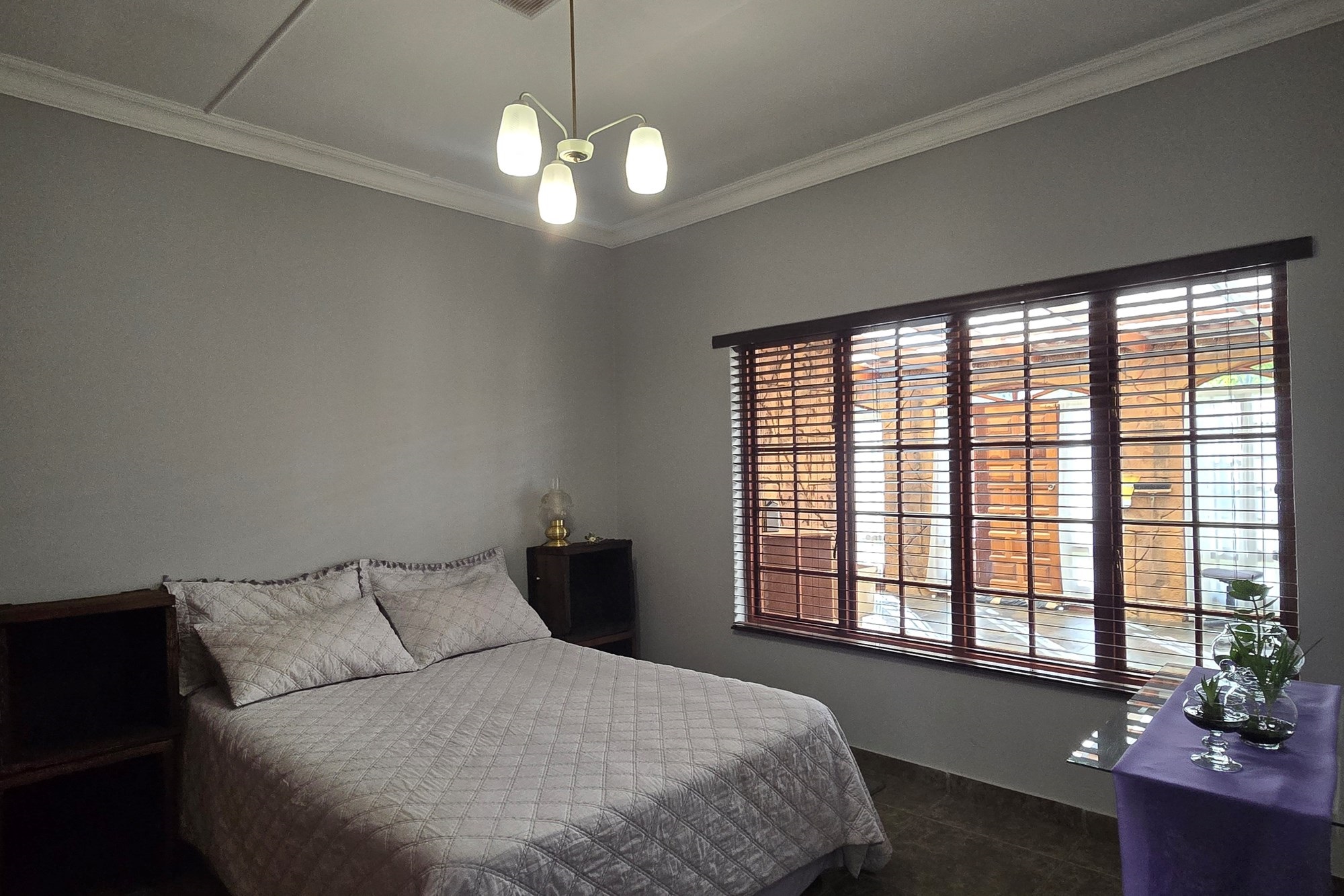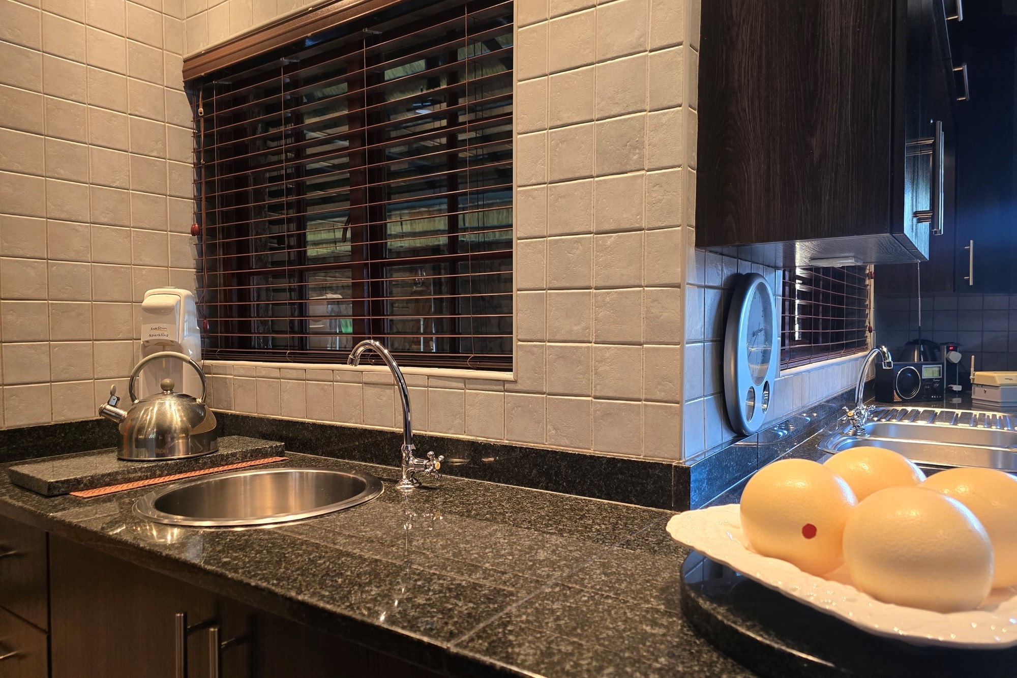The dining room is cleverly tucked behind doors adjacent to the kitchen, creating an open yet intimate setting. The kitchen is a chef’s delight, featuring dark wood cupboards, granite countertops, a breakfast nook, double eye-level oven, glass top hob with extractor fan, prep bowl, and double basin – plus ample space for your appliances.