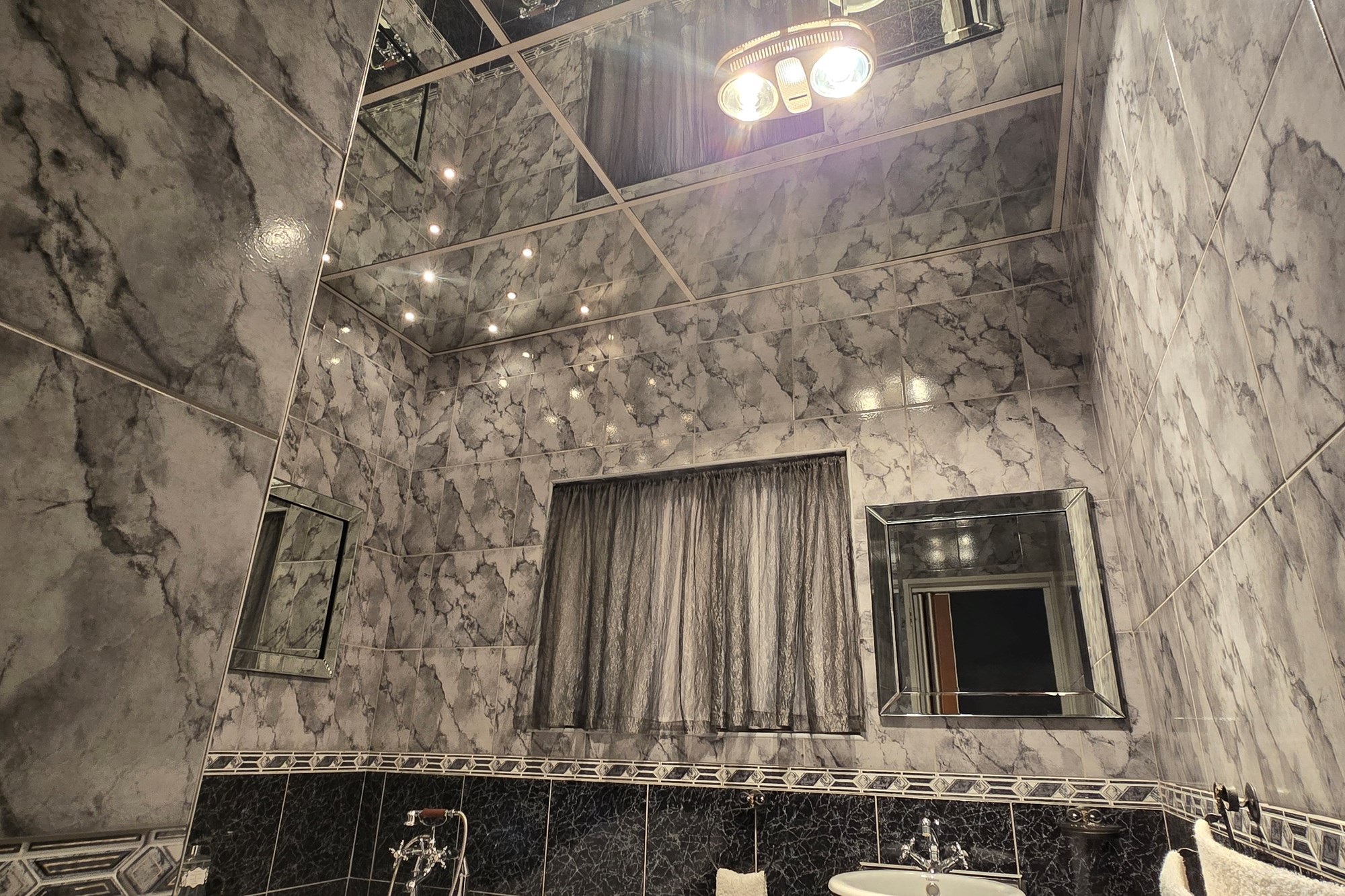 Relax in your choice of two separate lounges – one with a cozy fireplace – or combine them into one generous space. Both lead out to an enclosed sunroom with access to the spacious, tree-lined garden. Two well-sized bedrooms share two uniquely designed bathrooms, one with a shower, urinal, and starry ceiling, the other with a clawfoot tub and mirrored ceiling.