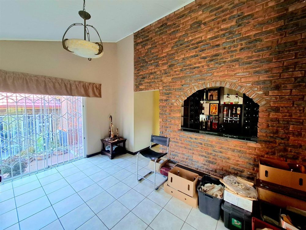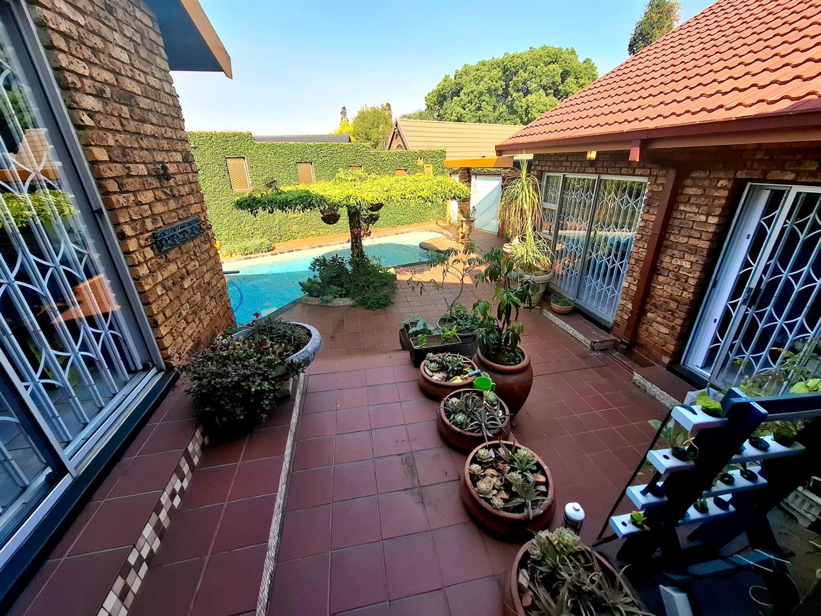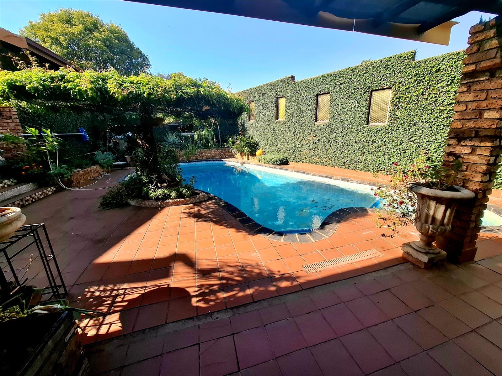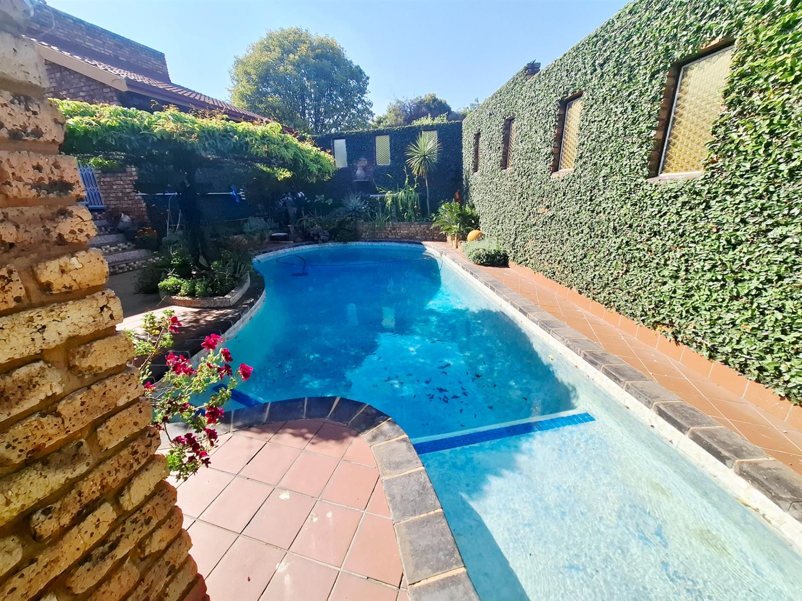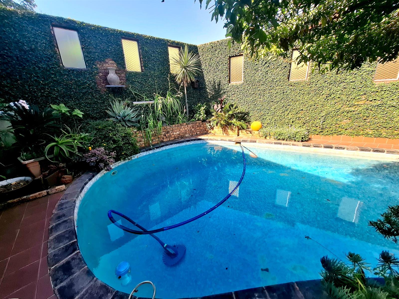 The outdoor area is an entertainer’s delight, featuring a built-in braai, tiled pool area, and creepers cascading along the walls, creating a serene and inviting atmosphere. A tree feature beside the pool adds natural beauty, while the double garage and ample additional parking provide convenience for family and guests alike.