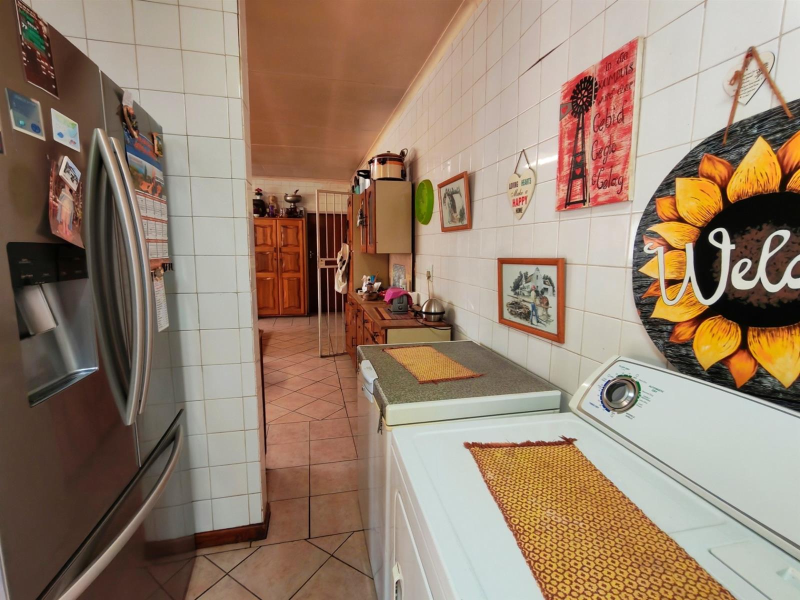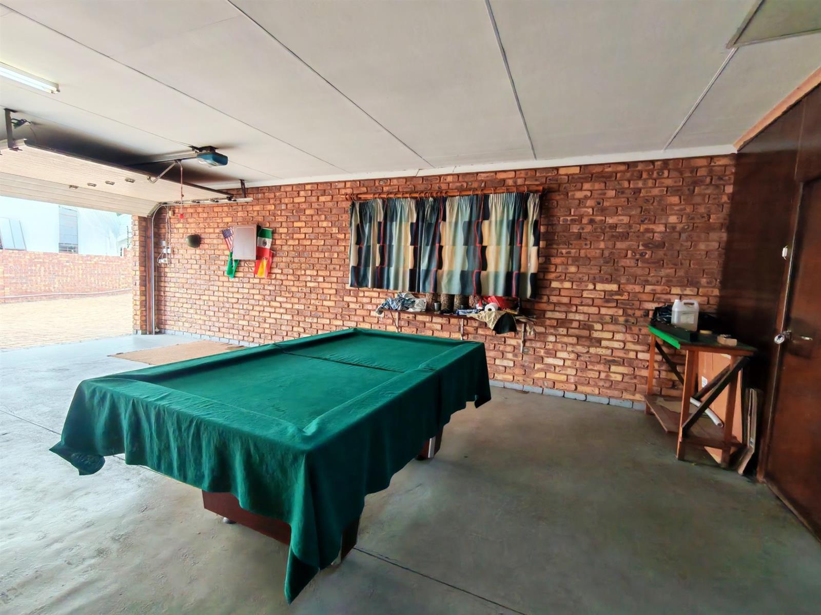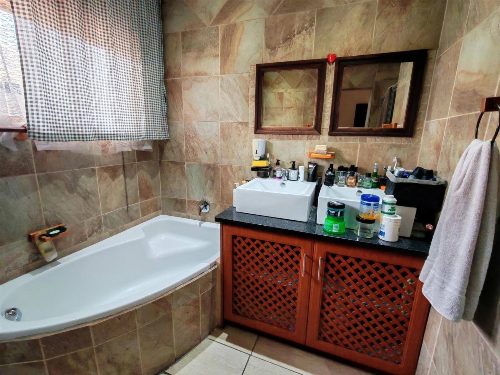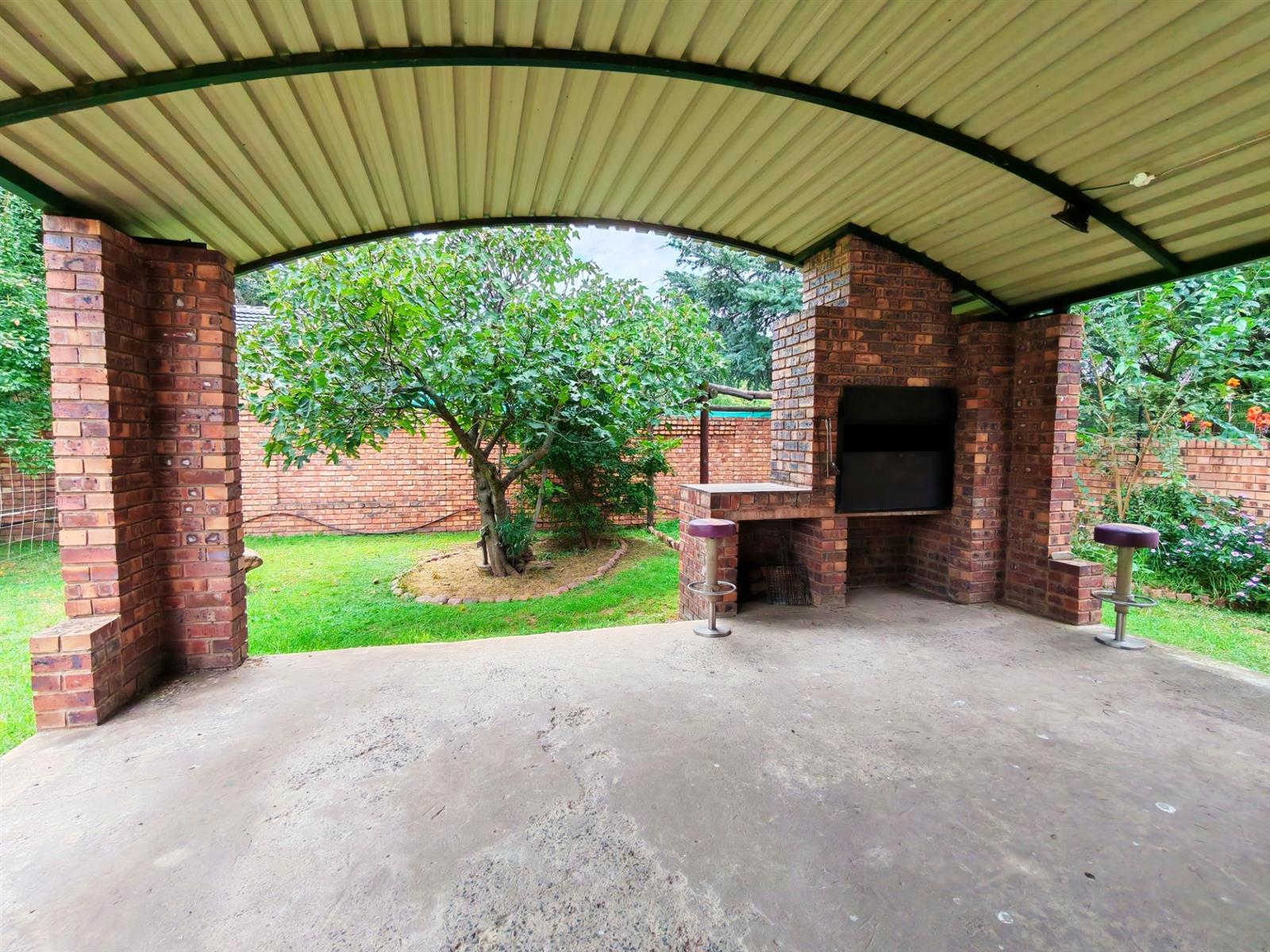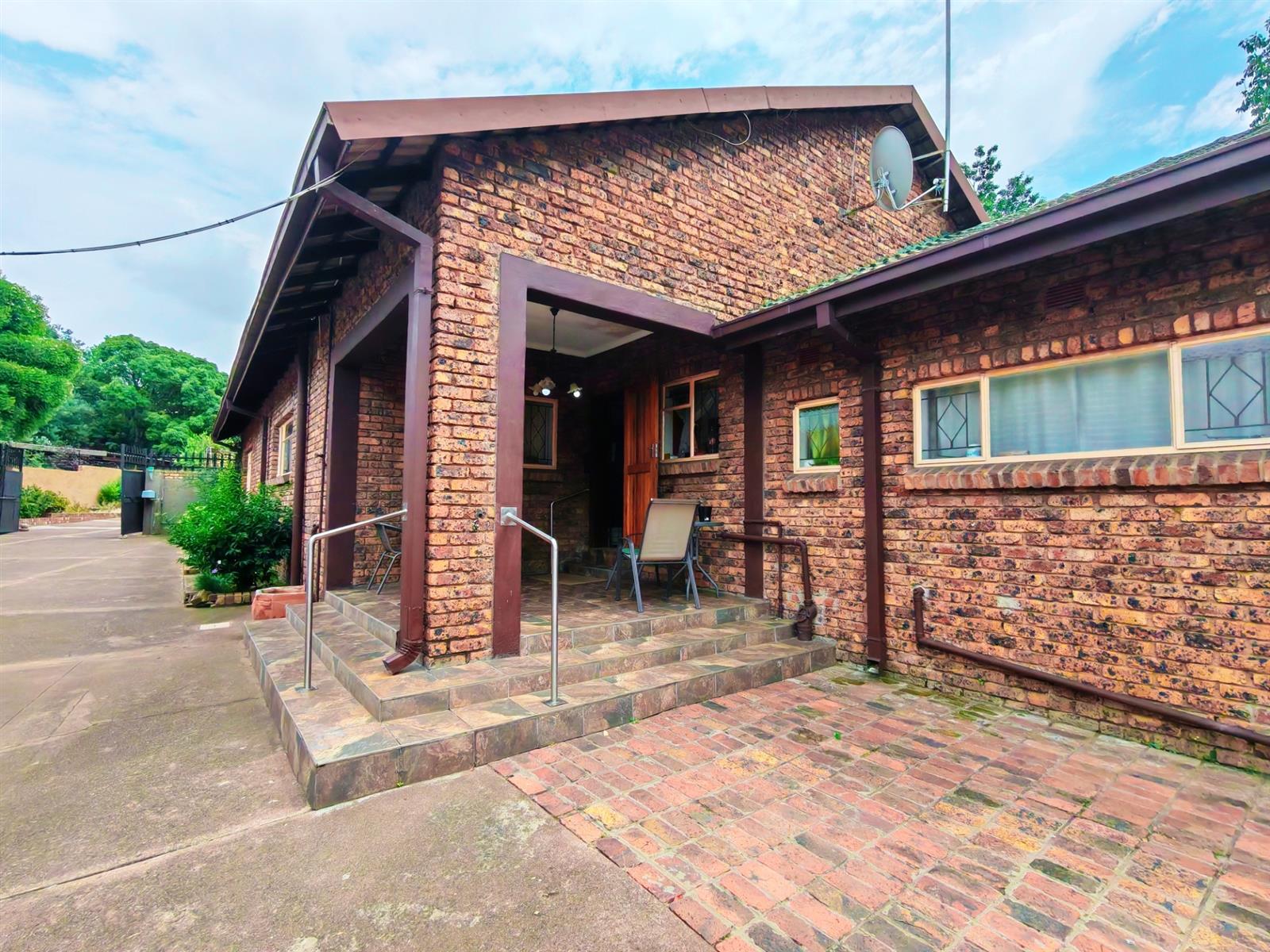 Upon entering through the majestic security gates, you will find the main house on your left and the flat on your right. There is also a sparkling pool, lapa, covered braai area and a garage with entertainment area as well as several parking spaces on the stand.