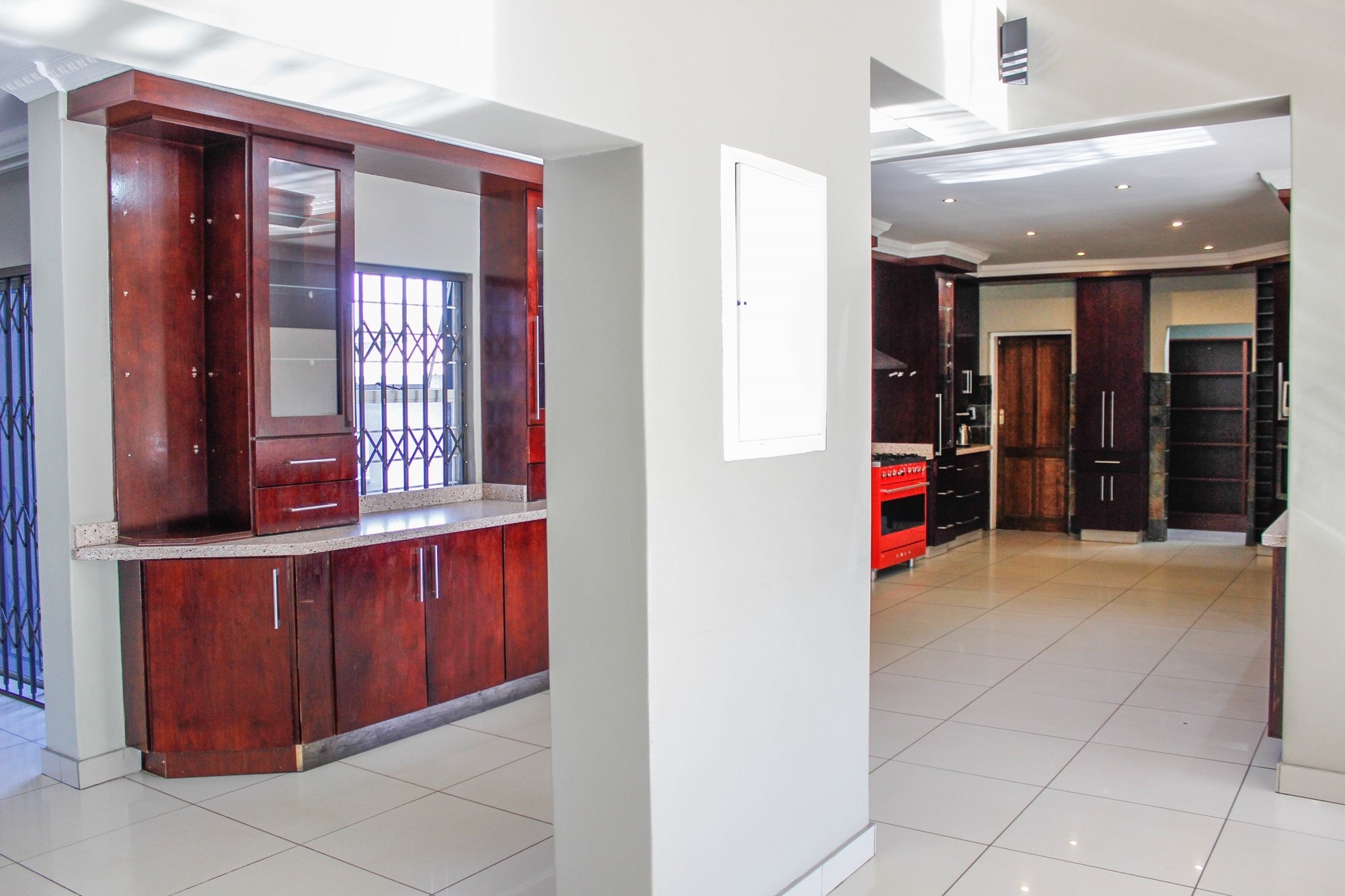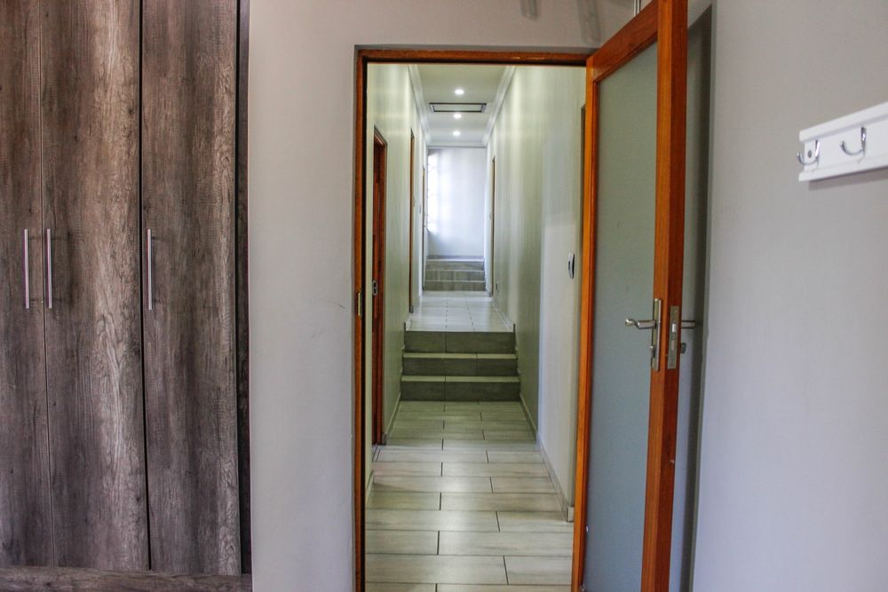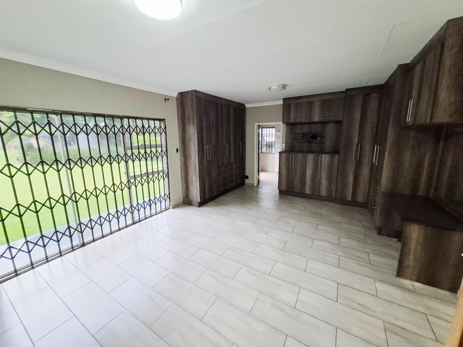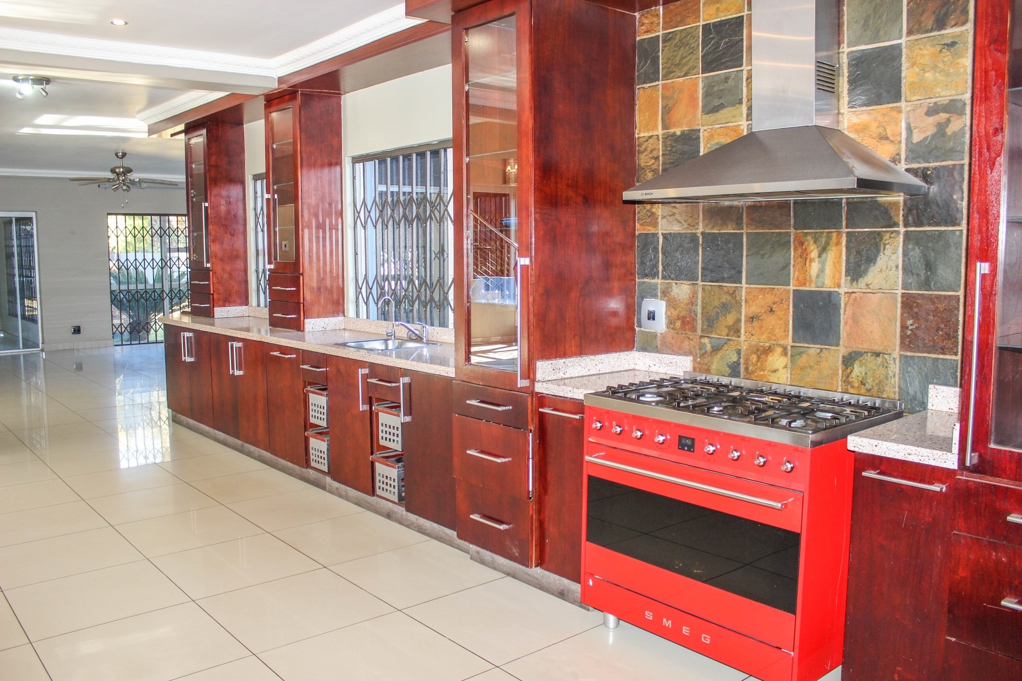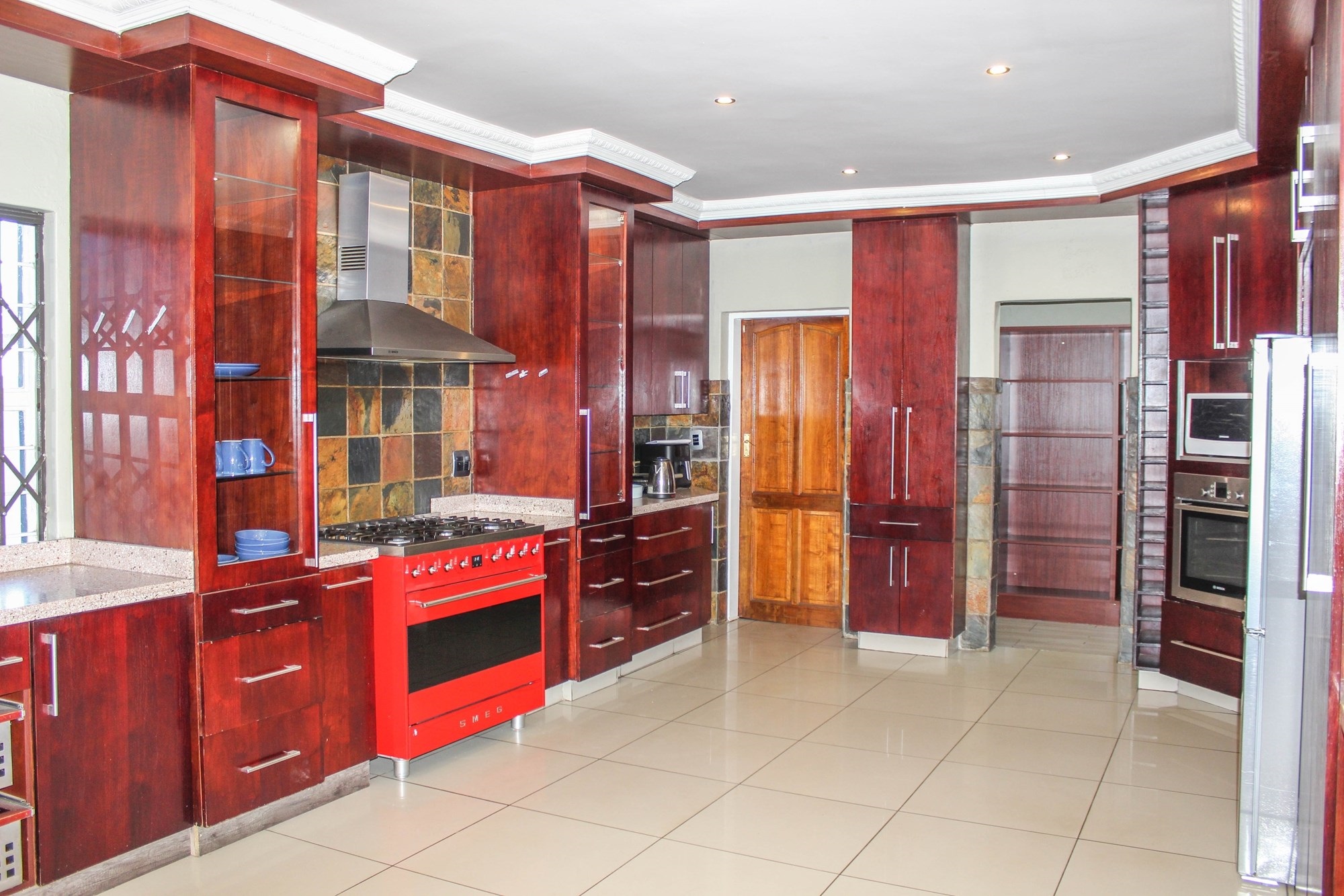 The dining room, with its built-in braai and seamless garden access, makes entertaining a breeze — ideal for both cozy dinners and large celebrations. The kitchen, truly the heart of the home, impresses with oak-finished cupboards, sleek stone countertops, and a premium Smeg oven featuring a 6-plate gas stove. A walk-in pantry, extra-length electric oven, and combined scullery/laundry add practicality and charm.