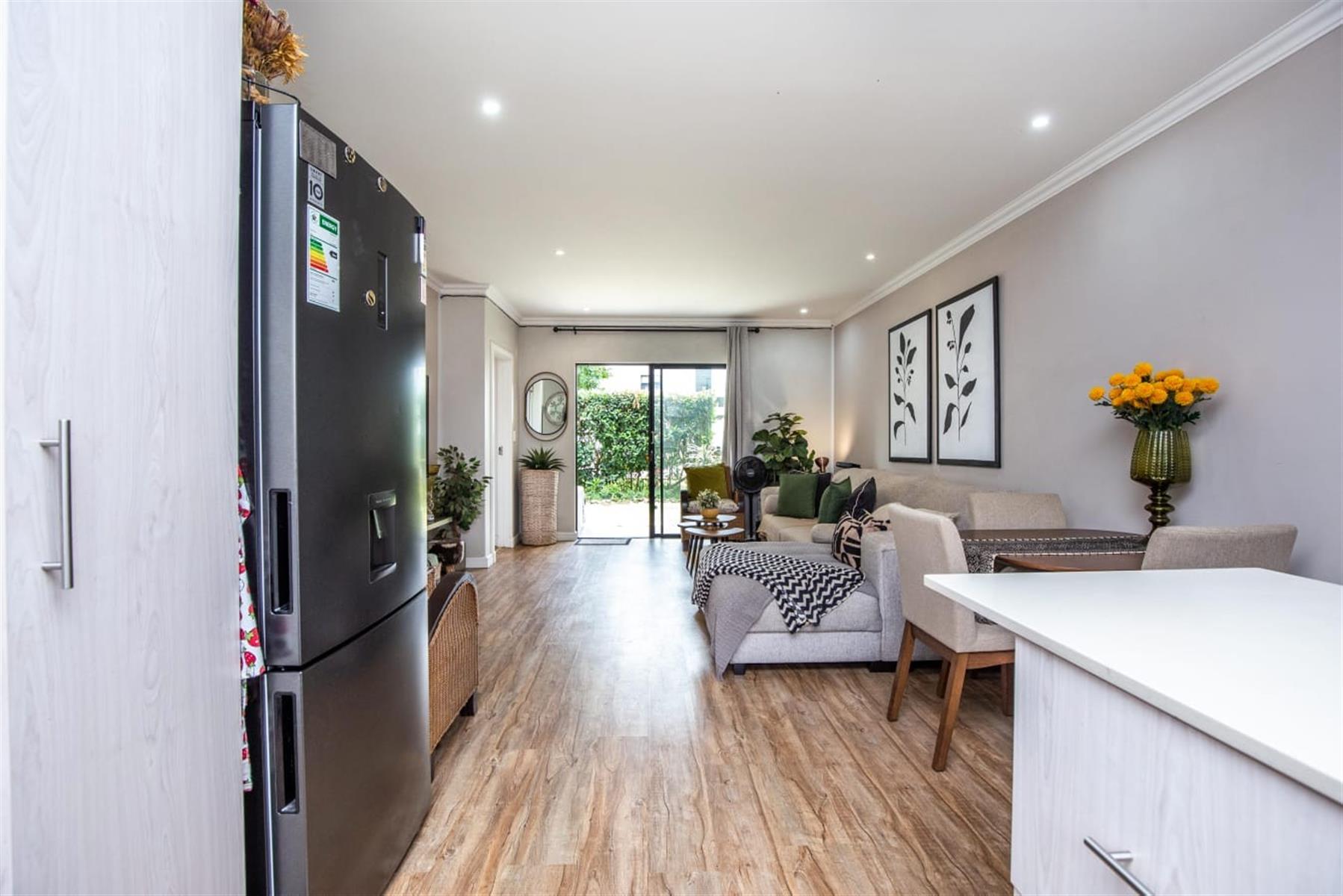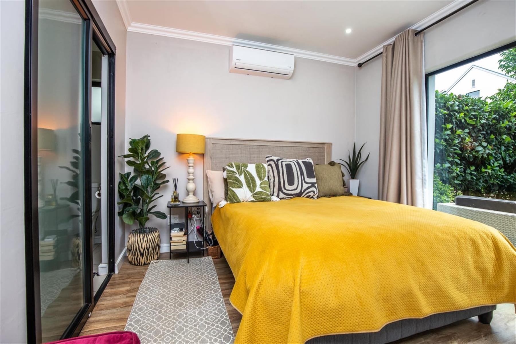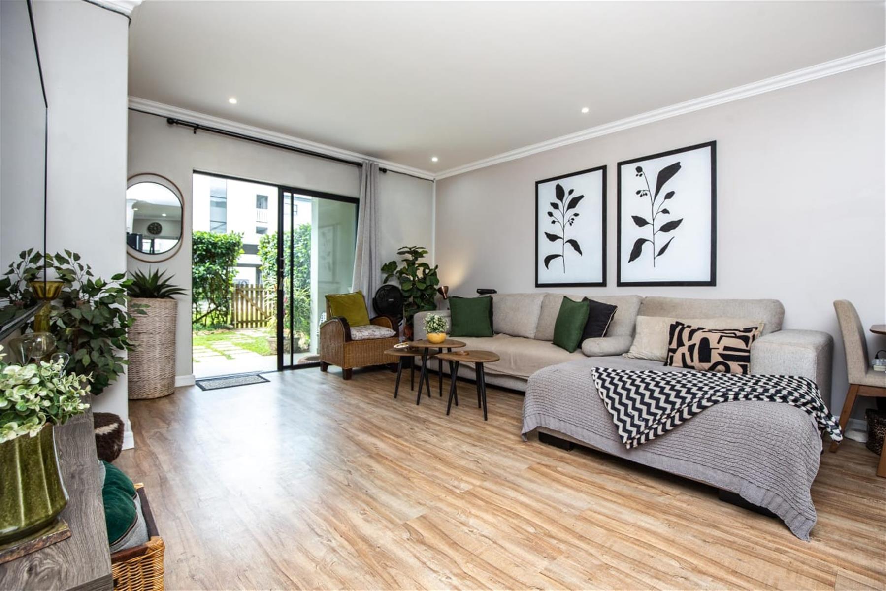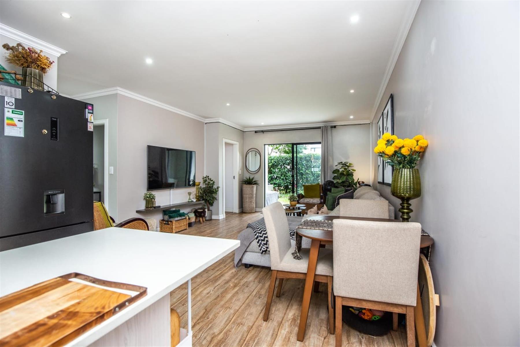 The open-plan kitchen and lounge create a seamless flow, ideal for everyday living and effortless entertaining. The contemporary kitchen features ample cupboard space, sleek quartz countertops, and a double drop-in sink. A sliding door extends the living area onto a private patio and manicured garden—perfect for relaxed outdoor enjoyment or hosting guests.