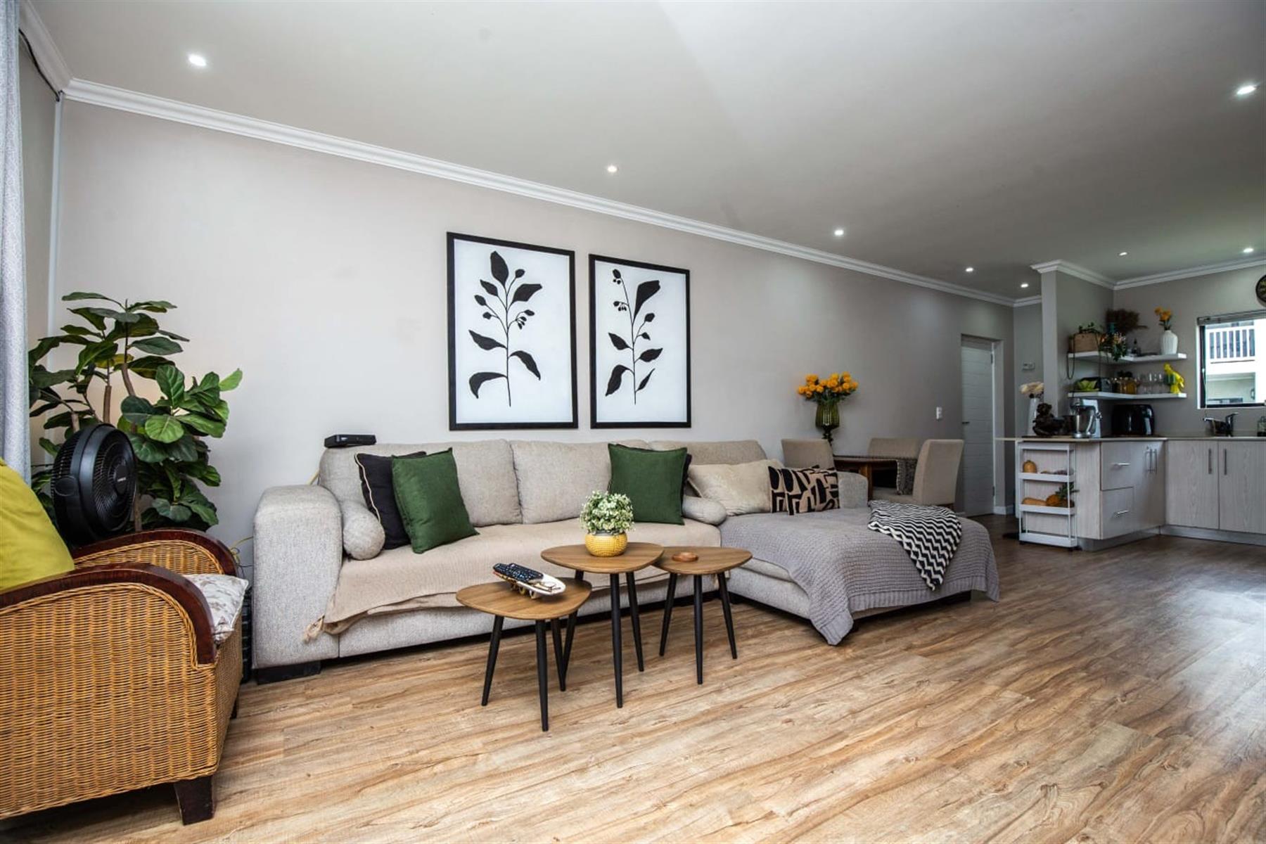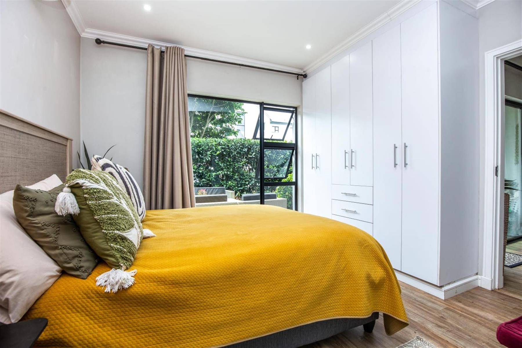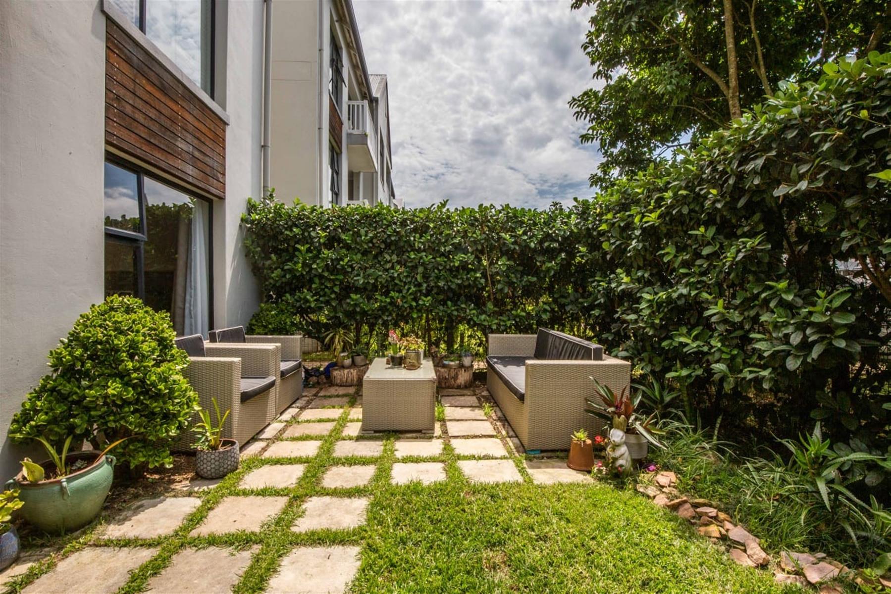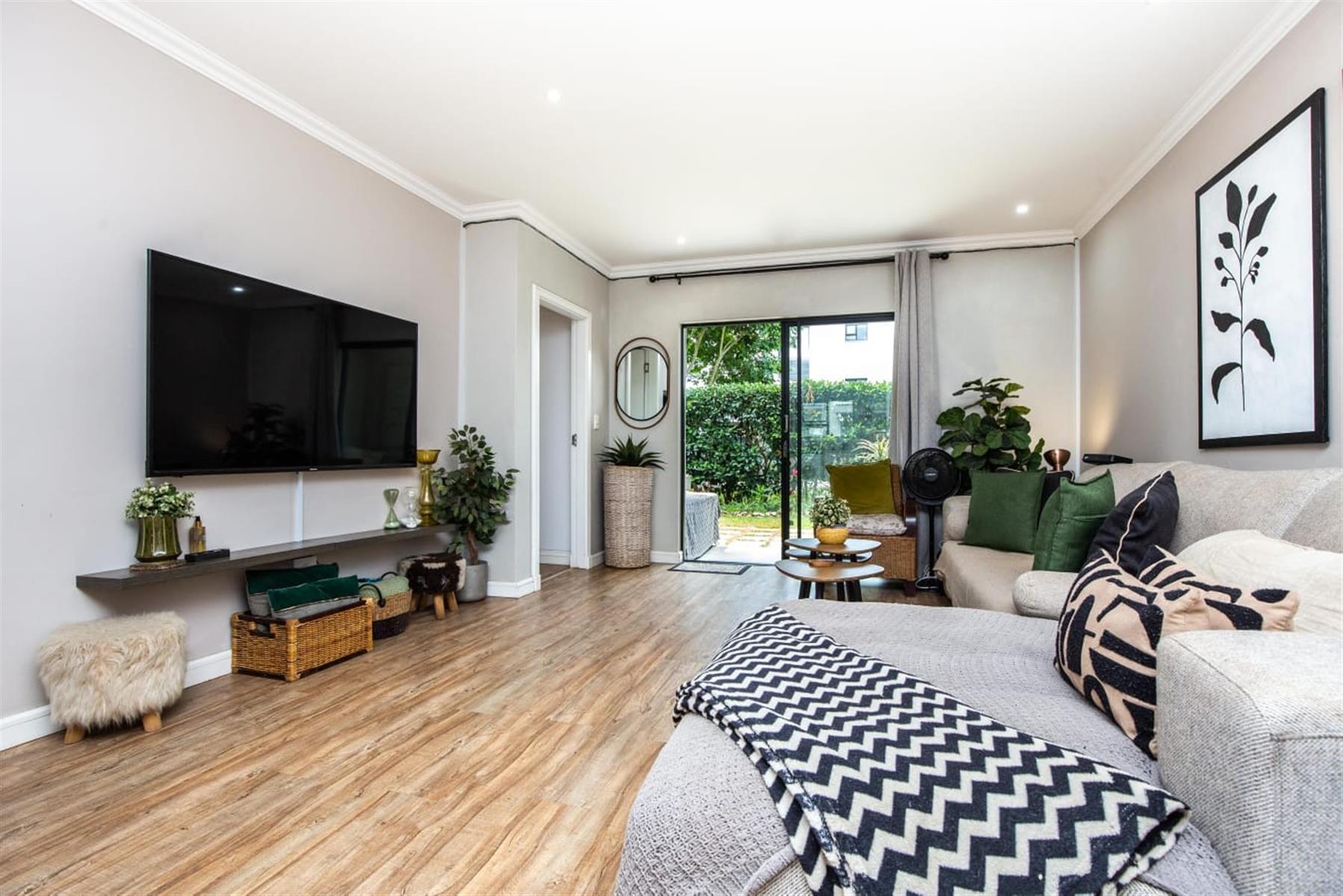 The open-plan kitchen and lounge create a seamless flow, ideal for everyday living and effortless entertaining. The contemporary kitchen features ample cupboard space, sleek quartz countertops, and a double drop-in sink. A sliding door extends the living area onto a private patio and manicured garden—perfect for relaxed outdoor enjoyment or hosting guests.