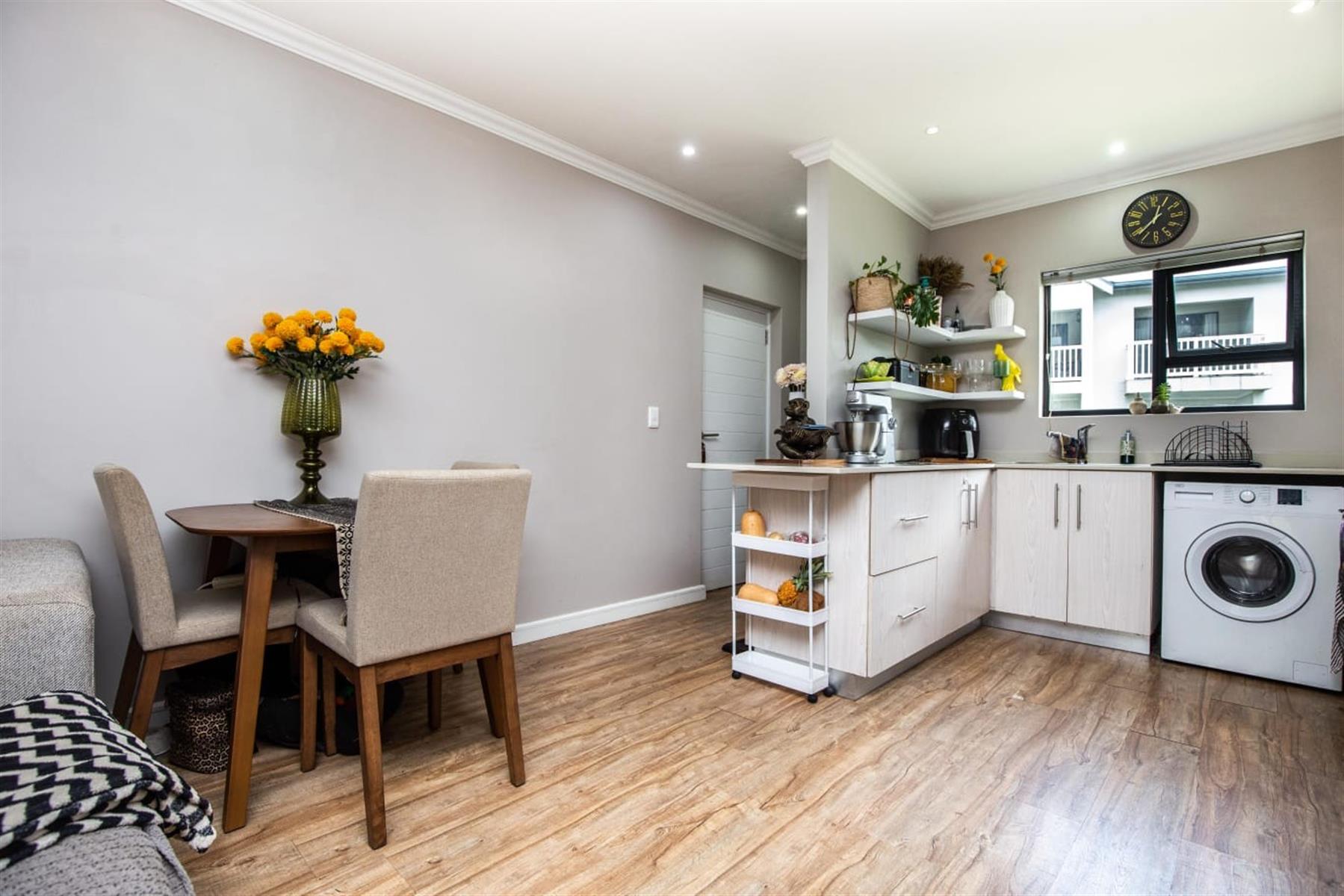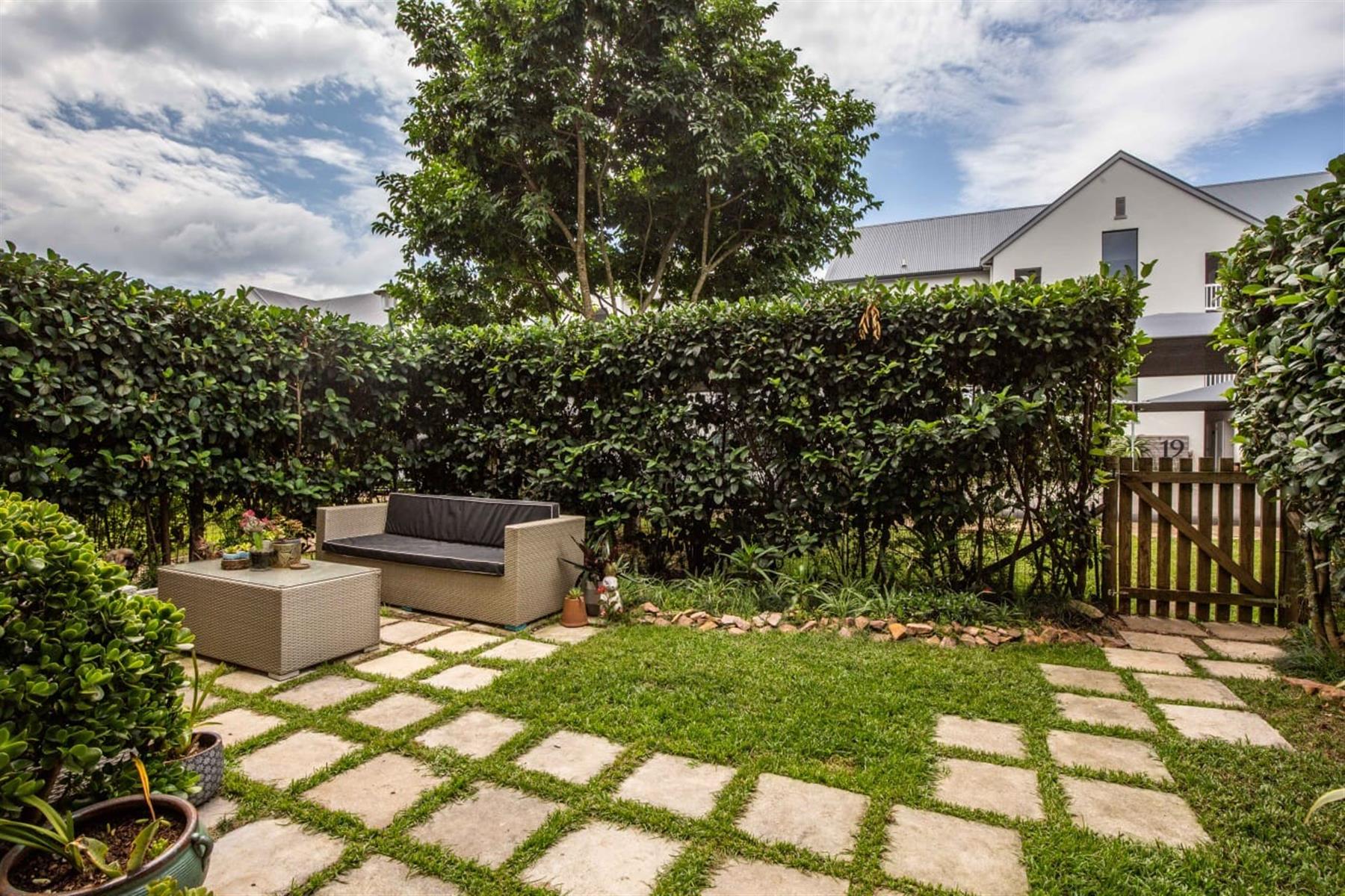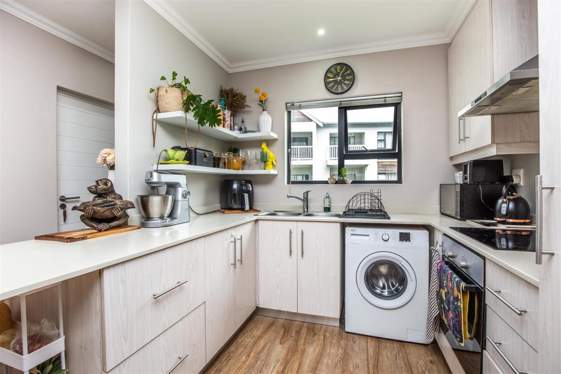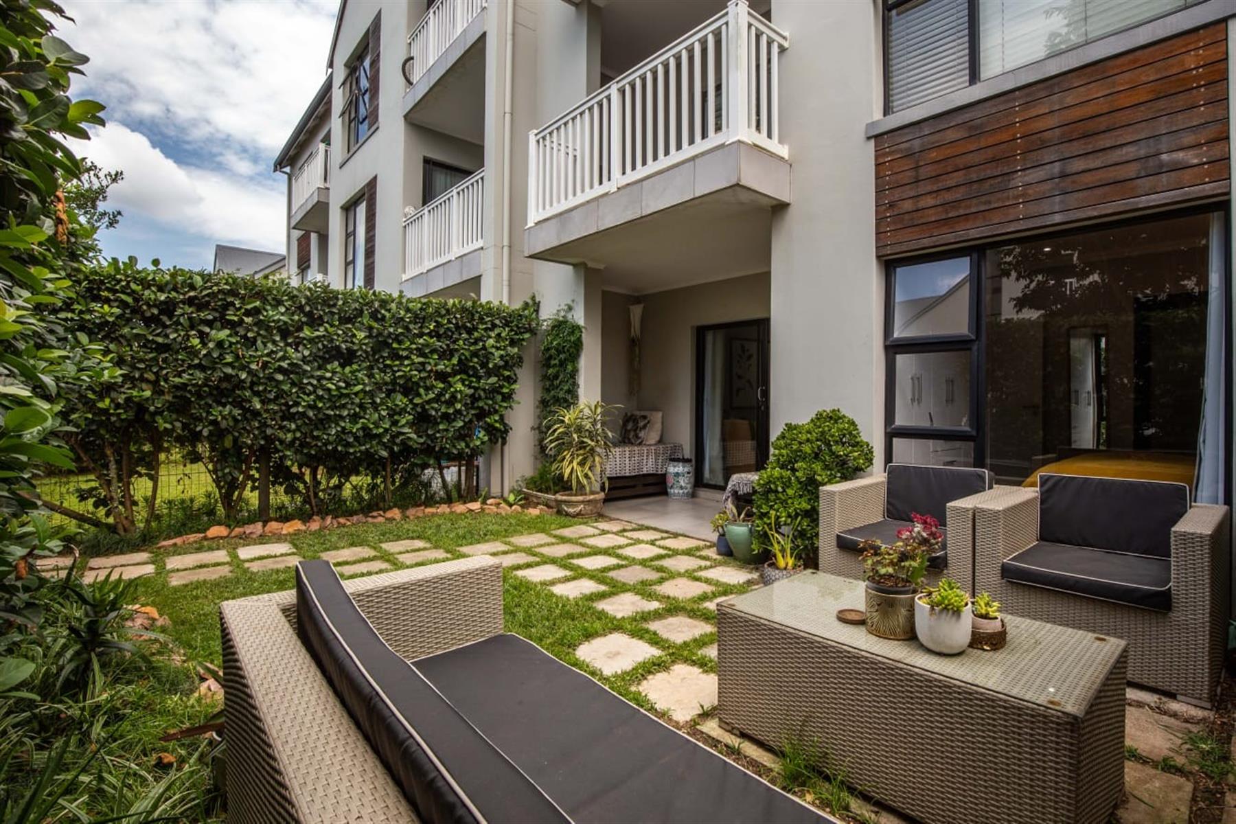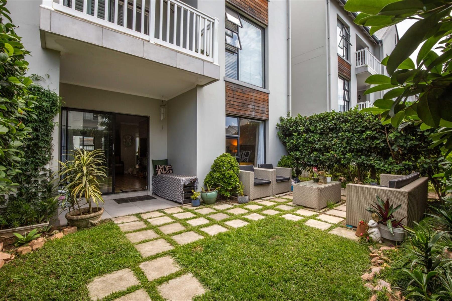 The open-plan kitchen and lounge create a seamless flow, ideal for everyday living and effortless entertaining. The contemporary kitchen features ample cupboard space, sleek quartz countertops, and a double drop-in sink. A sliding door extends the living area onto a private patio and manicured garden—perfect for relaxed outdoor enjoyment or hosting guests.