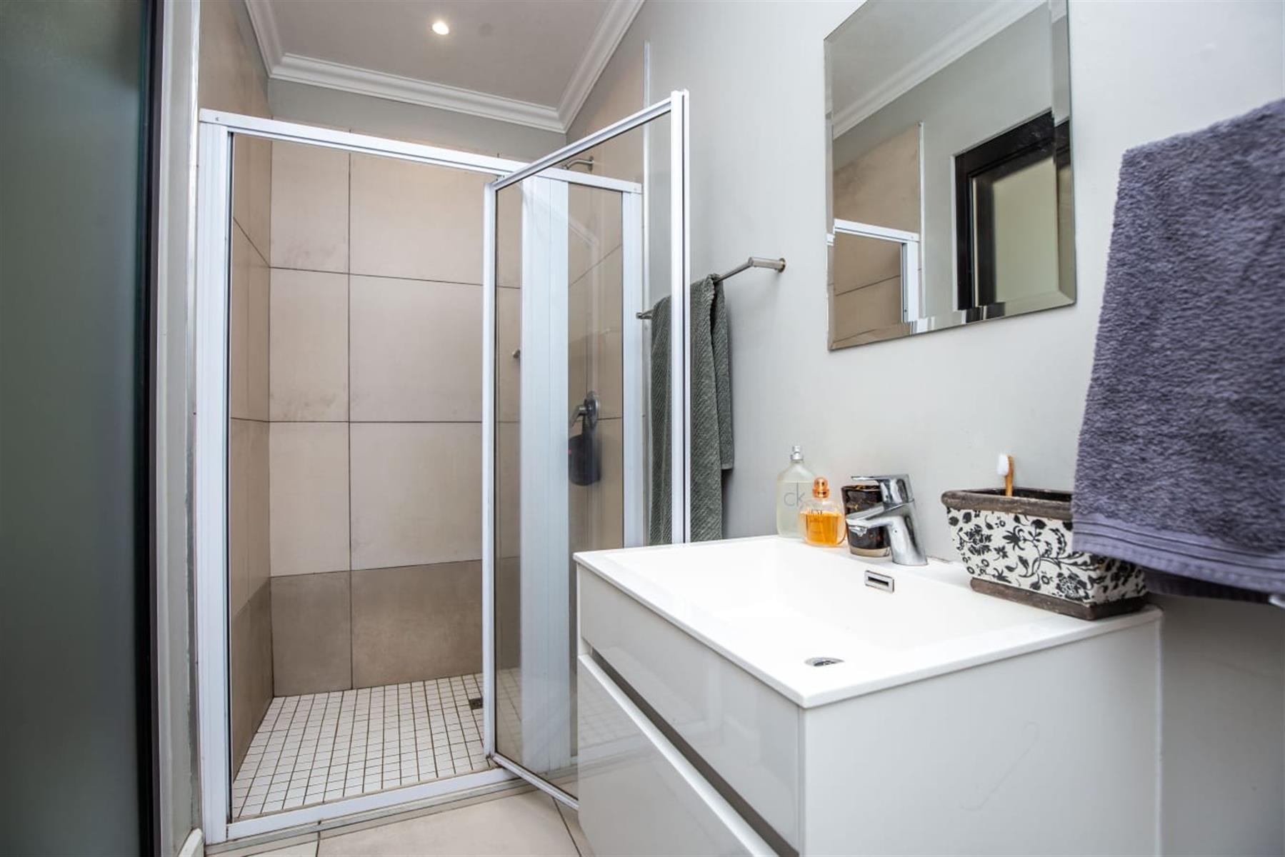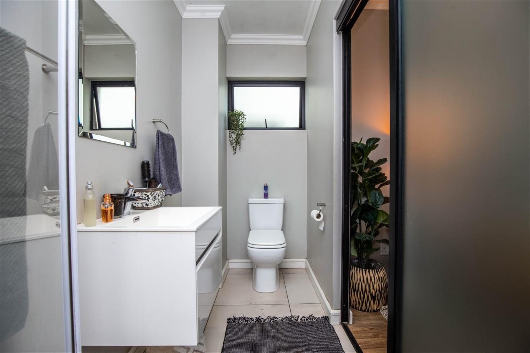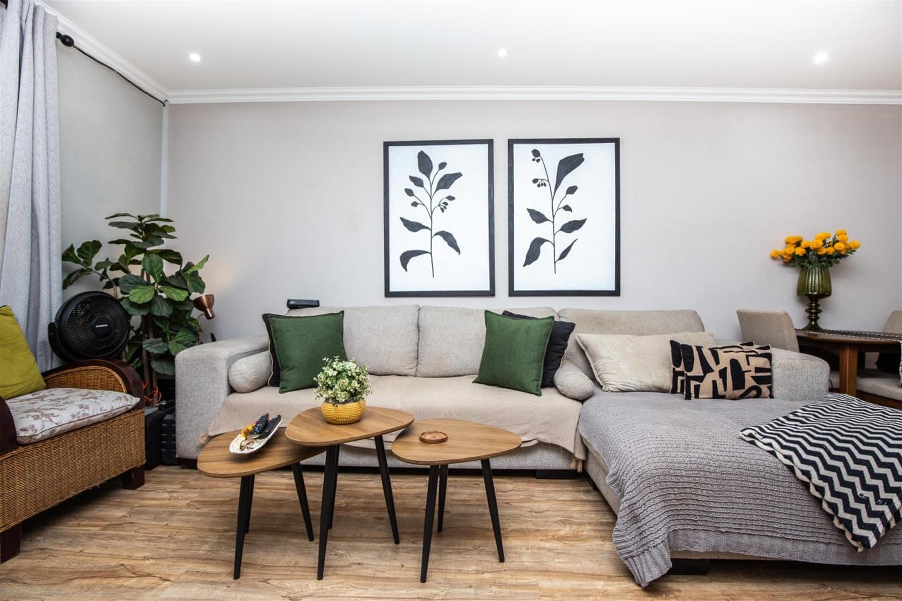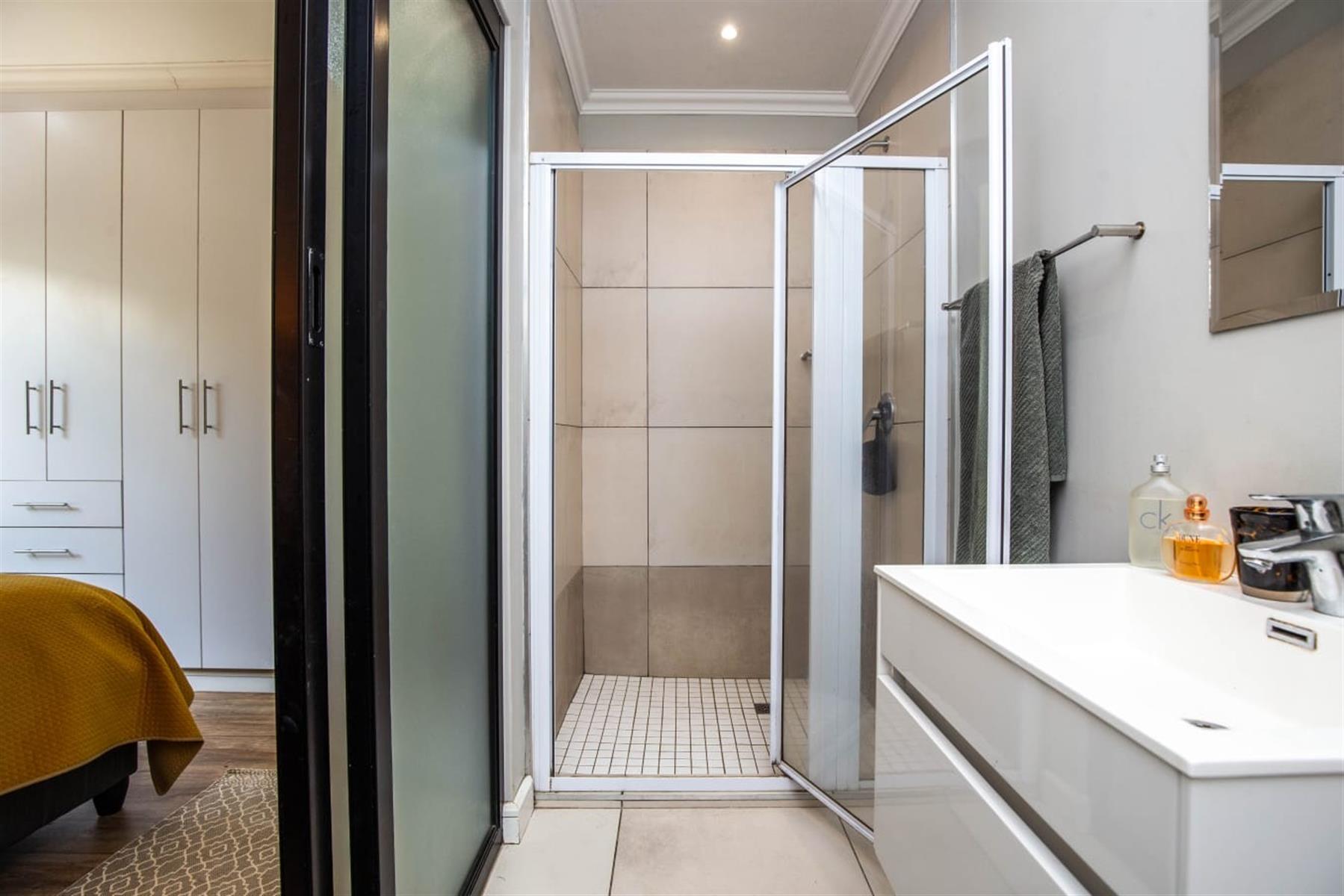 The open-plan kitchen and lounge create a seamless flow, ideal for everyday living and effortless entertaining. The contemporary kitchen features ample cupboard space, sleek quartz countertops, and a double drop-in sink. A sliding door extends the living area onto a private patio and manicured garden—perfect for relaxed outdoor enjoyment or hosting guests.