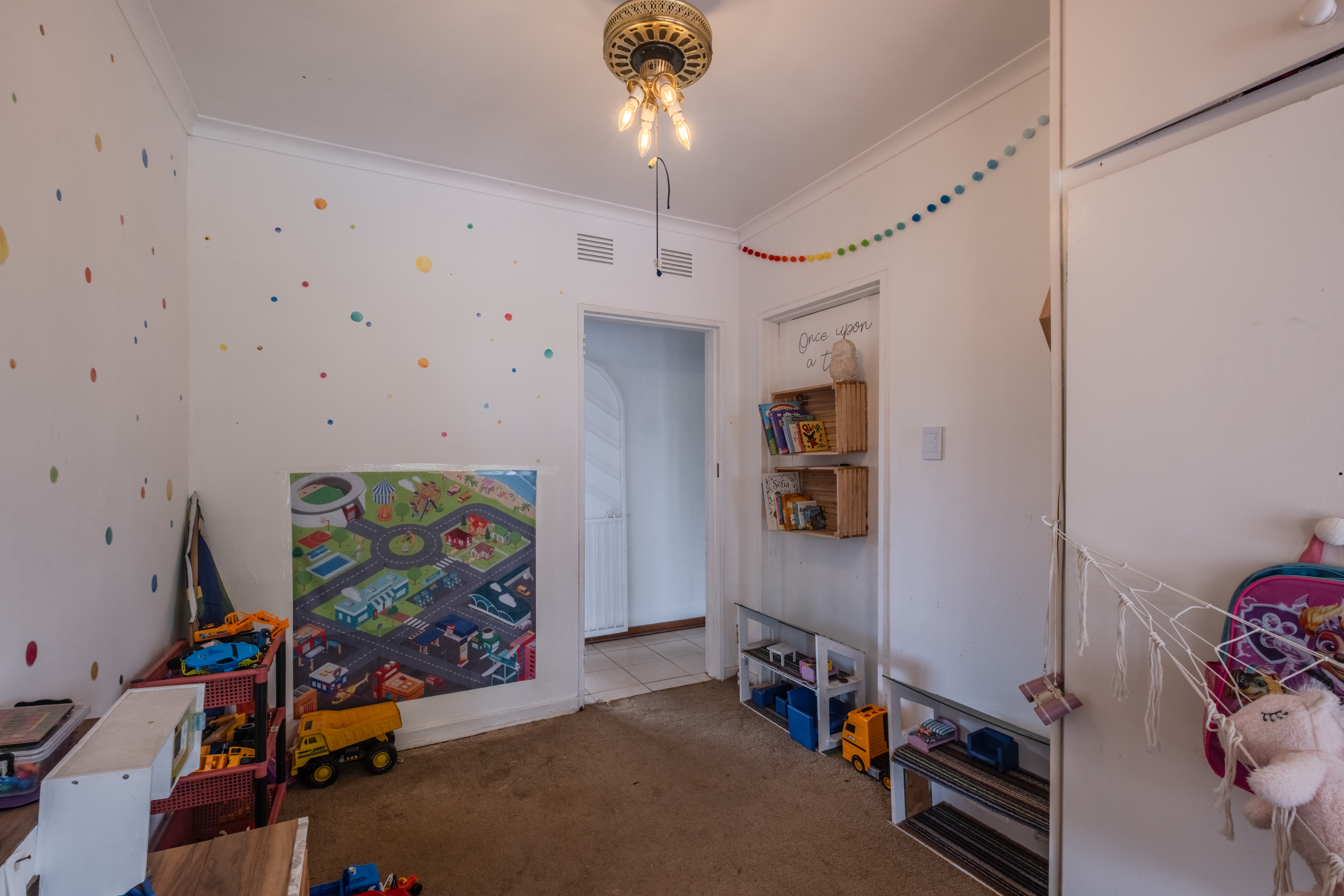 The bedroom wing is secured by a passage security gate. Accommodation includes three well-sized bedrooms and a fourth smaller bedroom, ideal for a young child, study, or home office. The family bathroom is a full bathroom with bath, shower, toilet, and basin. The spacious main bedroom features an en-suite bathroom with shower, toilet, and basin, as well as an additional adjoining room that can easily be converted into a walk-in wardrobe, private lounge, or home office.