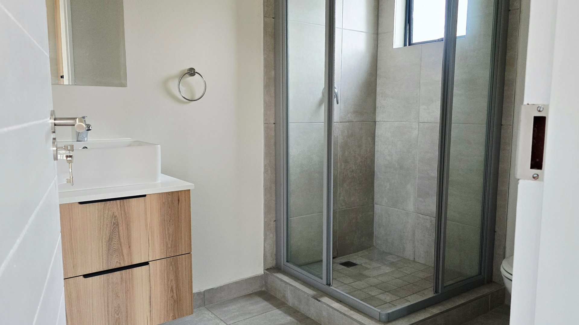 The bathroom is fitted with a modern shower, catering to practicality and style. Both bedrooms feature ample natural light, creating a bright and airy atmosphere. The unit also includes a gas geyser for energy efficiency and is fibre-ready, ensuring seamless connectivity for all your needs.