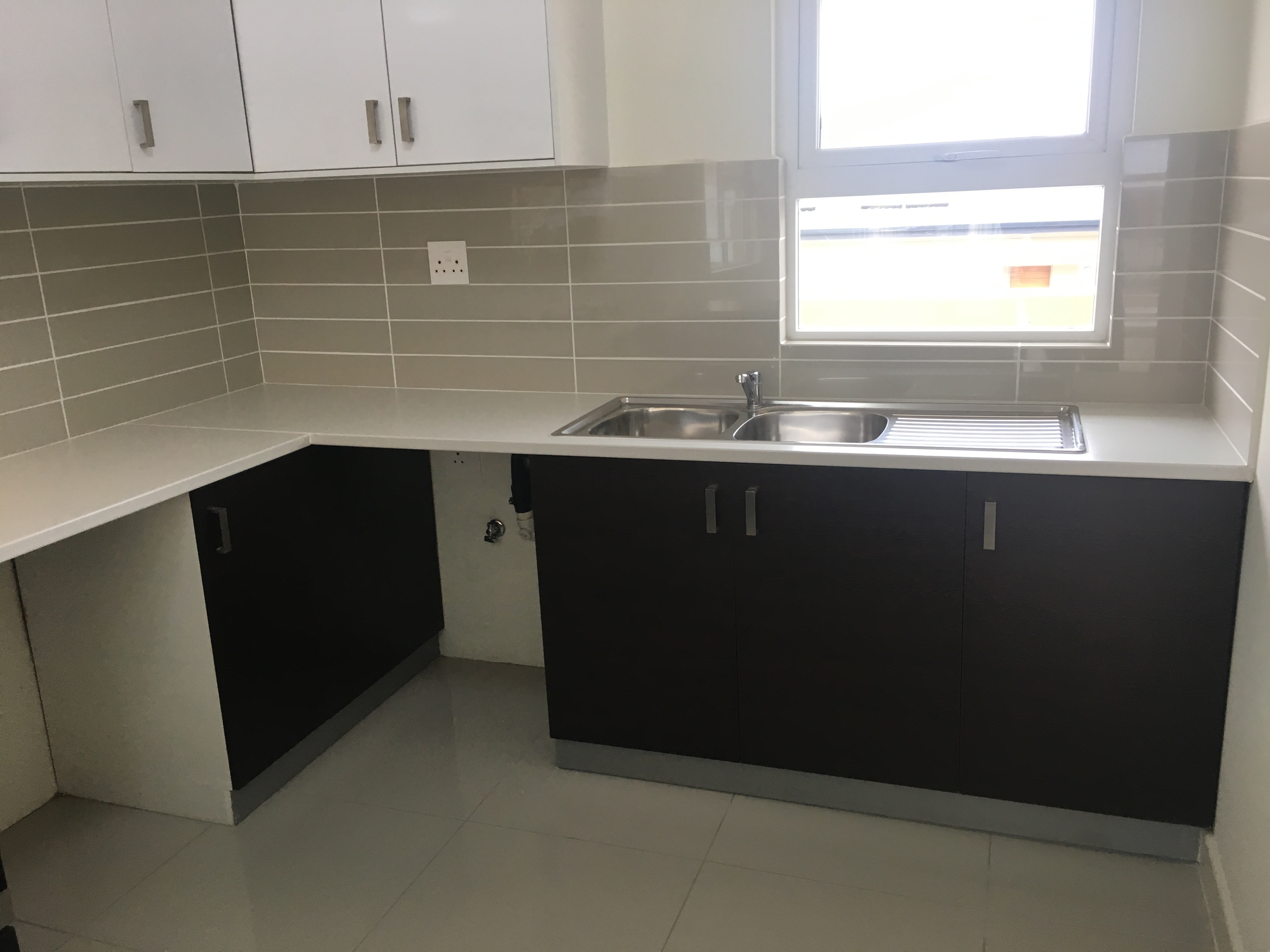 The gorgeous kitchen is equipped with gas cooking facilities, double sink, tiles and self-closing cupboards. The open plan kitchen opens to the exceedingly spacious living area with a sliding door to the extra large private garden.