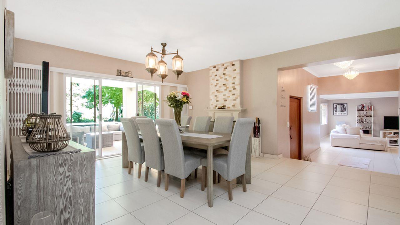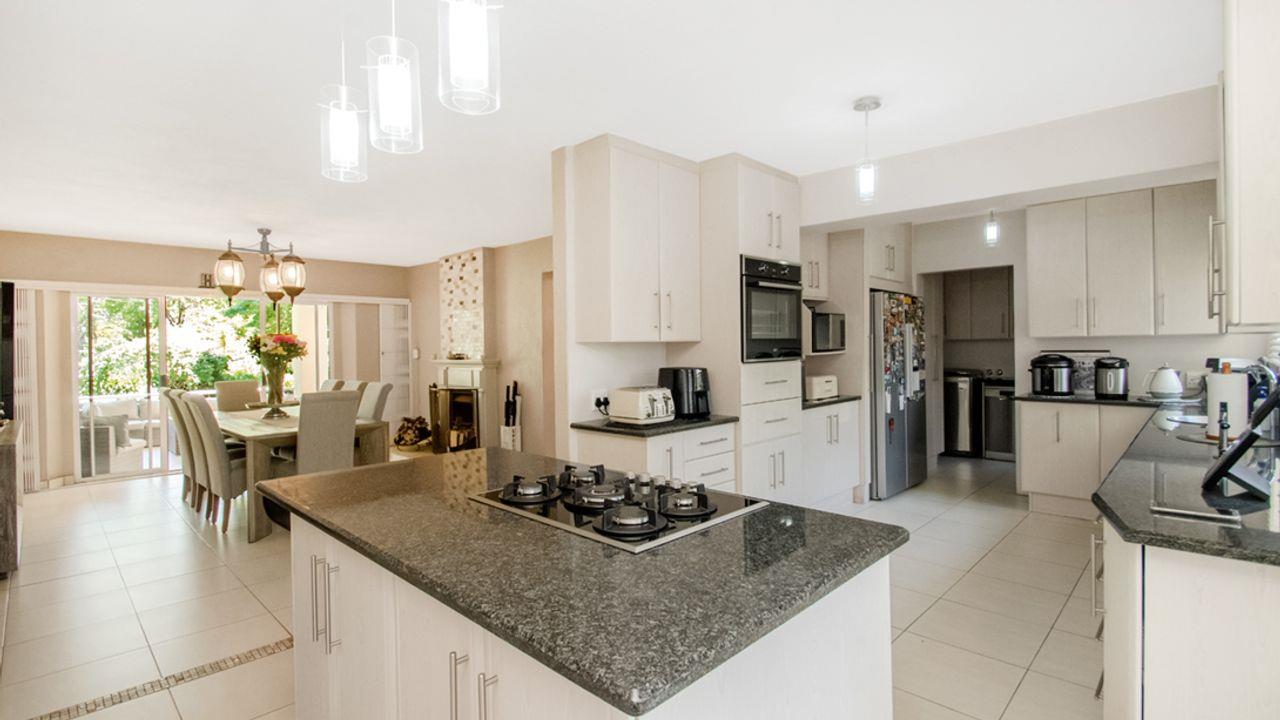 This phenomenal property boasts four well-appointed bedrooms, each equipped with exquisite, state-of-the-art wardrobes, while two of the bedrooms feature convenient ensuites. The expansive dining and living area seamlessly flows into a stunning kitchen, complete with a spacious built-in unit, stove, oven, and extractor, offering abundant space for luxurious family living.