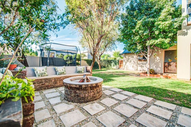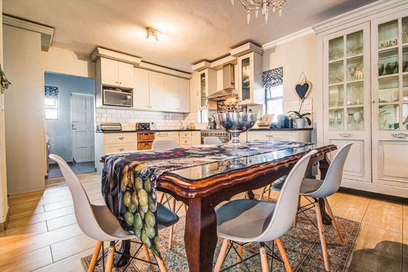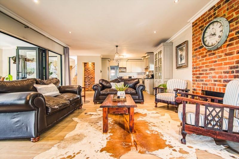 The elegant entrance hall welcomes you into multiple living areas: a lounge, family room, dining room, and a well-equipped kitchen, complemented by a pantry, scullery, and laundry for optimal functionality. With one guest loo and four built-in cupboards, storage and comfort are assured.