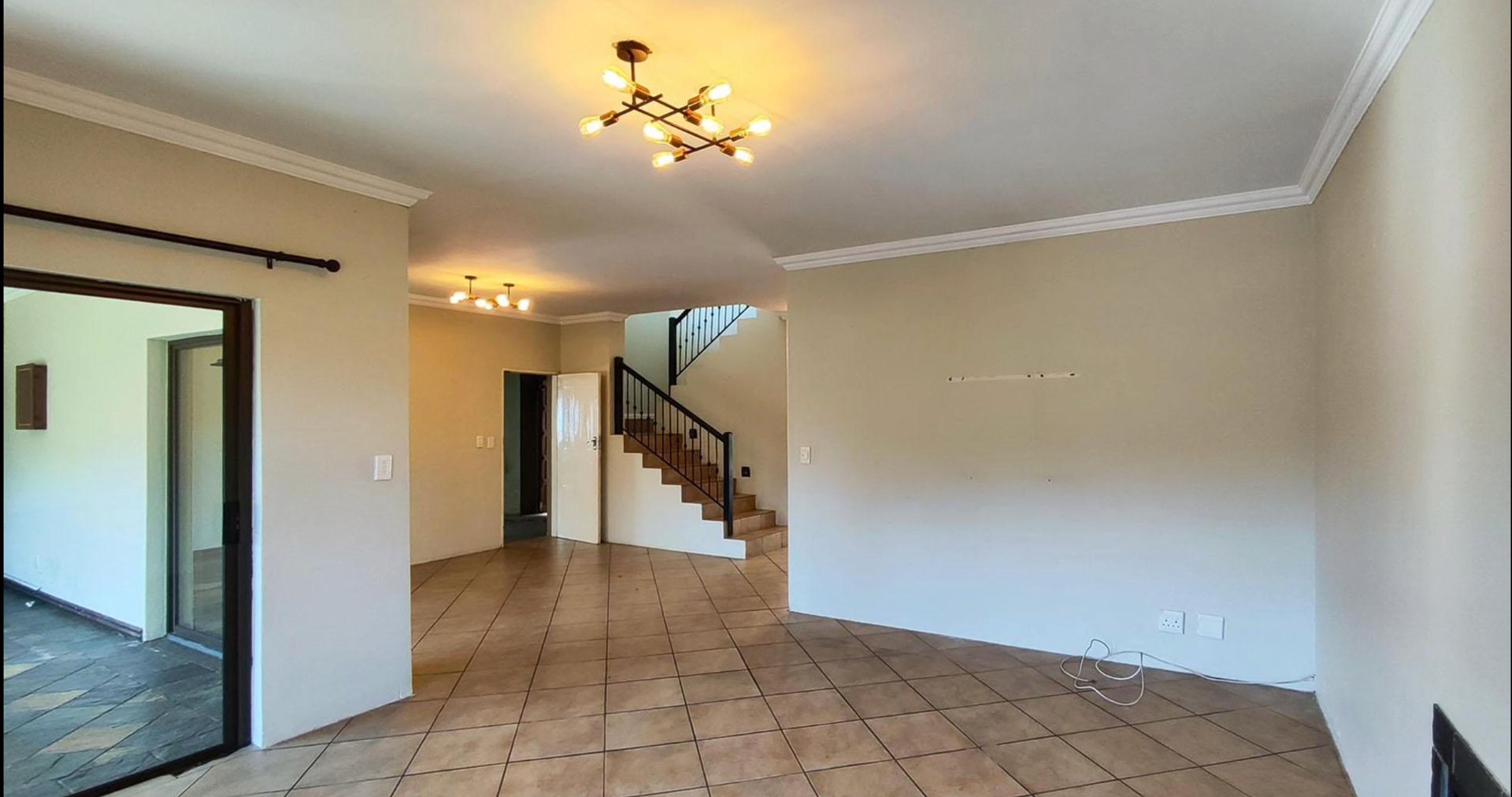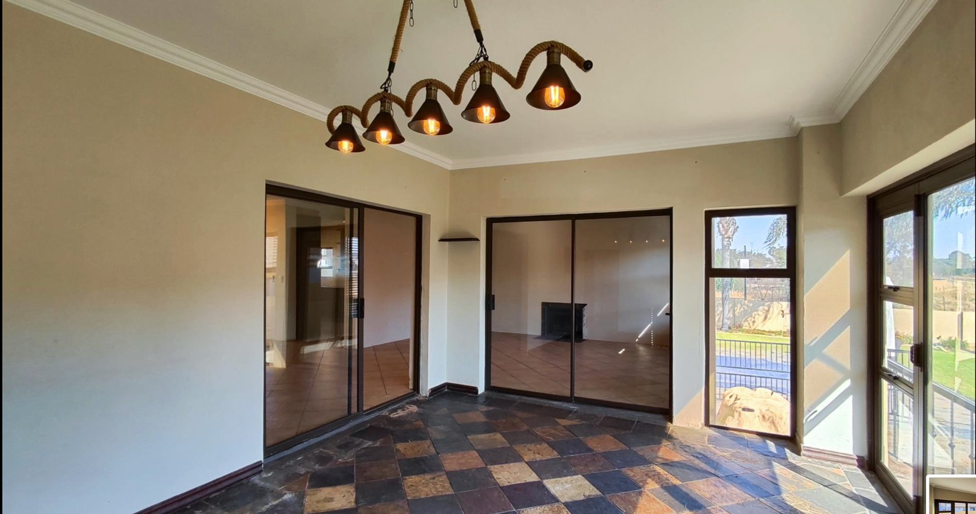 Seamless indoor-outdoor living is achieved through large sliding and bifold doors that open onto a bright entertainment area or sunroom. This space includes a built-in braai and striking checkered tiled flooring, making it ideal for entertaining guests.