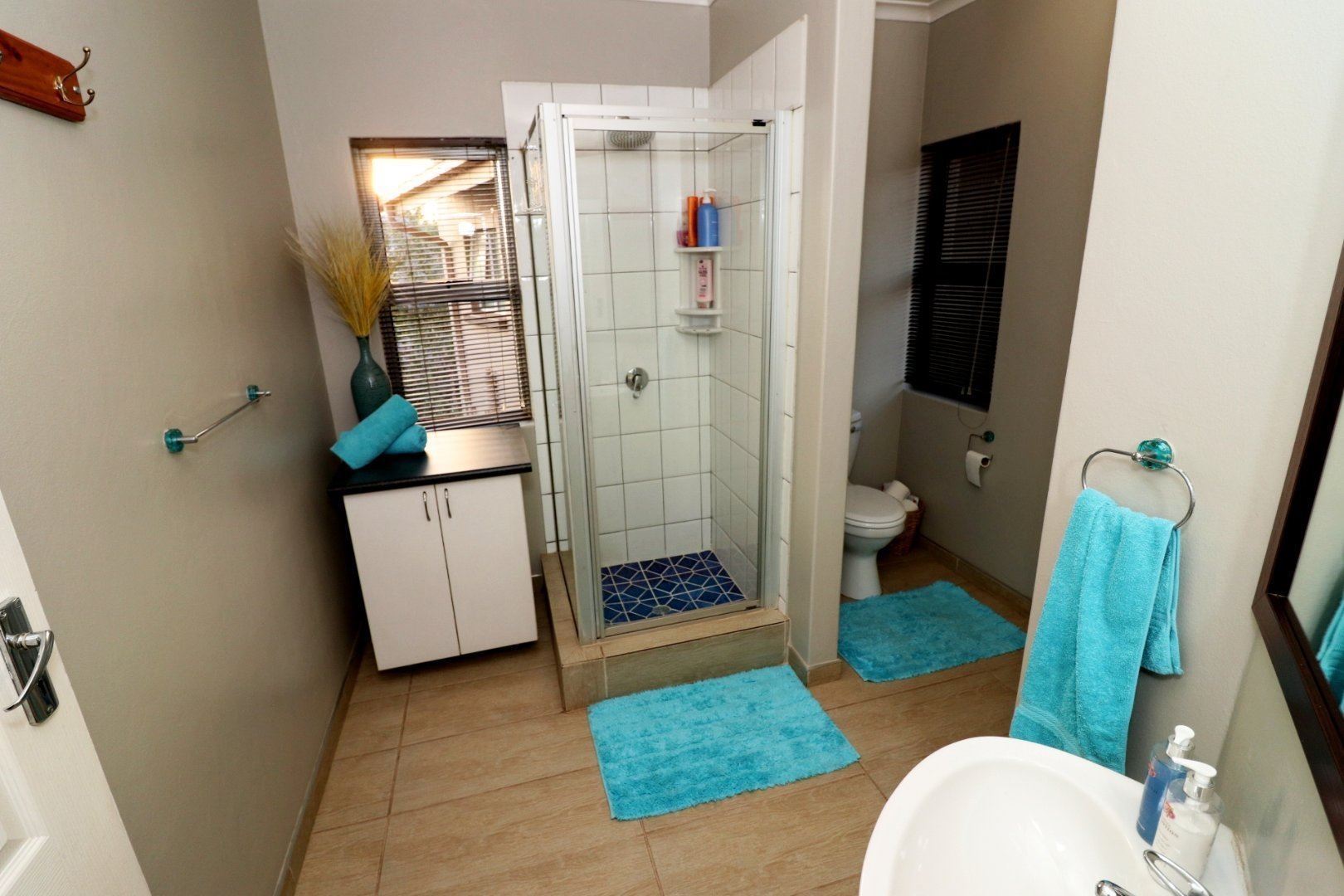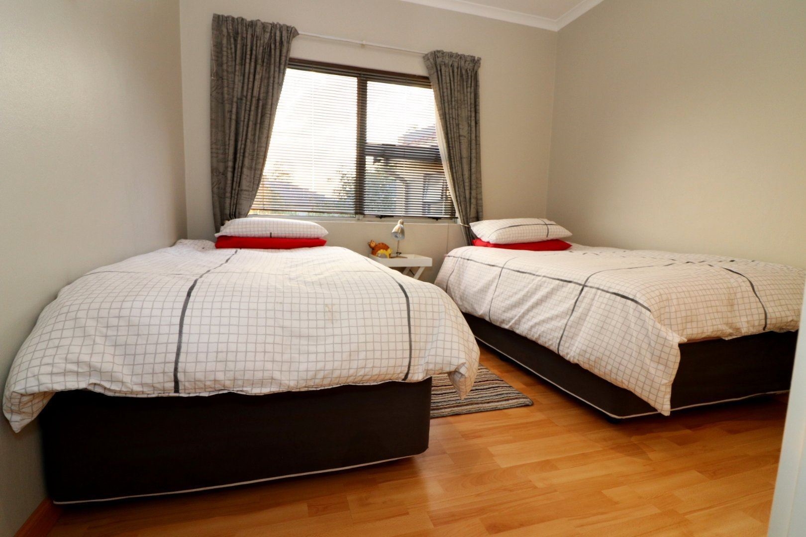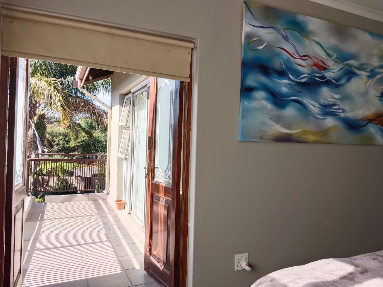 The house consists of three bedrooms with two bathrooms. The en-suite bathroom offers shower and bath and the second bathroom only a shower. The main bedroom opens up on to balcony that connects to the second bedroom. All the bedrooms are located on the first floor.