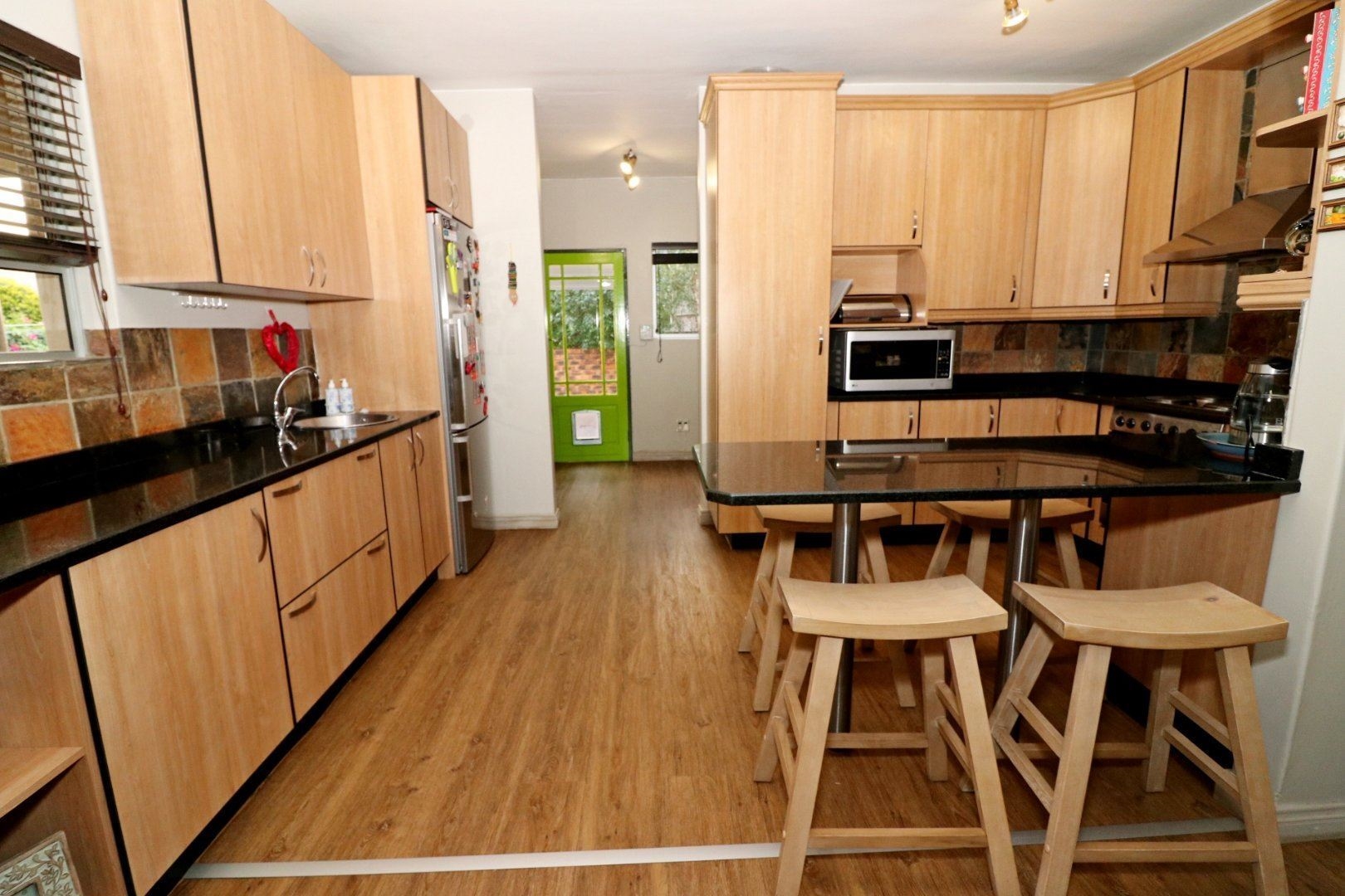 It offers a large entertainment area with built in braai that overlooks a beautiful sparkling pool and a beautiful manicured garden.