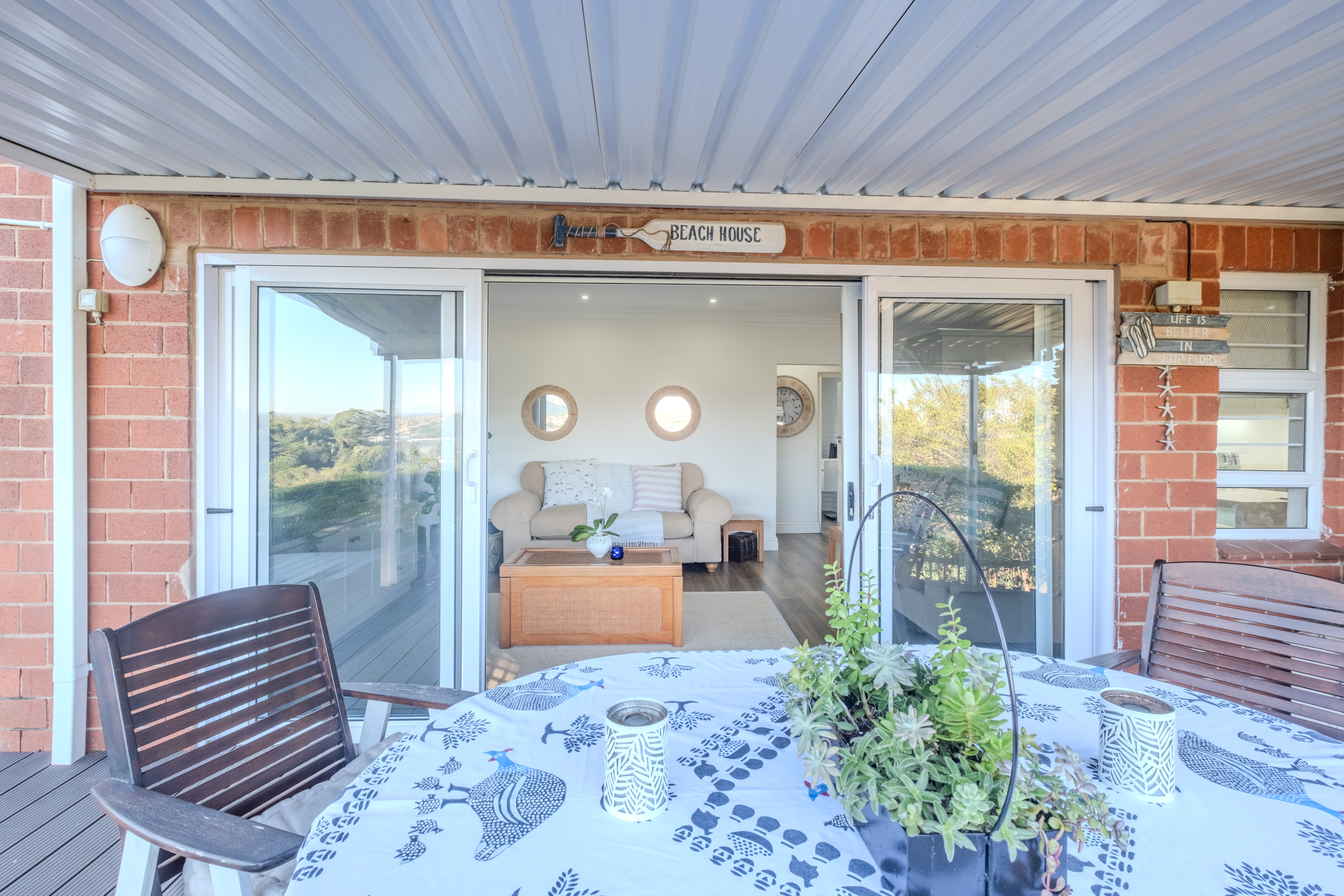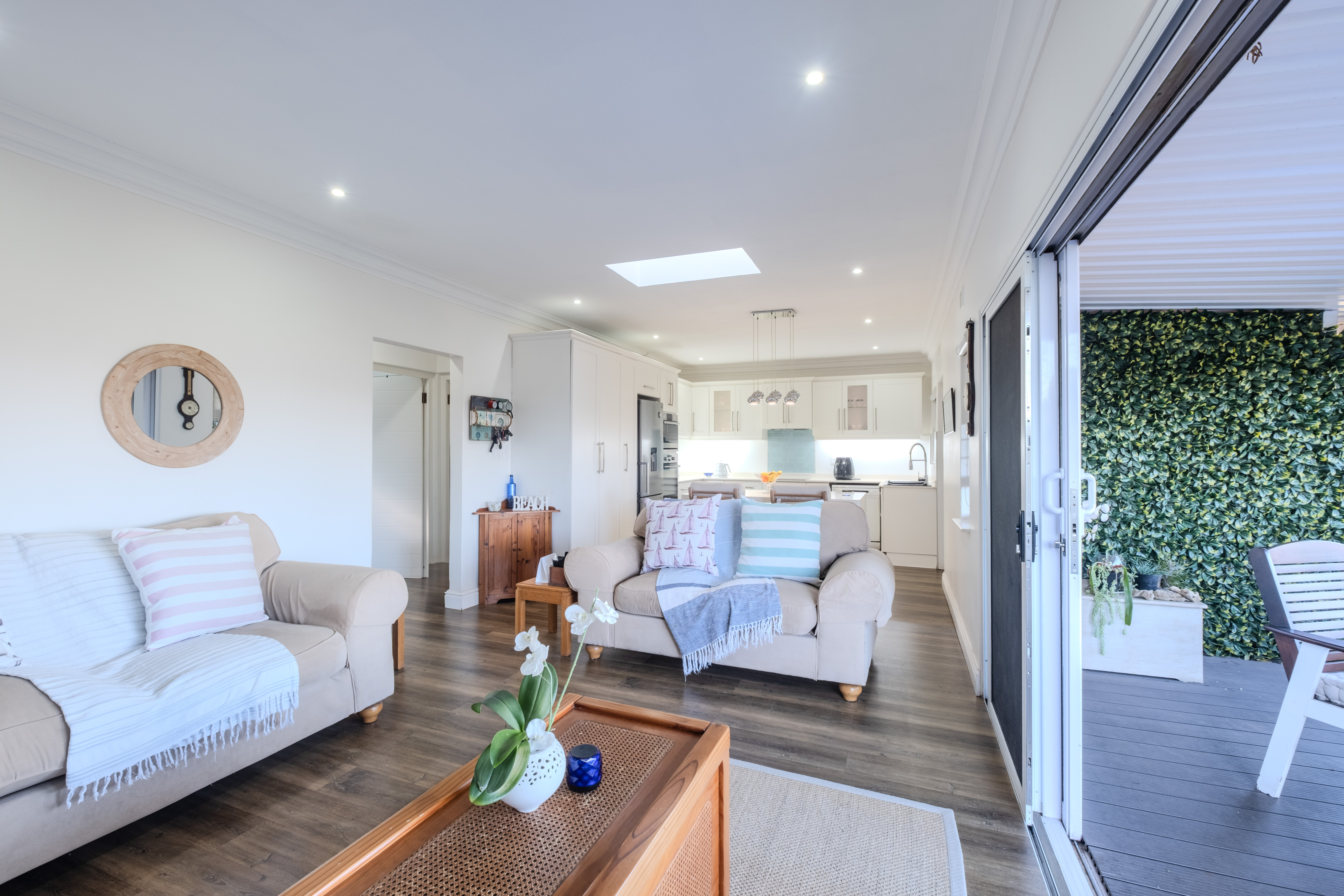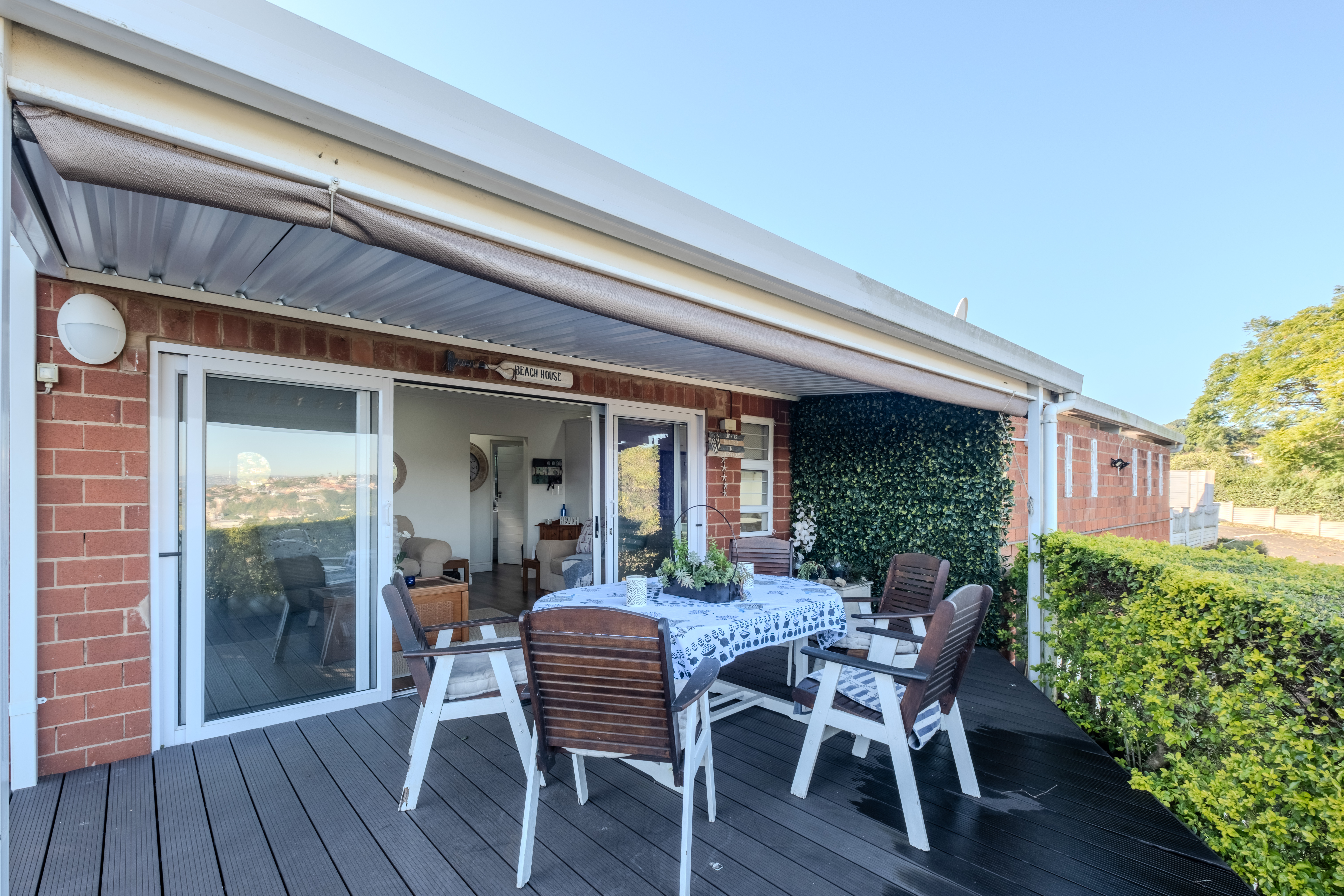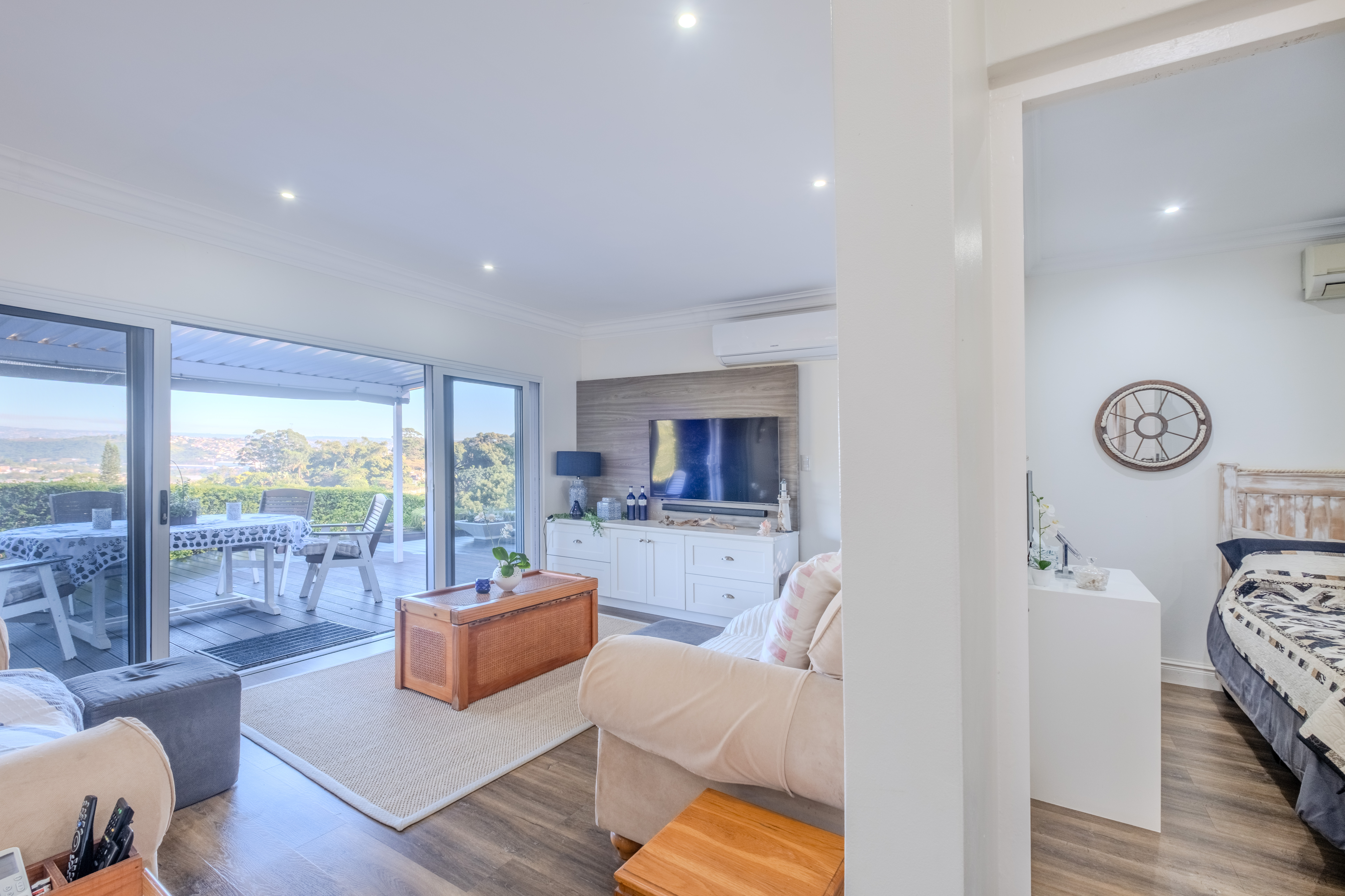 The heart of the home is a seamless living area, cooled by a powerful 28,000 BTU split-cycle air conditioner and bathed in sunlight from a well-positioned skylight. Glass sliding doors—protected by a fitted Trellidoor security screen—open onto a generously sized, partially covered patio and elevated Ecowood deck, offering breathtaking inland views. The low-maintenance Ecowood decking comes with a 20-year guarantee, and the private splash pool is an inviting retreat on warm summer days.