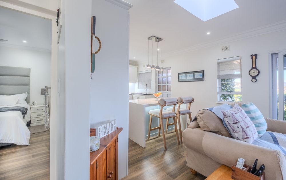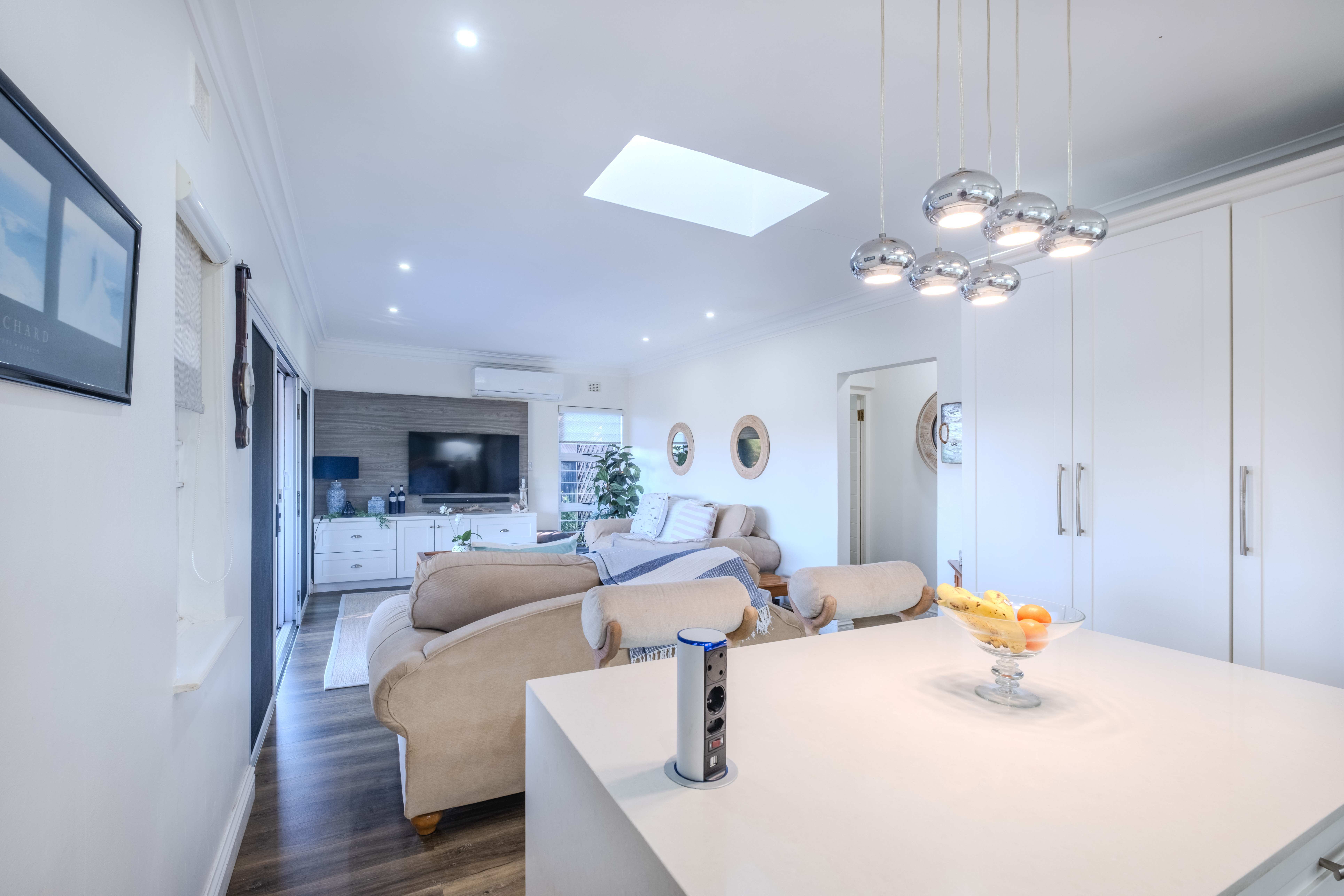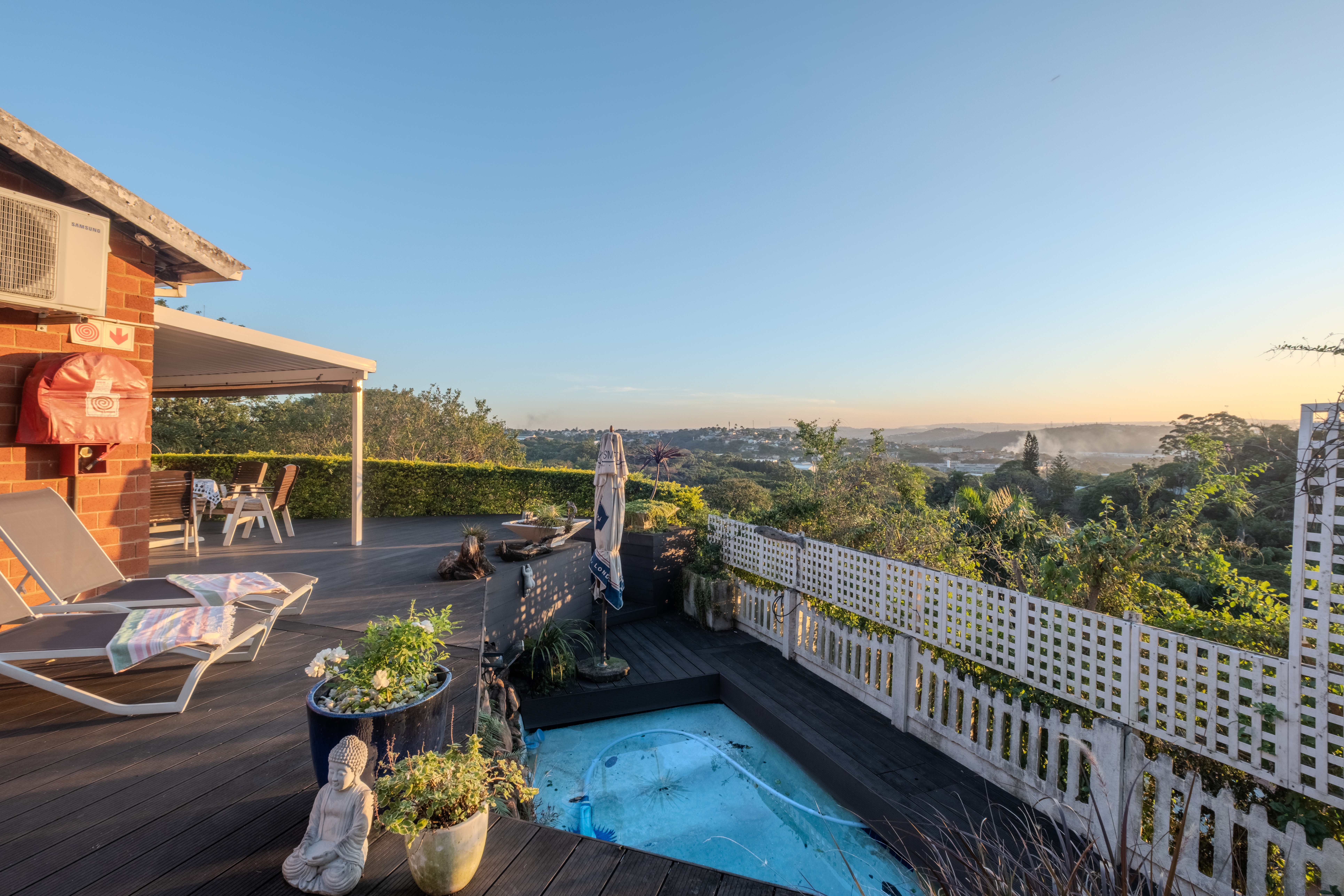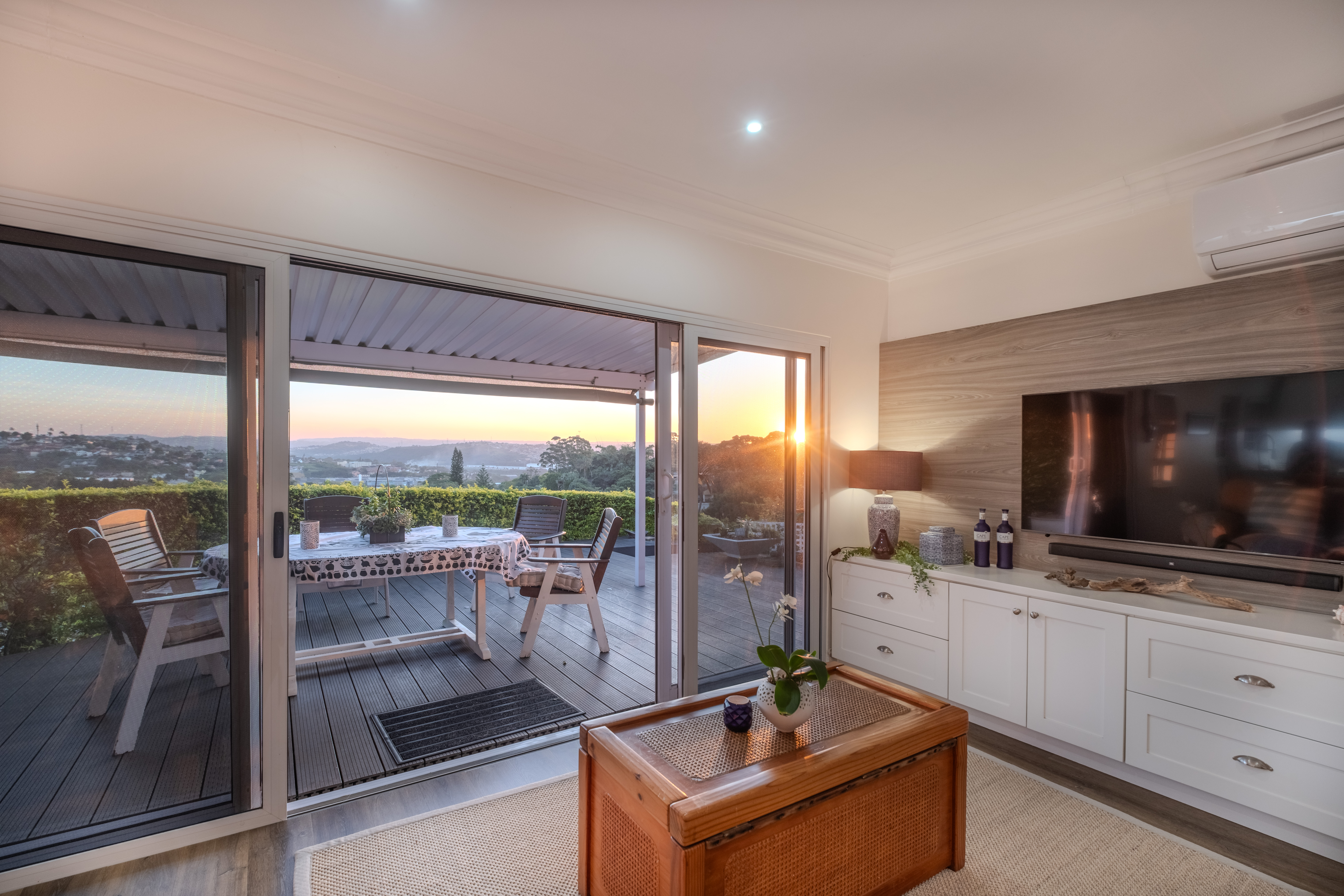 The heart of the home is a seamless living area, cooled by a powerful 28,000 BTU split-cycle air conditioner and bathed in sunlight from a well-positioned skylight. Glass sliding doors—protected by a fitted Trellidoor security screen—open onto a generously sized, partially covered patio and elevated Ecowood deck, offering breathtaking inland views. The low-maintenance Ecowood decking comes with a 20-year guarantee, and the private splash pool is an inviting retreat on warm summer days.