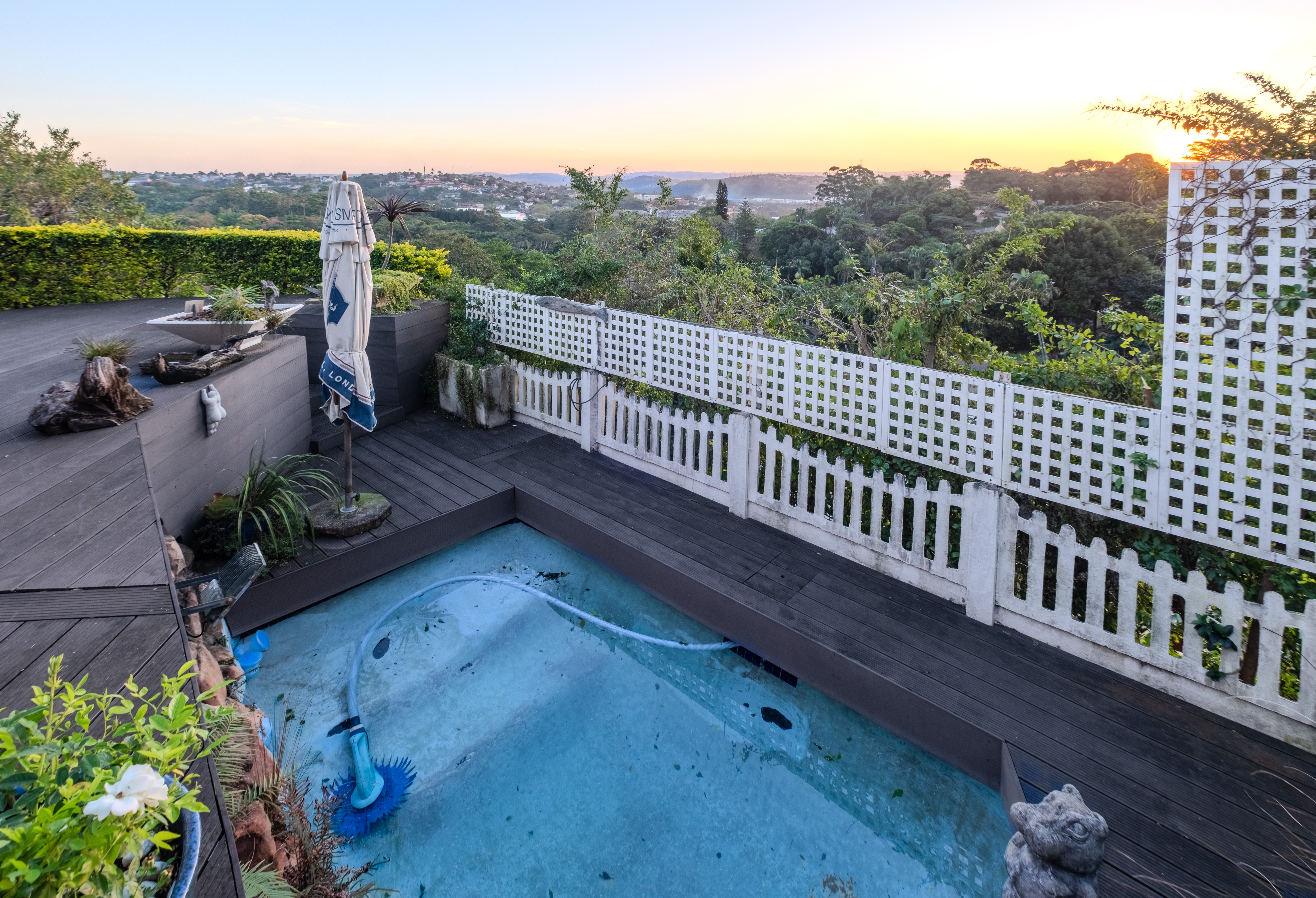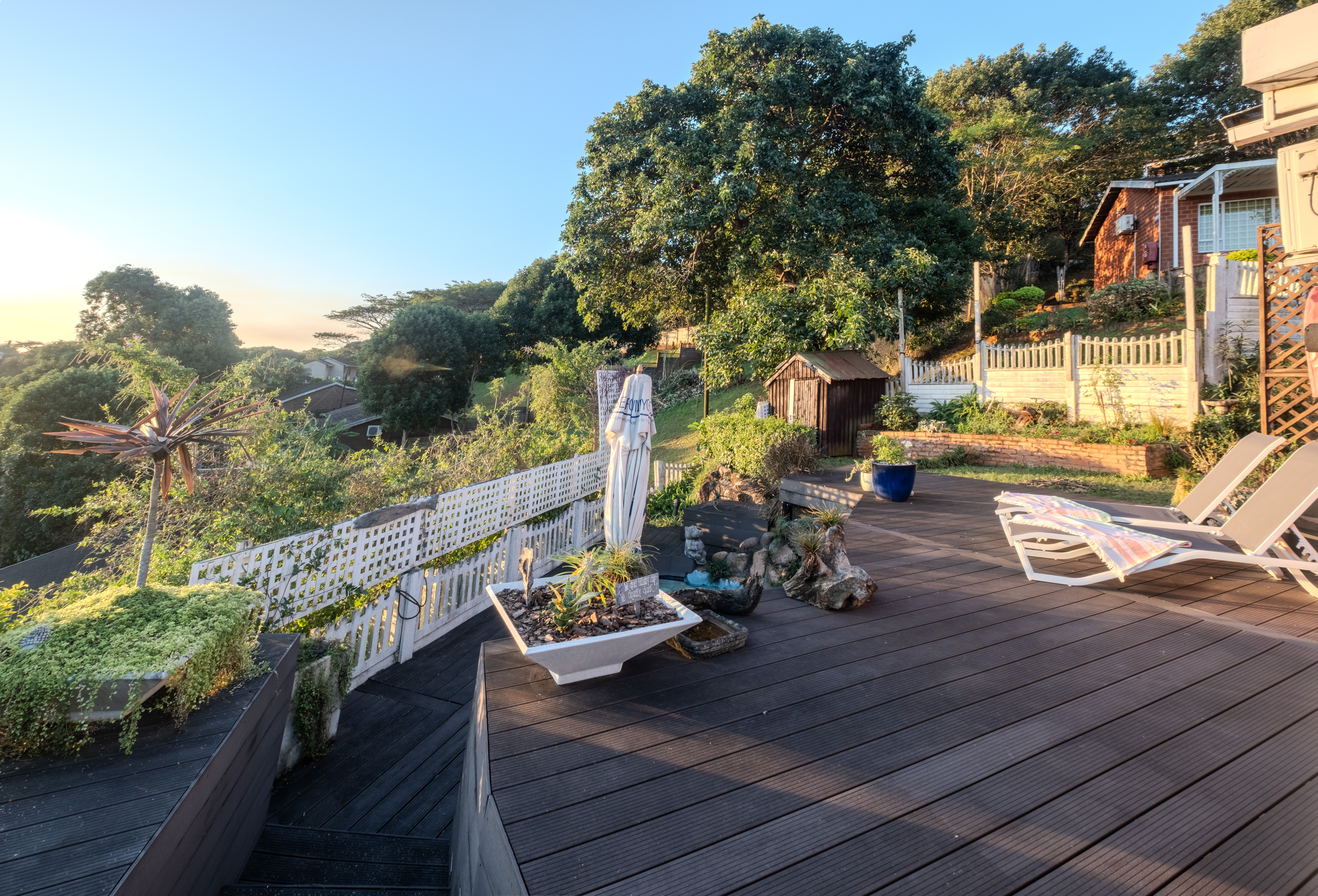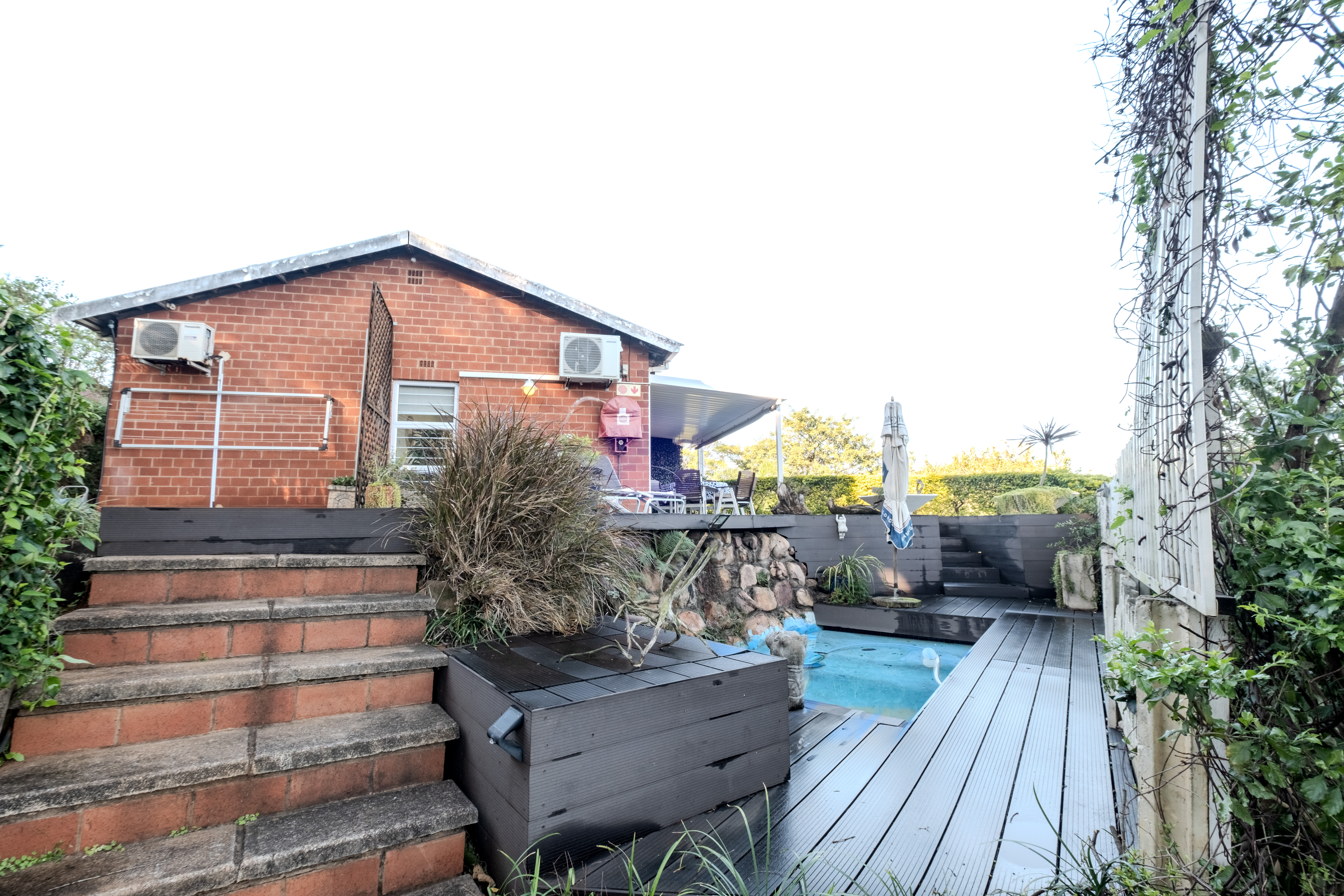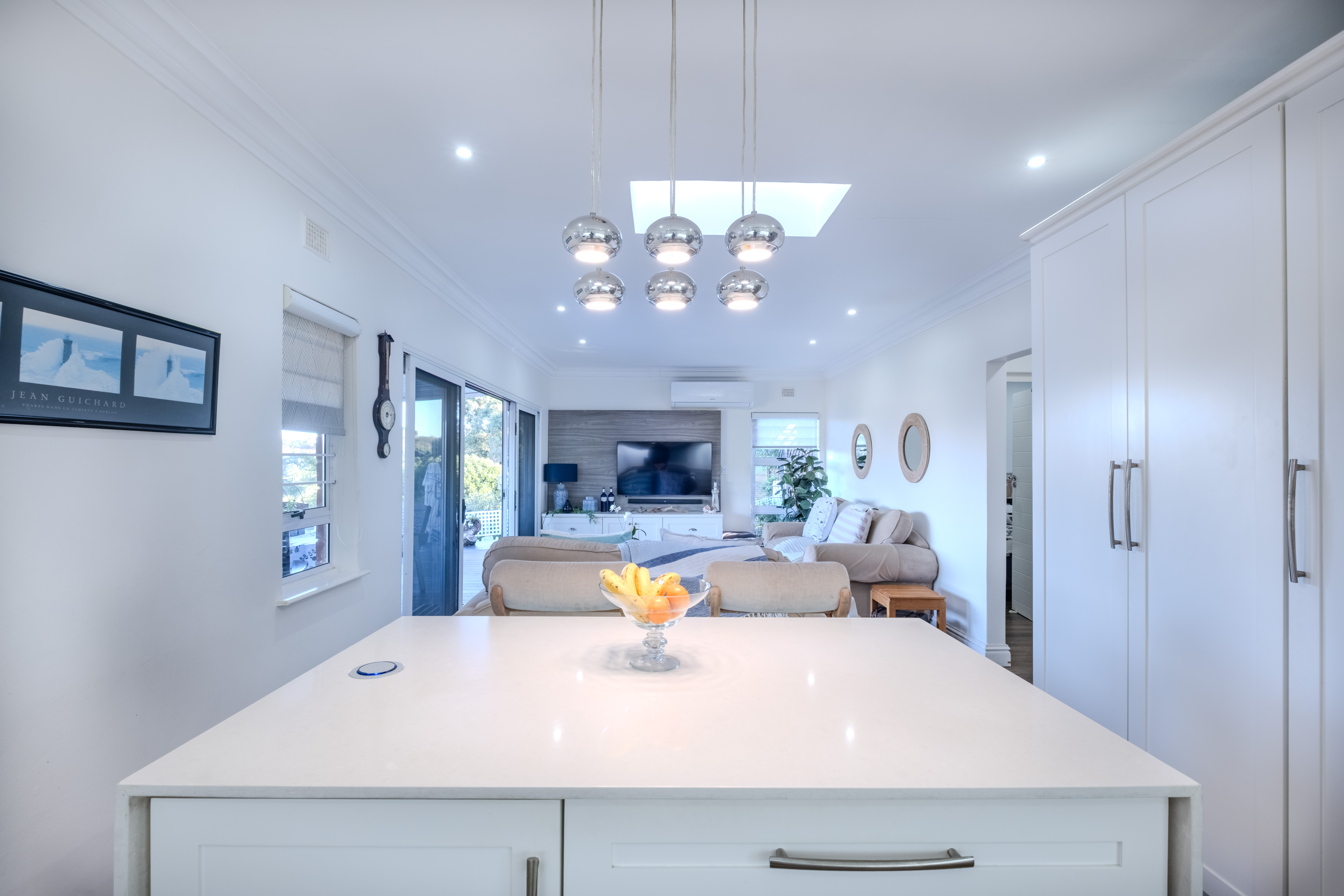 The heart of the home is a seamless living area, cooled by a powerful 28,000 BTU split-cycle air conditioner and bathed in sunlight from a well-positioned skylight. Glass sliding doors—protected by a fitted Trellidoor security screen—open onto a generously sized, partially covered patio and elevated Ecowood deck, offering breathtaking inland views. The low-maintenance Ecowood decking comes with a 20-year guarantee, and the private splash pool is an inviting retreat on warm summer days.