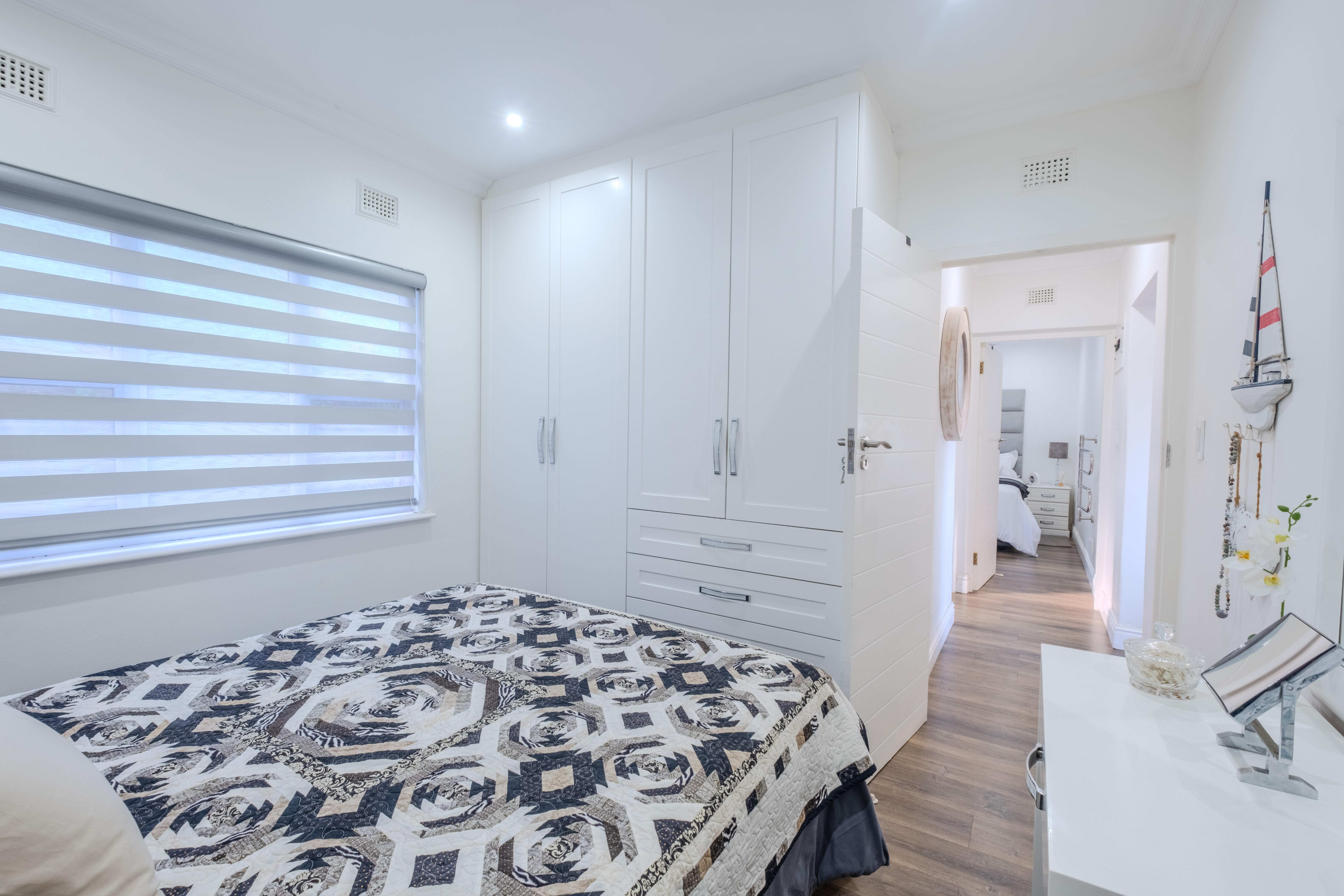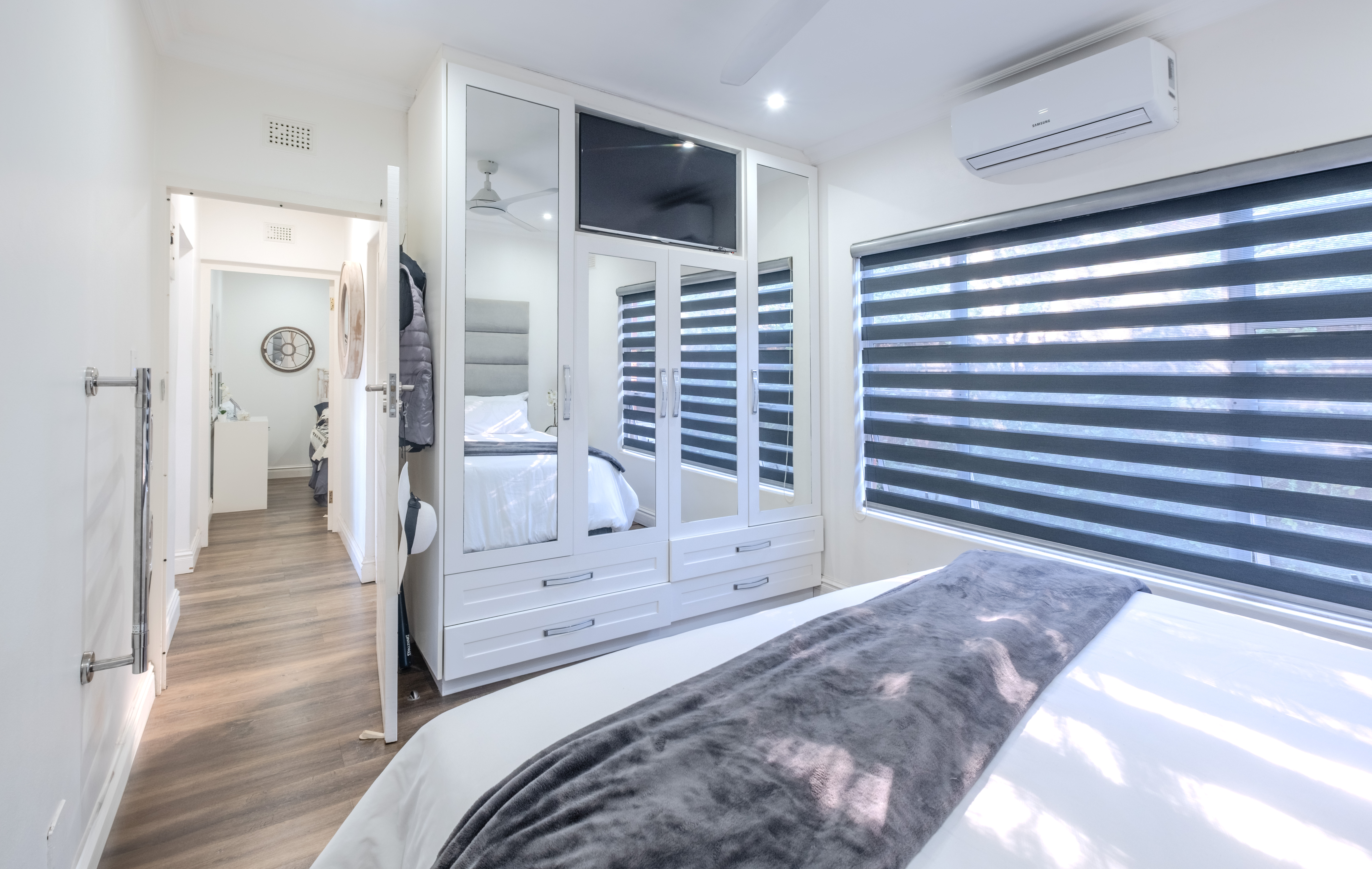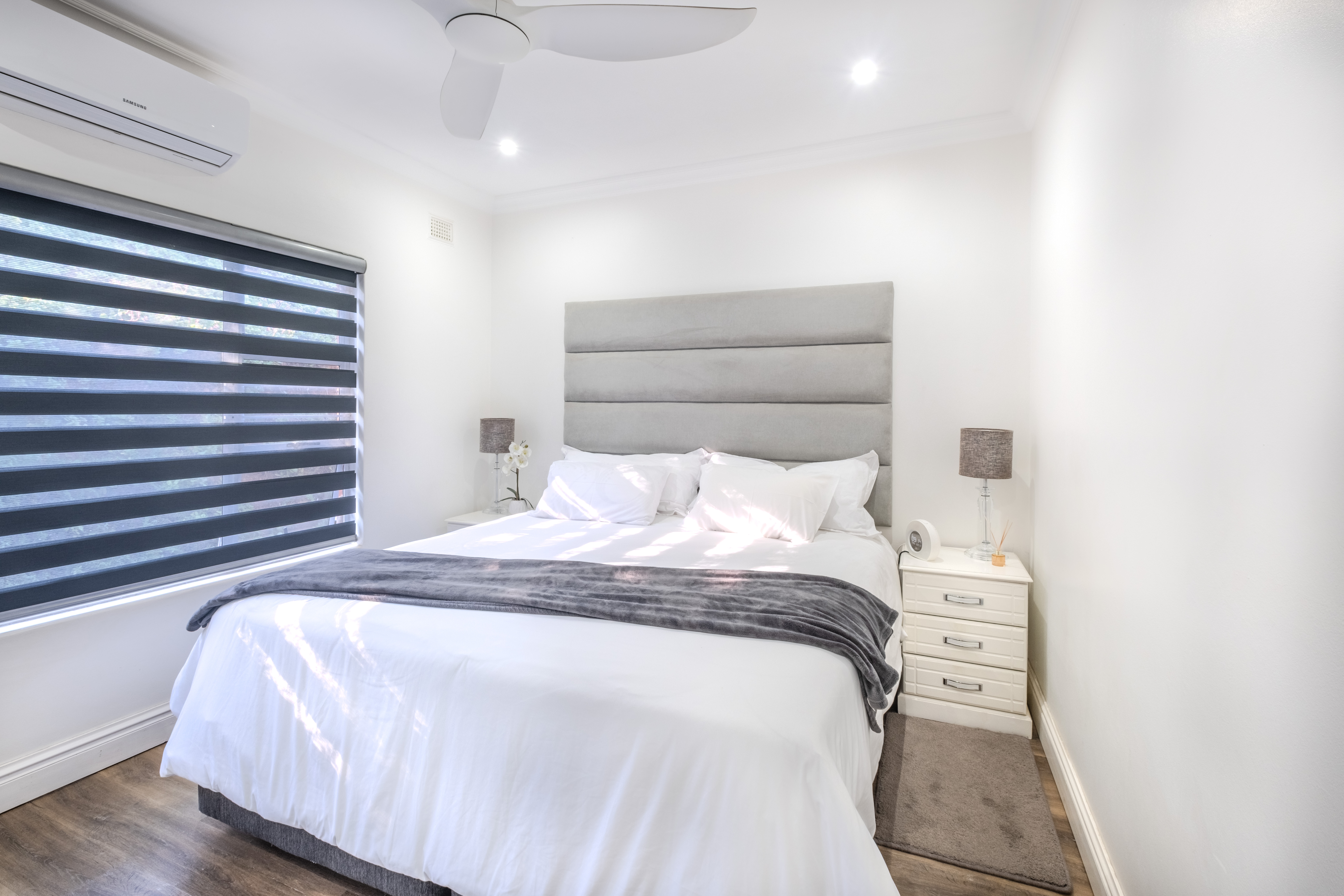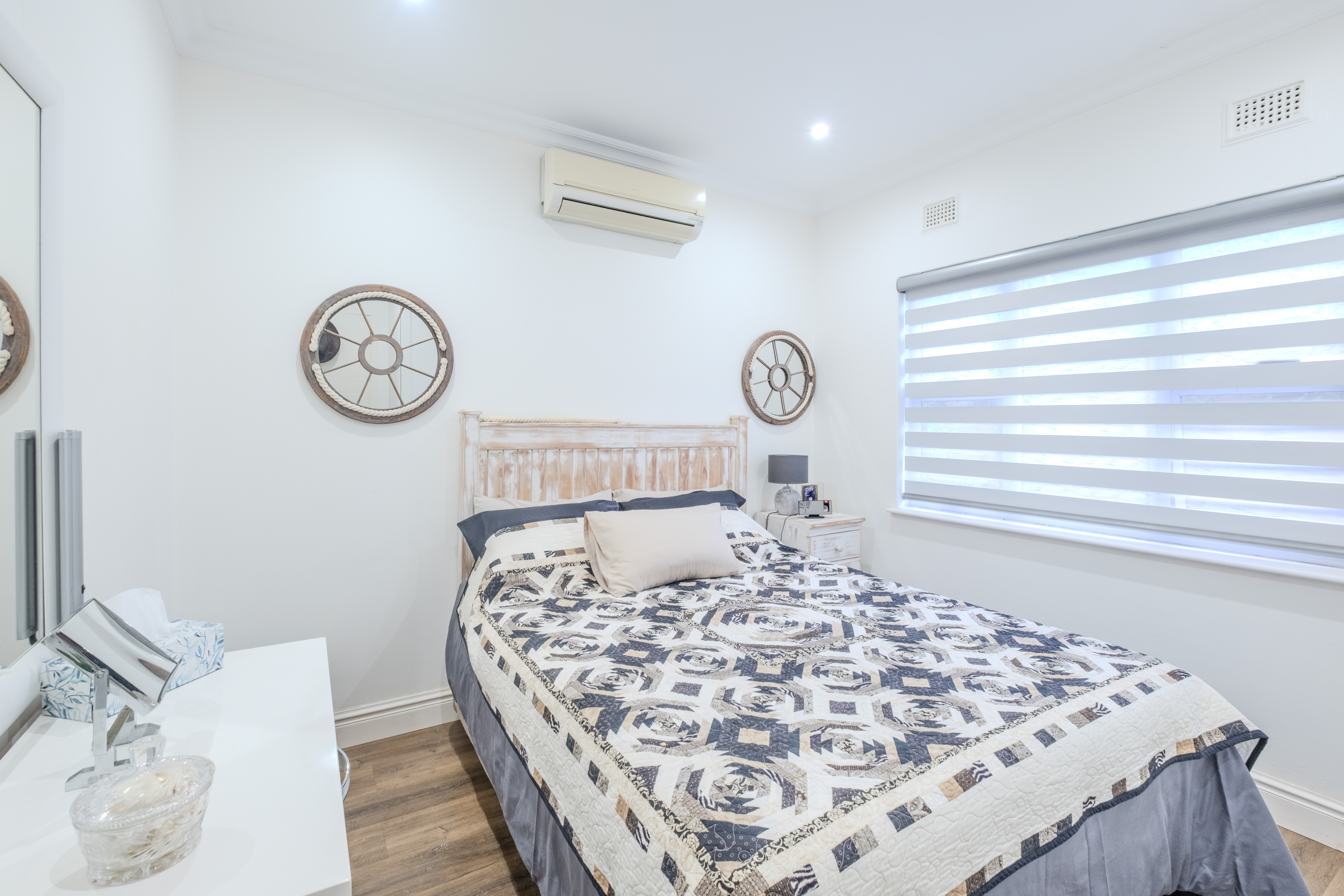 Both bedrooms are generously proportioned, fitted with built-in wardrobes and individual split-cycle air conditioning units for year-round comfort. The stylishly appointed bathroom includes a shower-over-tub combination, modern vanity, and toilet—all finished to a high standard.