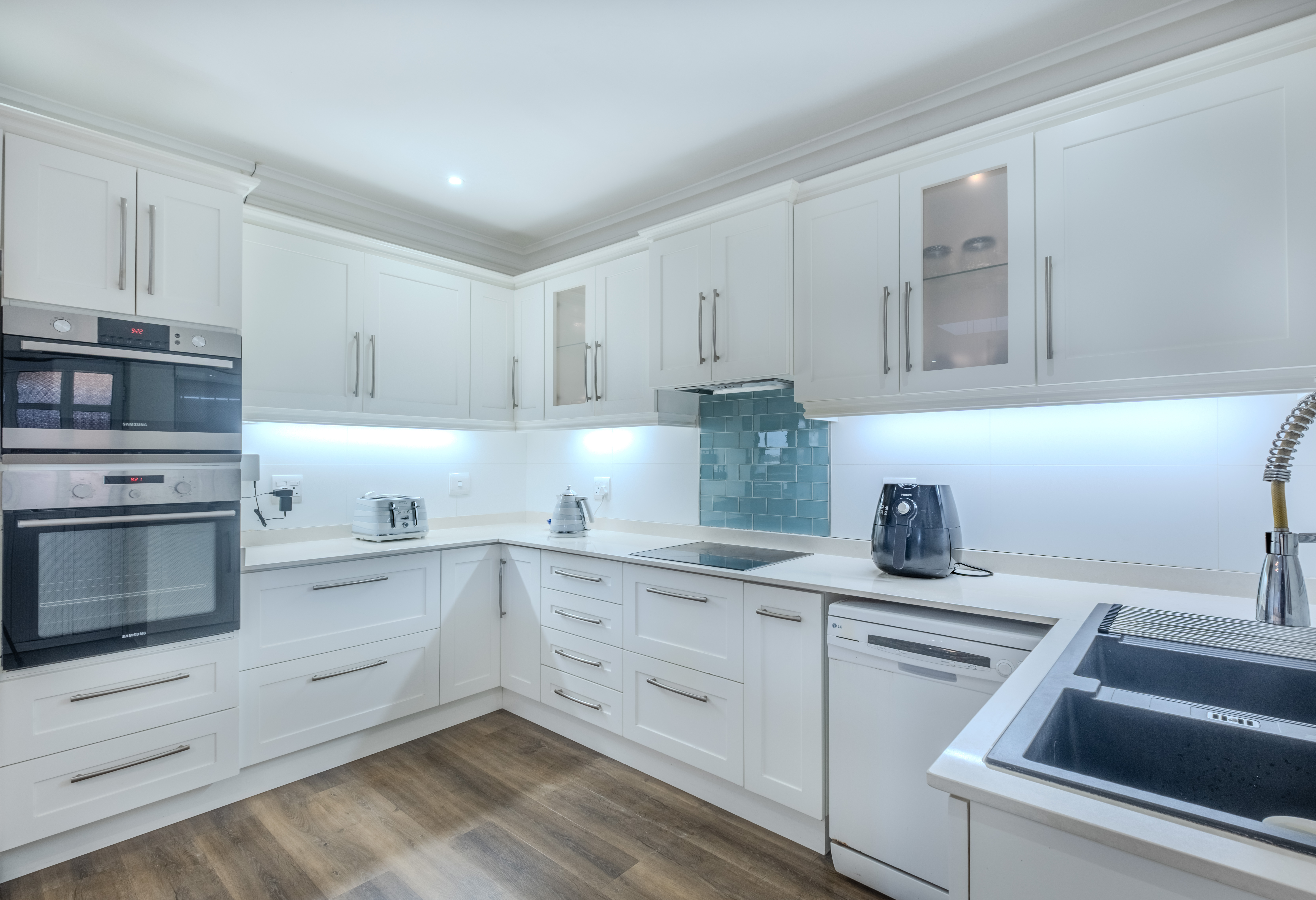 The custom-designed kitchen is a showstopper—crafted to perfection and sure to impress. It features a Smeg extractor with built-in air purifier, a sleek Samsung glass touch-screen stovetop, an integrated microwave/convection oven, and an eye-level oven—all seamlessly built into a striking, contemporary aesthetic. Adjacent is a fully equipped laundry room offering additional storage and functionality.
