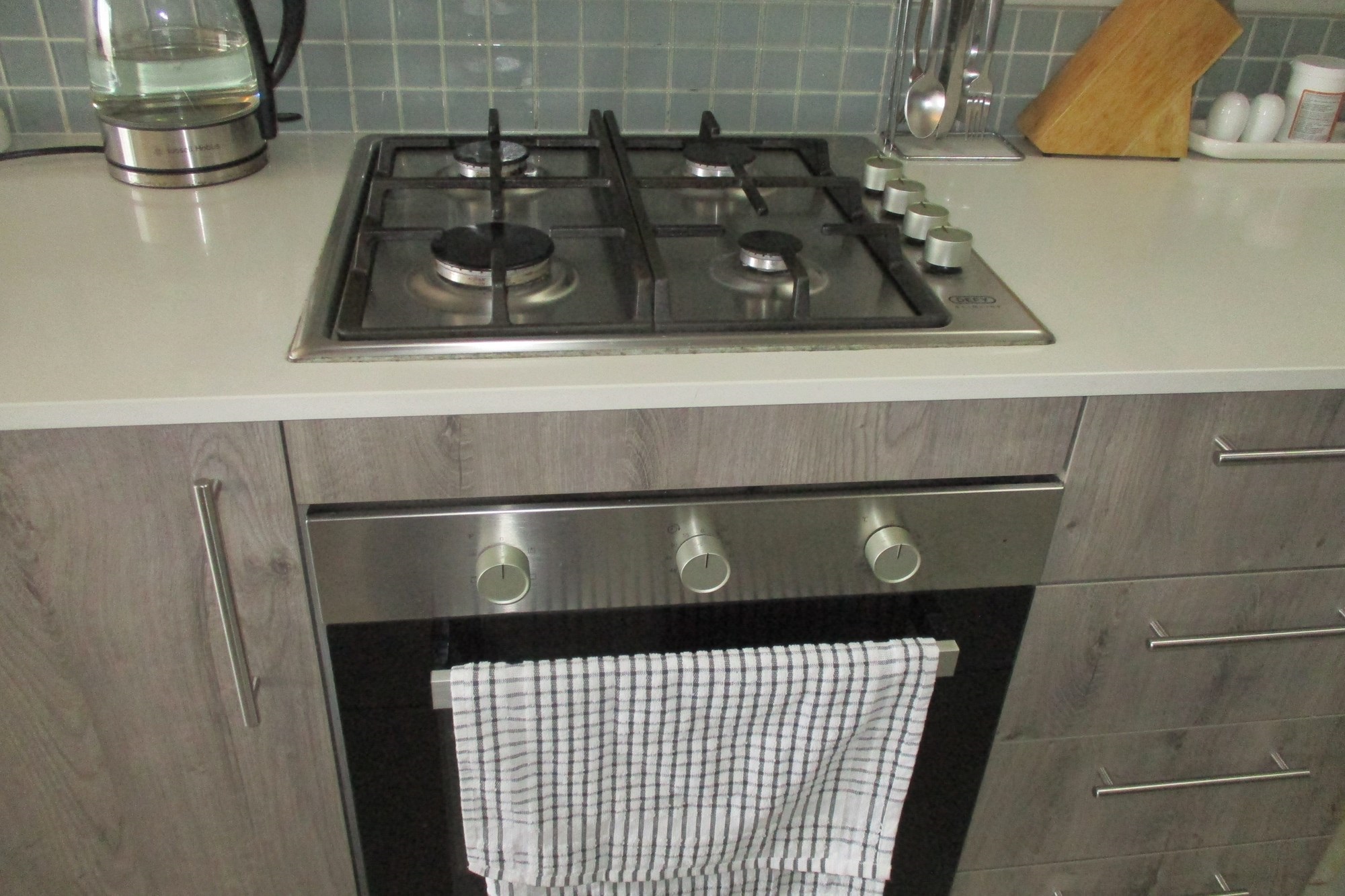 The well-appointed kitchen includes a gas hob, under-counter oven, and extractor fan, catering to all your culinary needs. Each of the two bedrooms comes equipped with built-in cupboards, ensuring ample storage space. The main bedroom features an en-suite bathroom, while a full second bathroom serves the rest of the home.