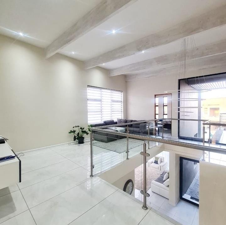 The ground floor also includes a convenient guest bedroom with a sliding door that opens to a refreshing pool area, offering the perfect blend of indoor and outdoor living. The dining area flows seamlessly into an entertainment space complete with a built-in braai, ideal for hosting memorable family gatherings and celebrations.