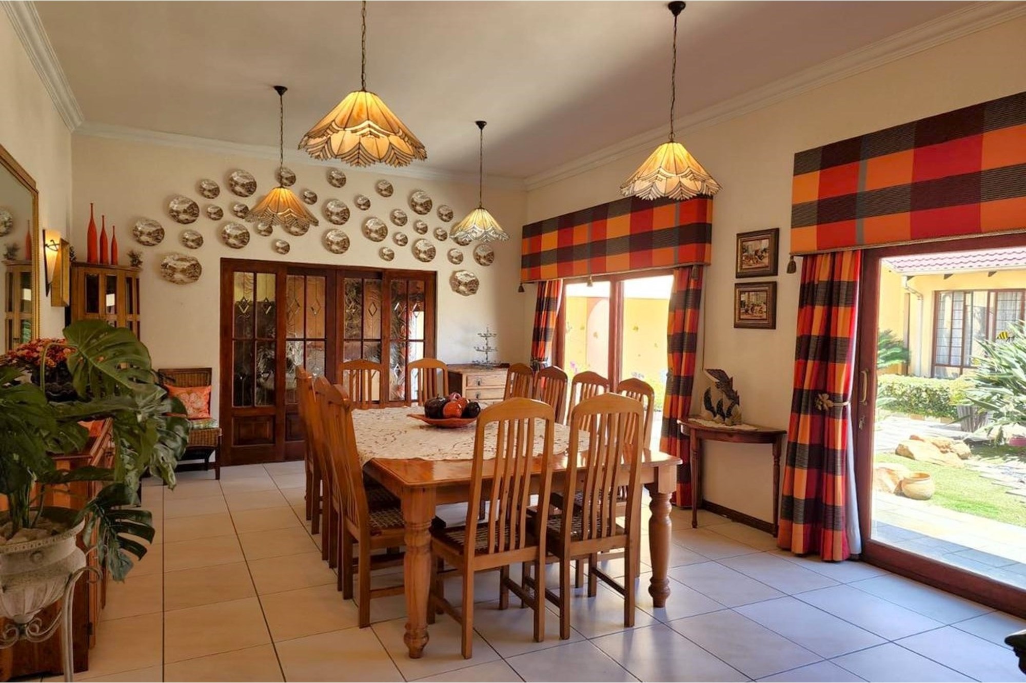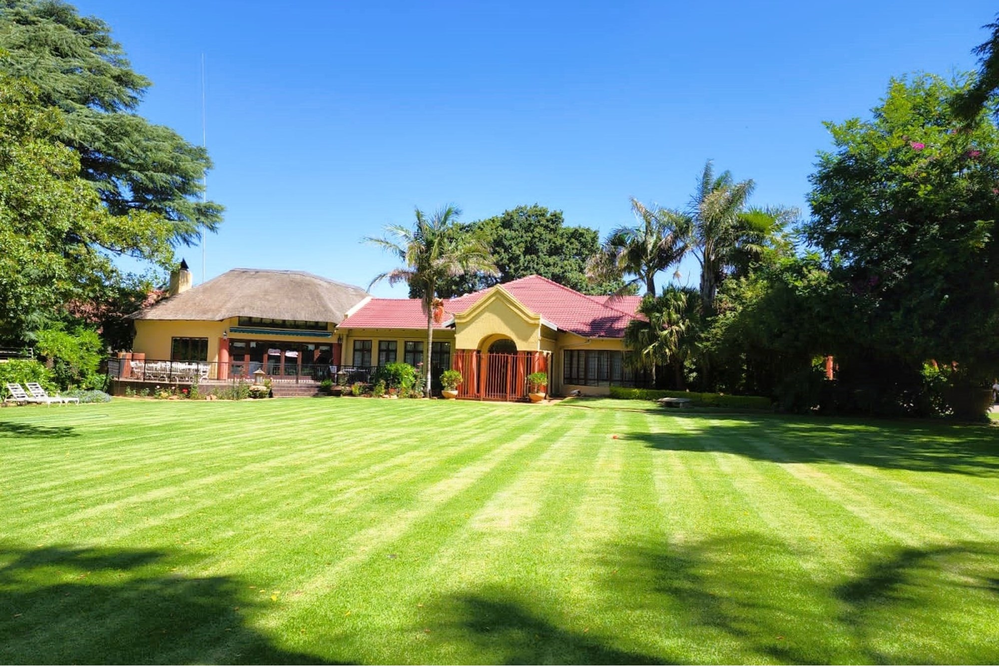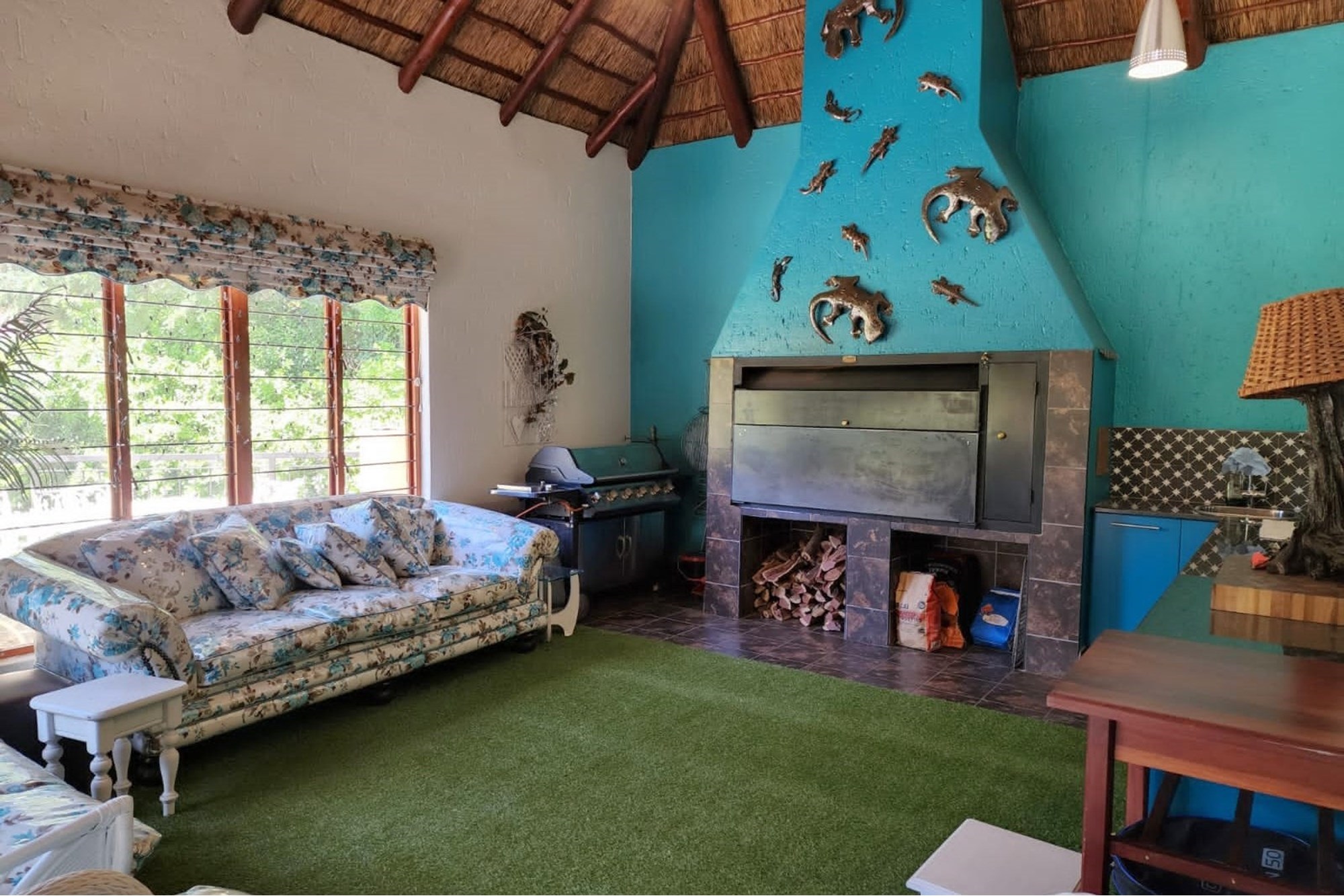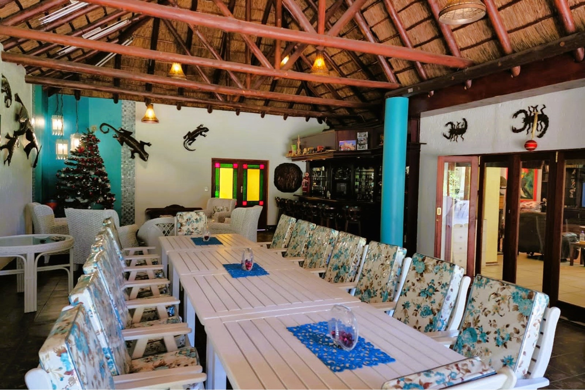 Thatched Entertainment area with built in braai, large dining area, full bar and patio overlooking the spectacular garden.