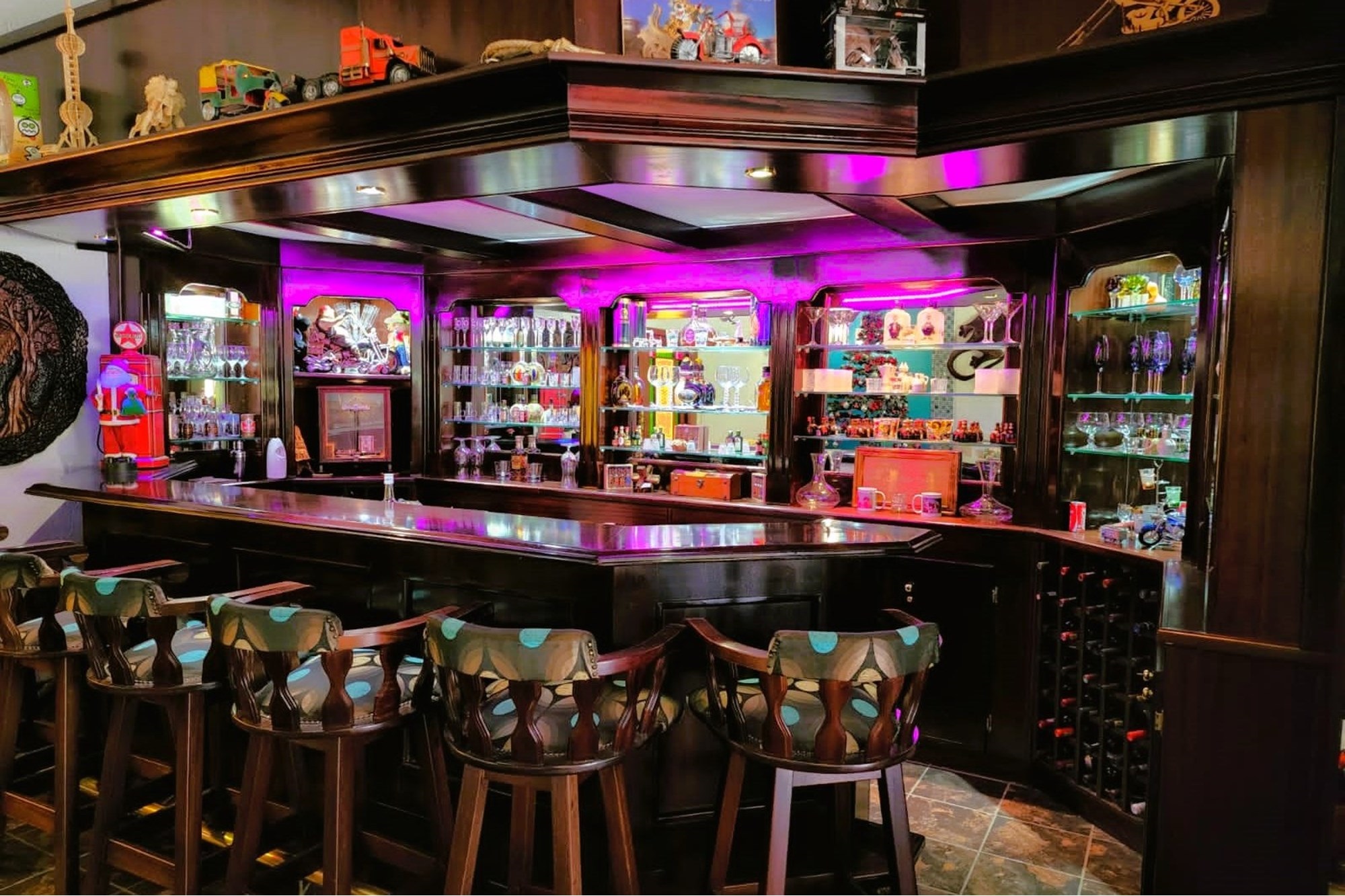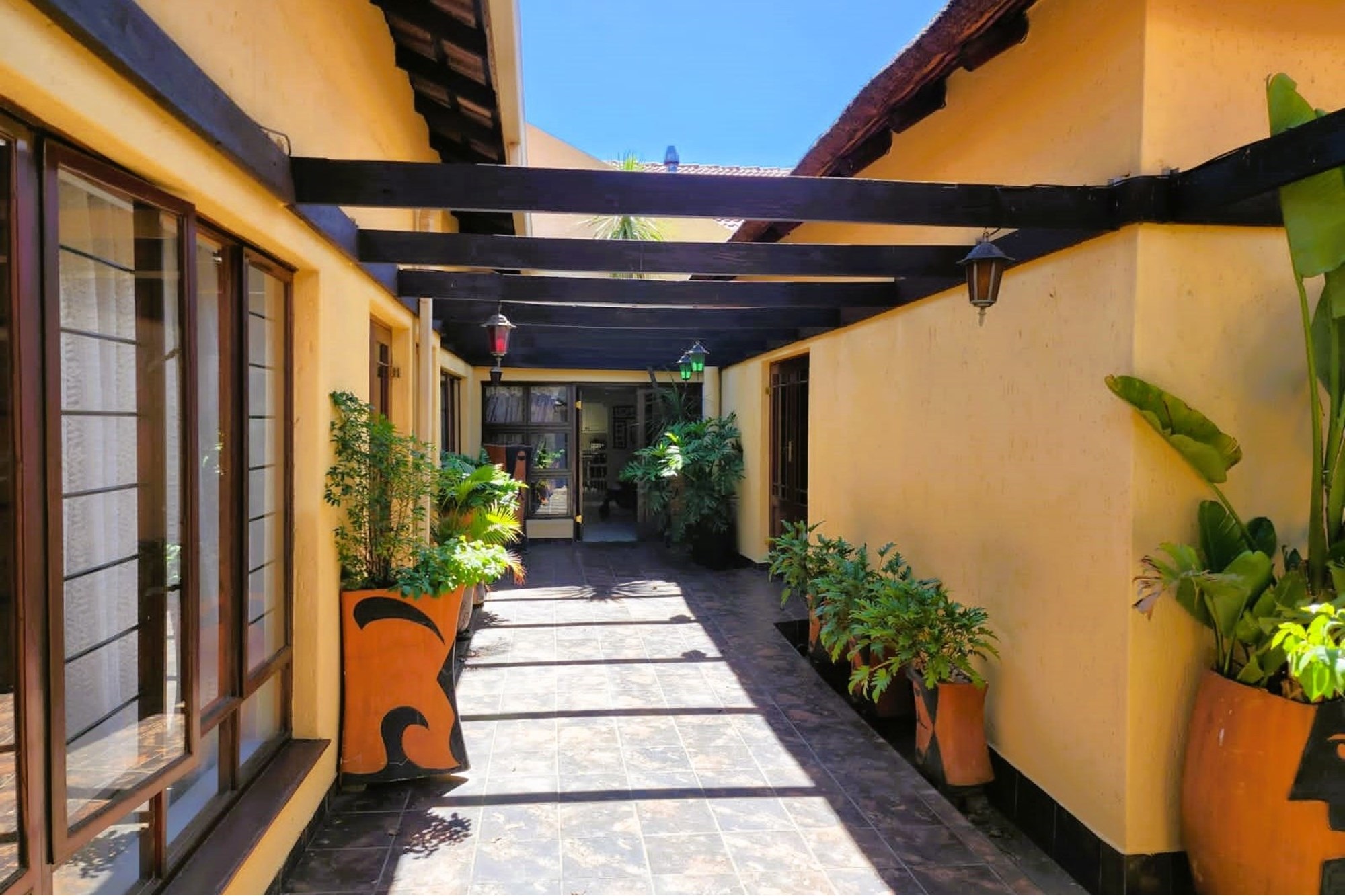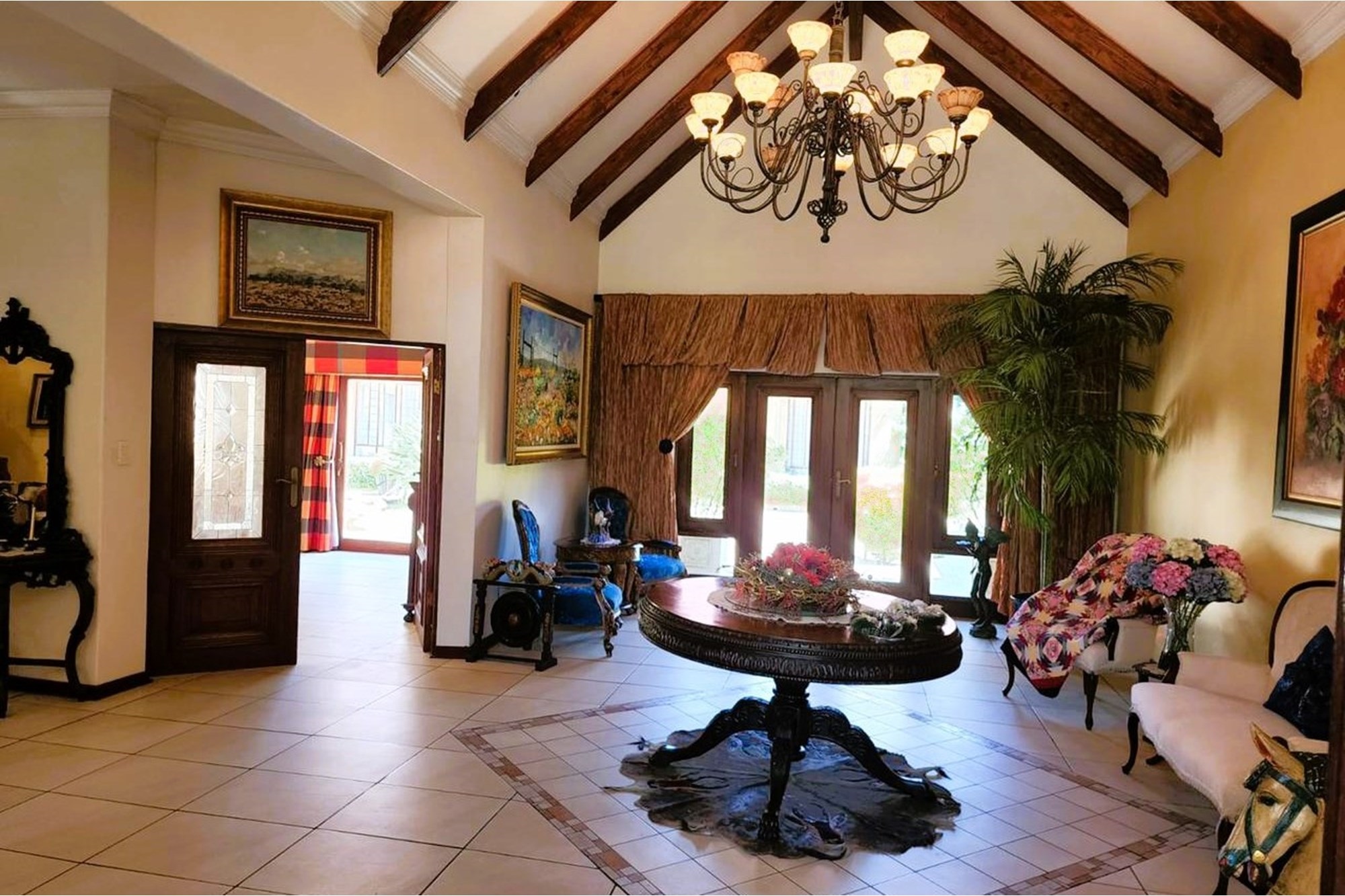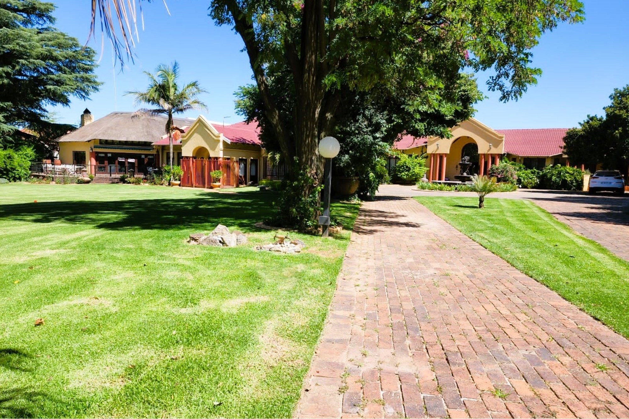Thatched Entertainment area with built in braai, large dining area, full bar and patio overlooking the spectacular garden.