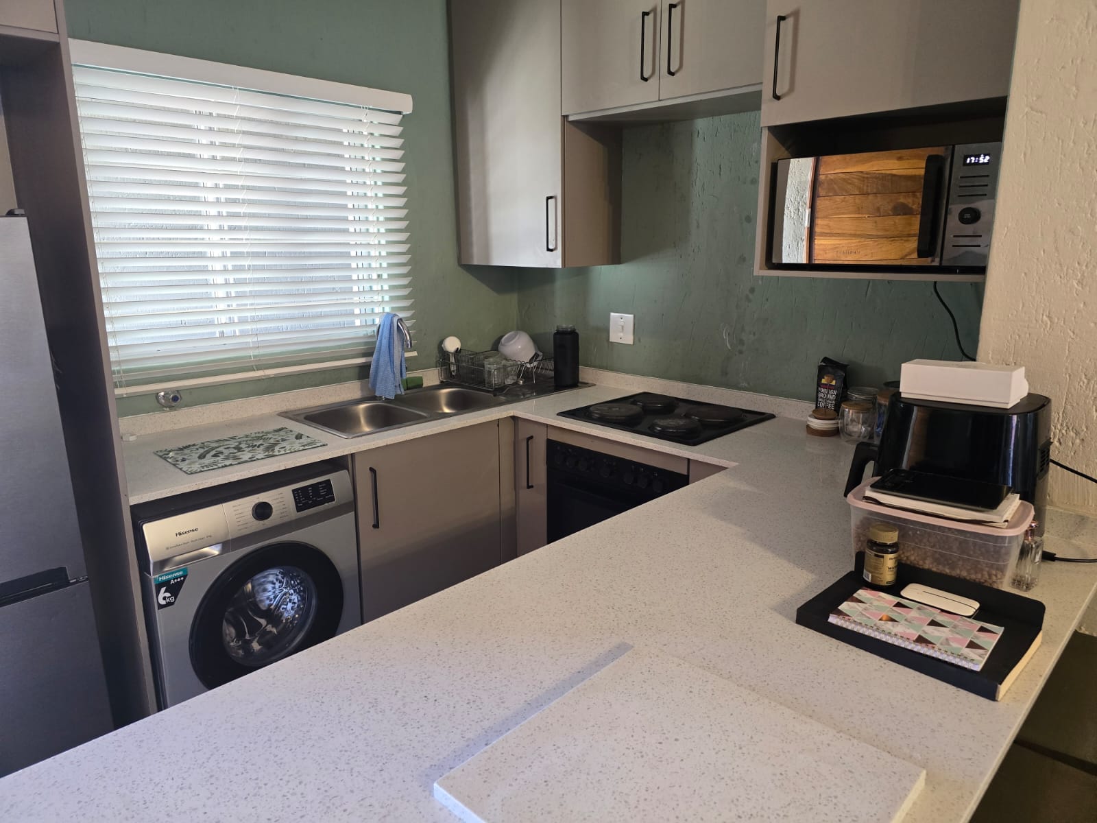 Gourmet kitchen with granite counter tops, eat-in counter, ample wrap-around cupboards, electric hob/oven, extractor fan, and space for one under counter appliance.