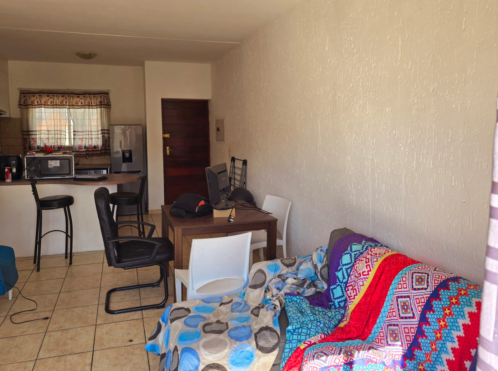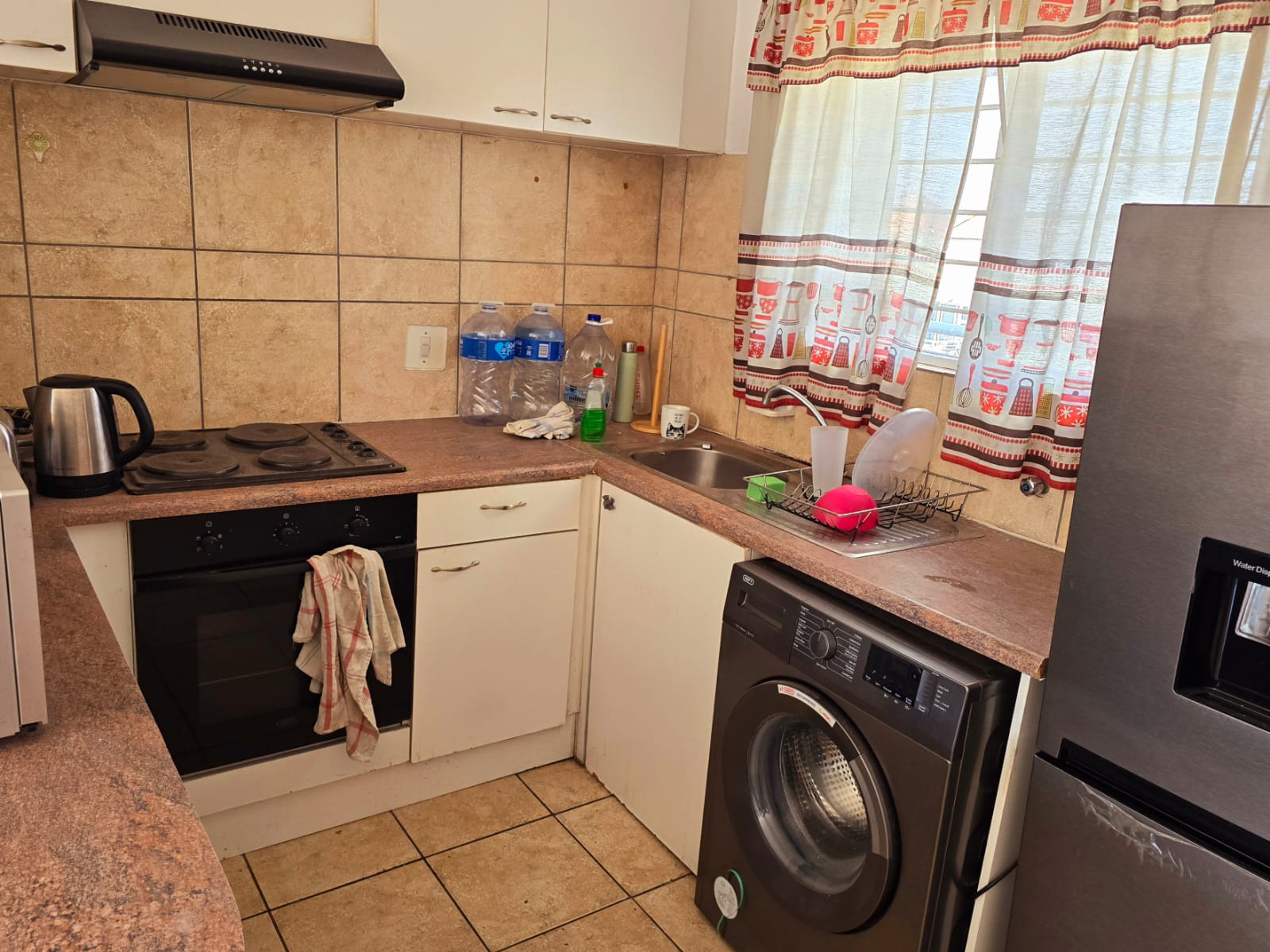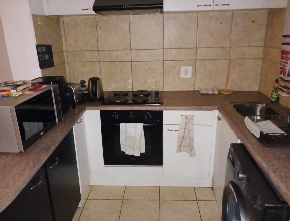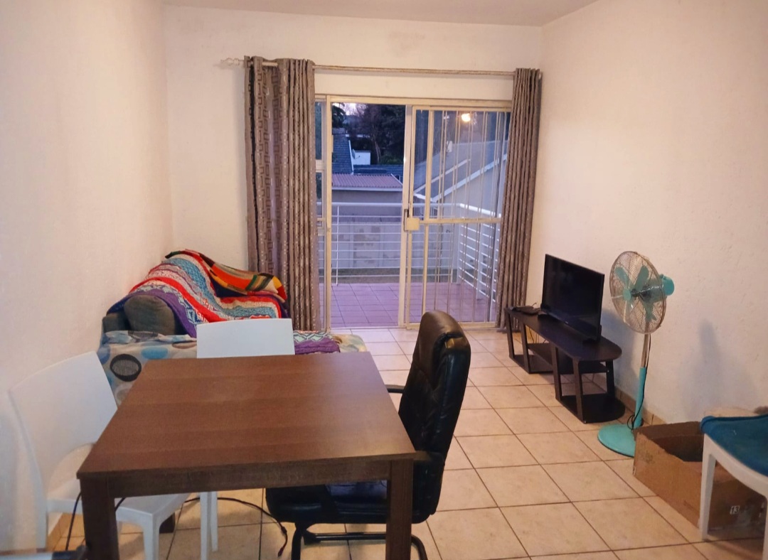 Featuring a generously sized bedroom equipped with built-in wardrobes and an en-suite bathroom that includes a bathtub, overhead shower, vanity, and toilet. The tidy kitchen offers ample counter space, a variety of wrap-around cupboards, an electric hob/oven, an extractor fan, and room for one under-counter appliance. The well-sized open-plan lounge and dining area seamlessly flows onto a spacious balcony, ideal for enjoying sunset drinks while taking in the stunning vistas.