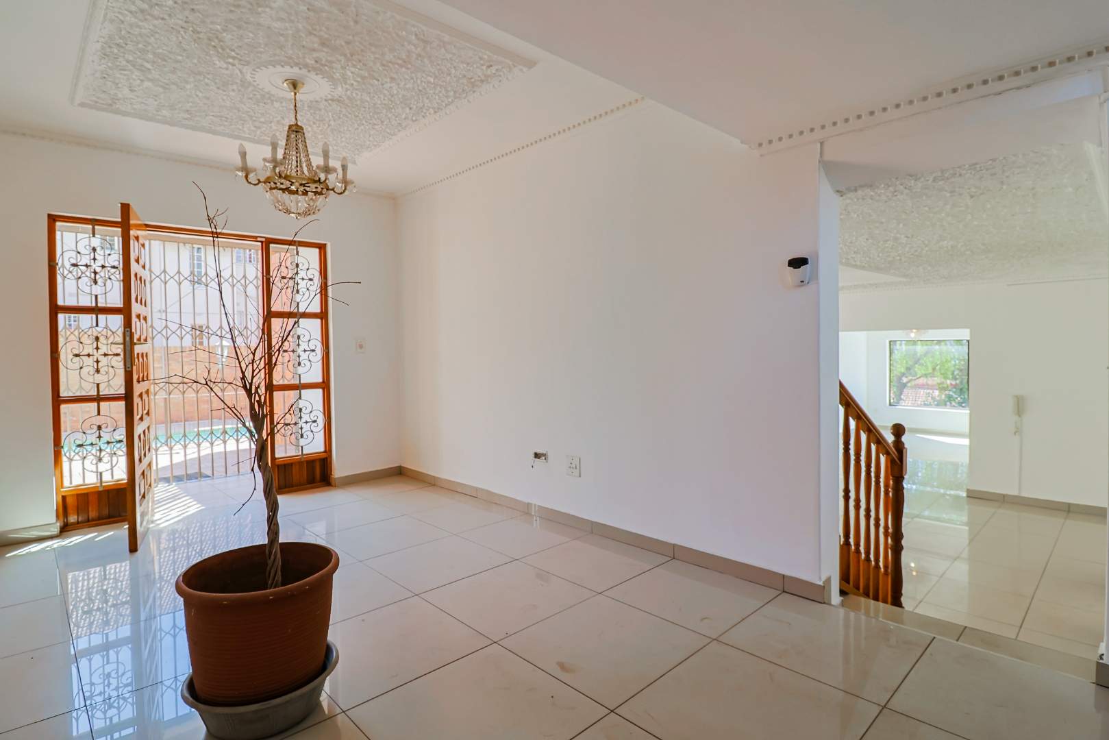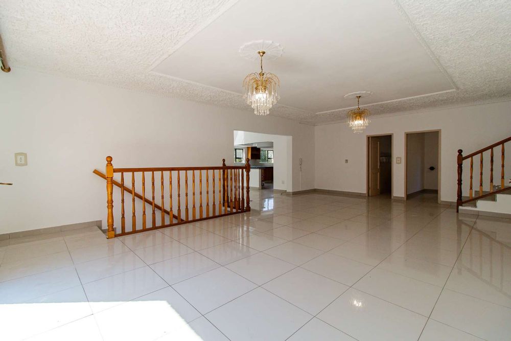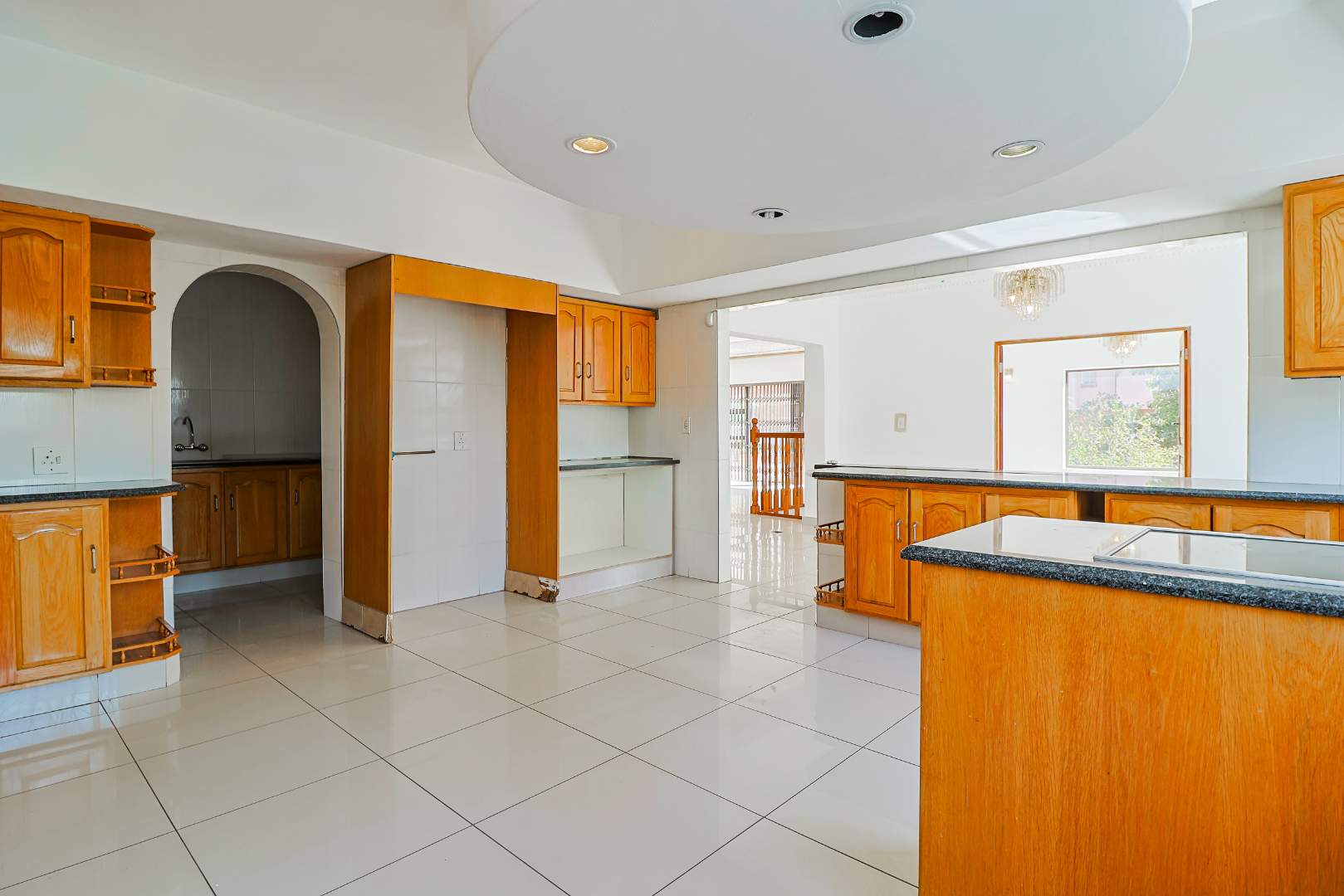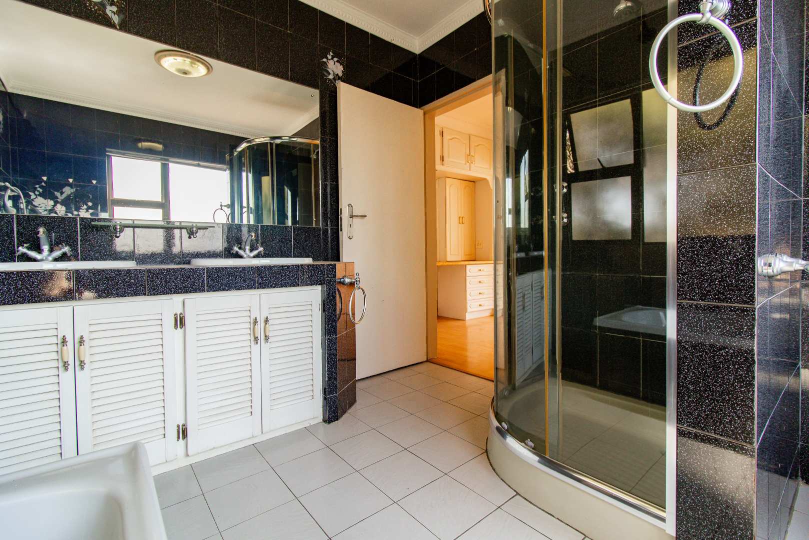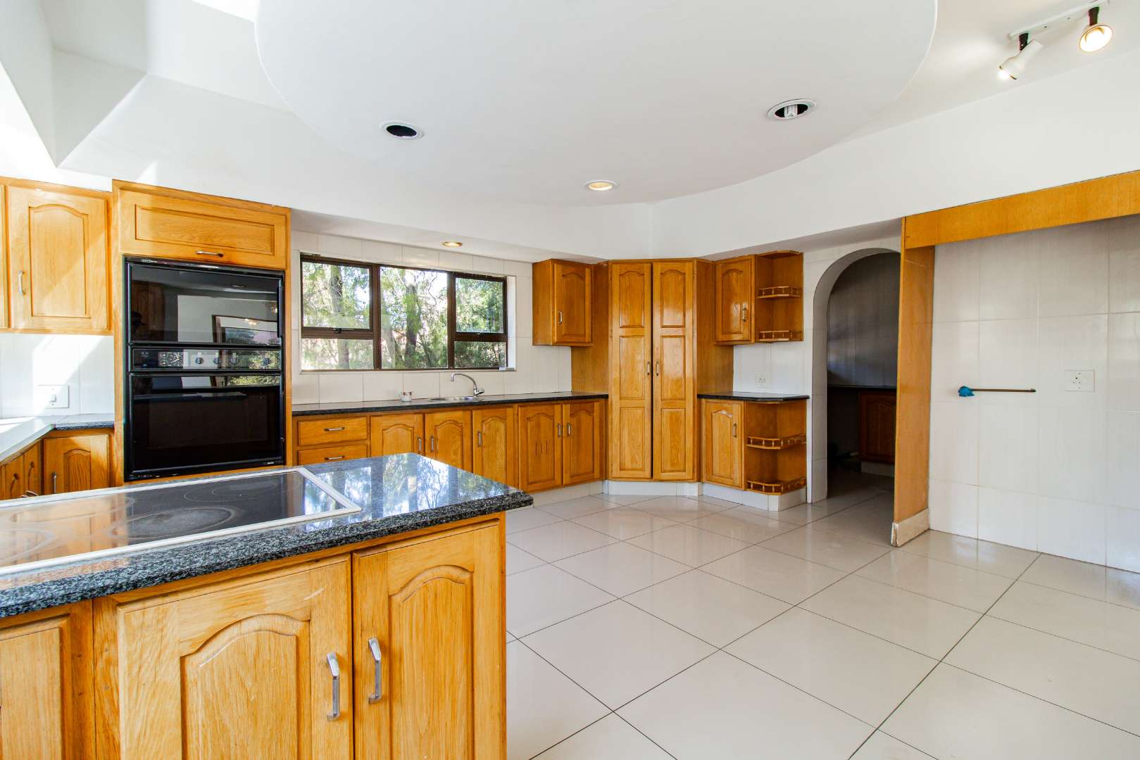 Additional features include three garages for ample parking, Trelli door security bars for peace of mind, and staff accommodation. The home is adorned with elegant porcelain tiles and solid wood balustrading, adding a touch of sophistication throughout.