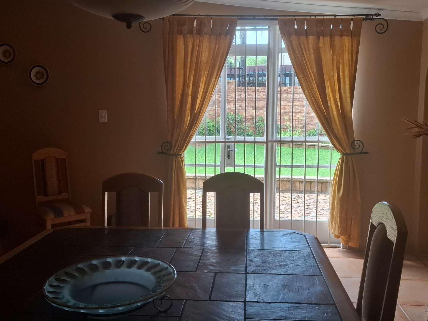 -Huge dining room with sliding doors leading to manicured garden