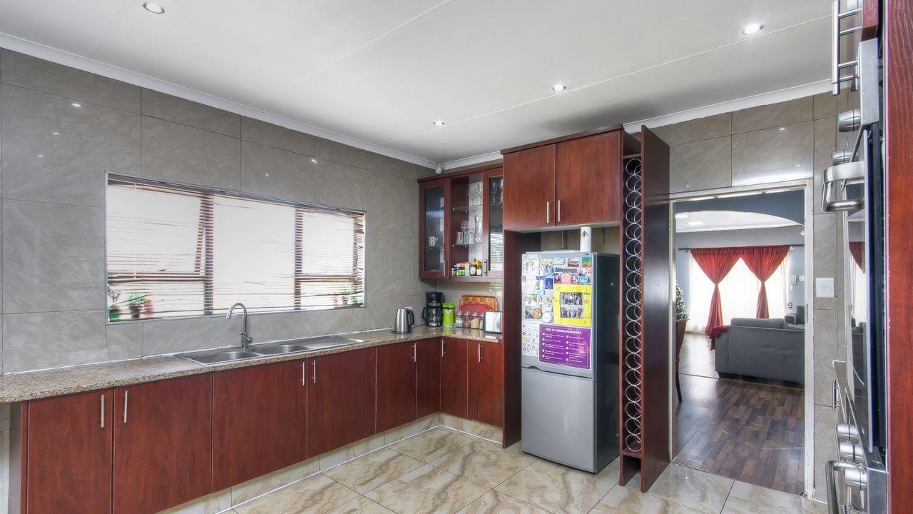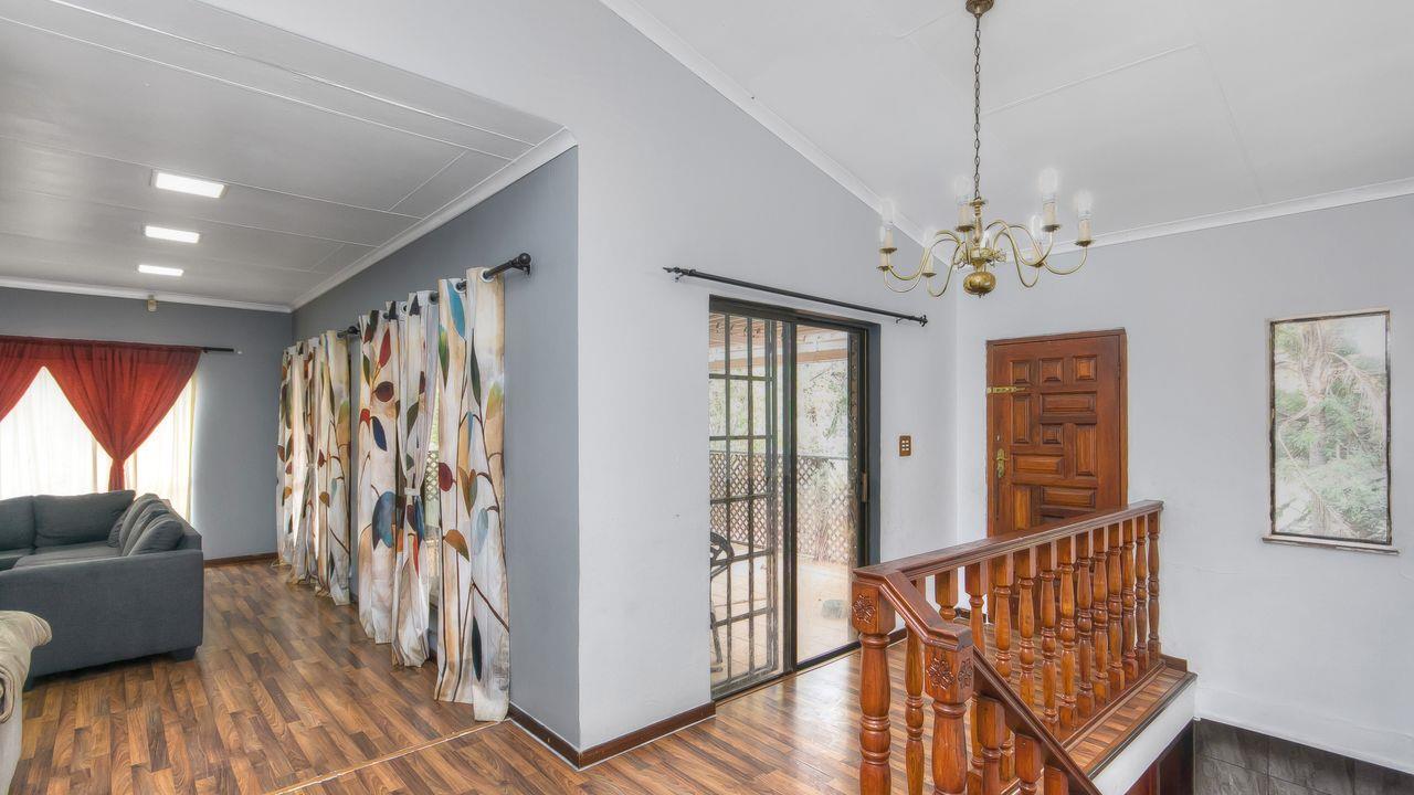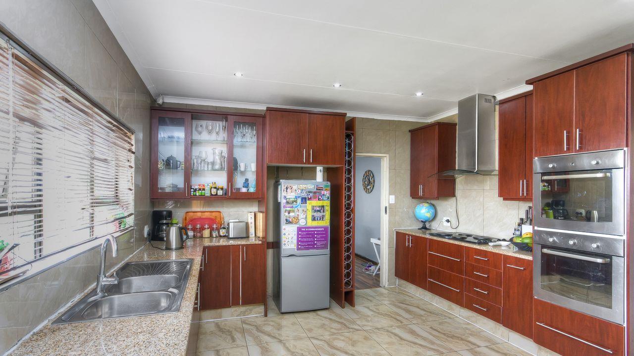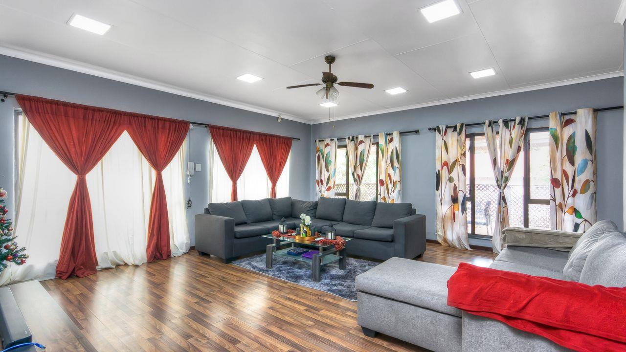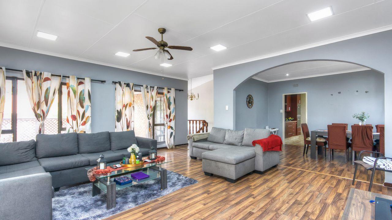 Beautiful 4 bedroom with BIC laminated floors, kitchen, and bathrooms are modern and tiled. Large garden with double garage ample parking space for plenty of cars, wendy house outside toilet. Entertainment area. The lounge leads onto stairs going down to the flatlet with own bathroom and sliding door onto the garden. The kitchen if fitted with plenty of cupboard space and space for an island if need be. The lounge leads onto a lovely wooden veranda with a view and security.