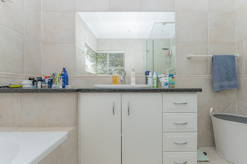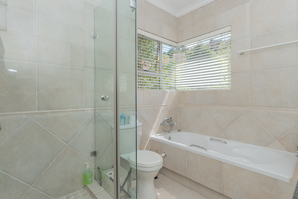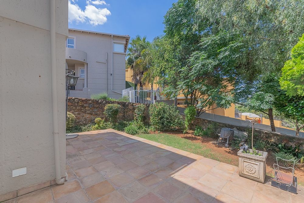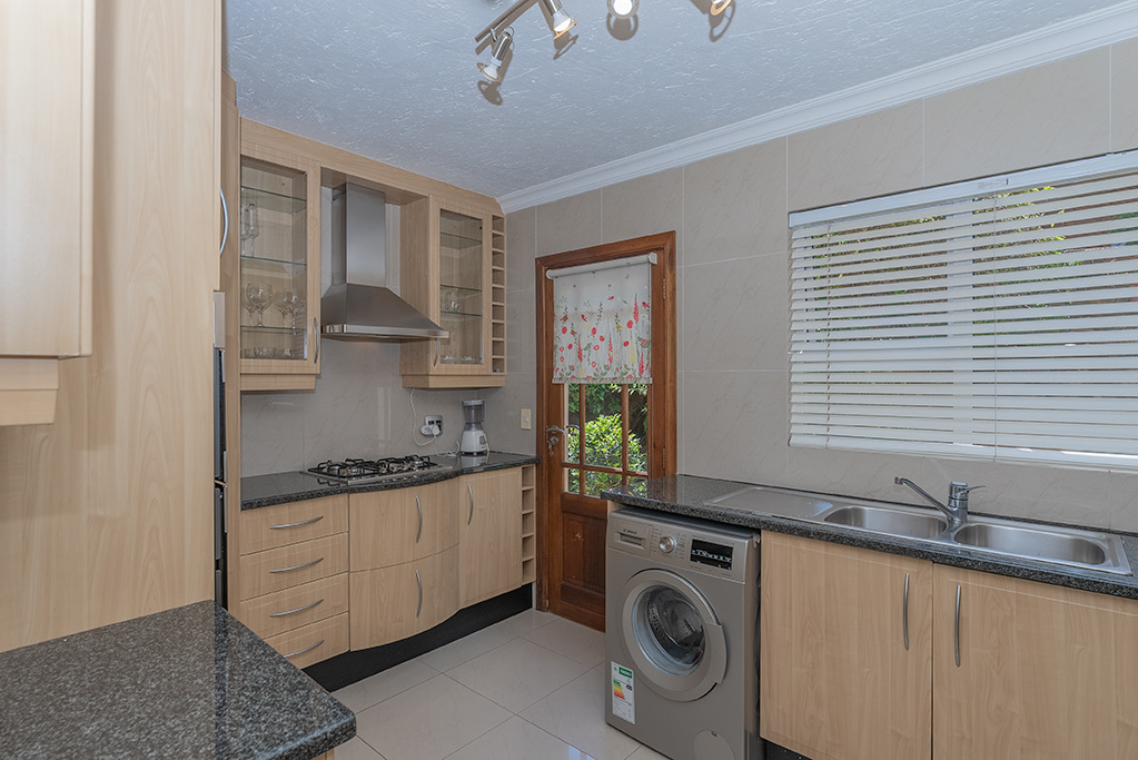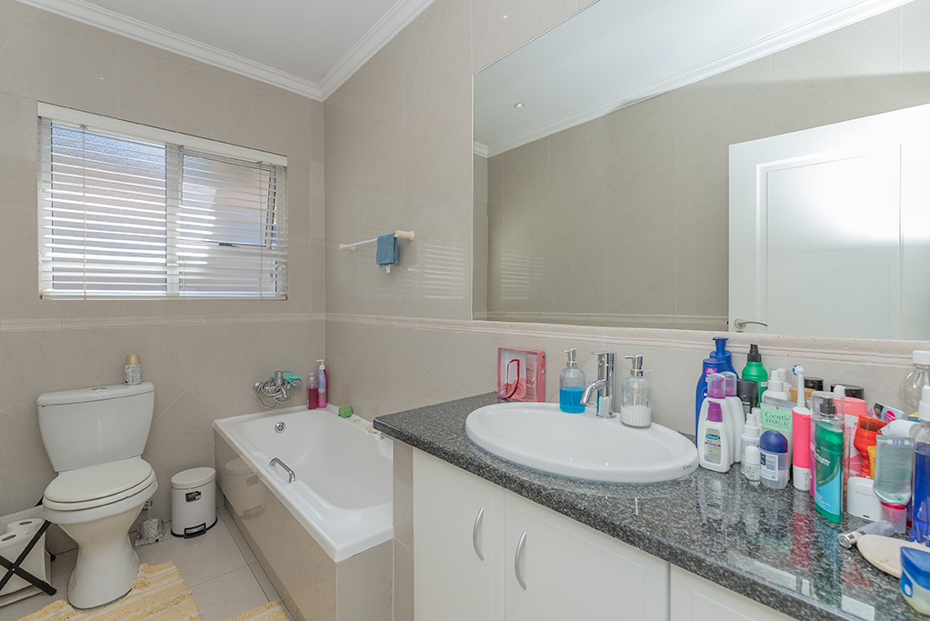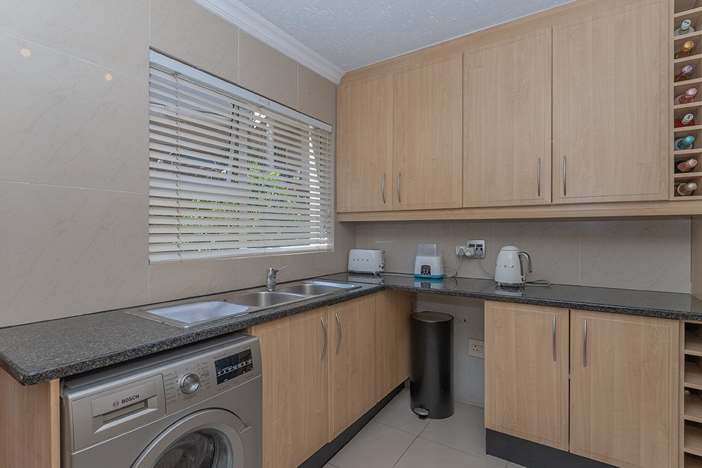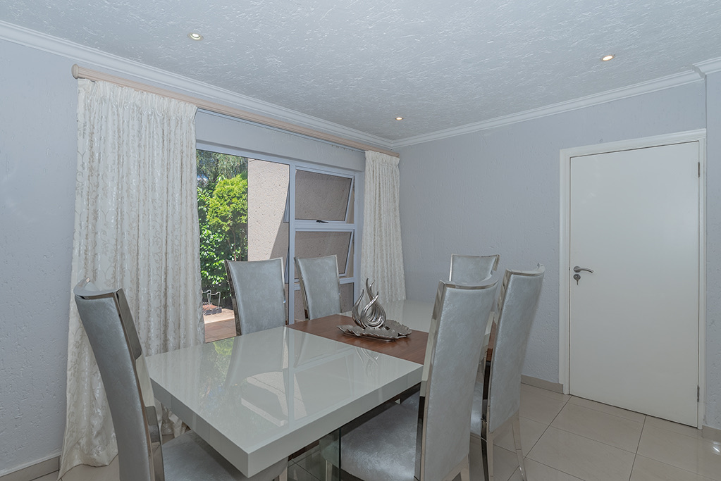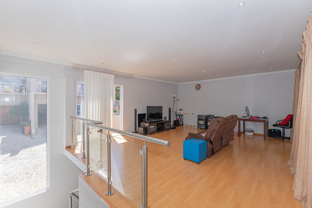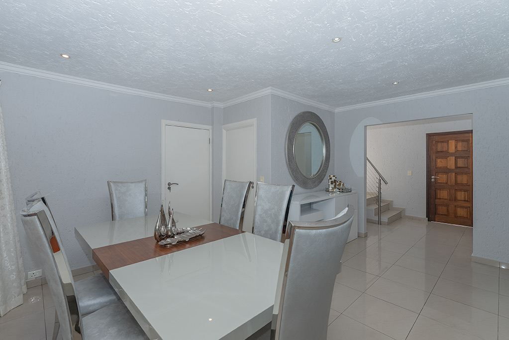 This modern double-story cluster is a must-view, with only 6 units in the complex elegant and controlled. Downstairs leads from the garage into the dining area and lounge with an open plan kitchen and garden, . Guest loo and tiled throughout. Upstairs are 3 bedrooms with laminate flooring, 2 bathrooms, a large pajama lounge with 2 balconies, and a very private and secure unit. The double garage leads into the foyer.
