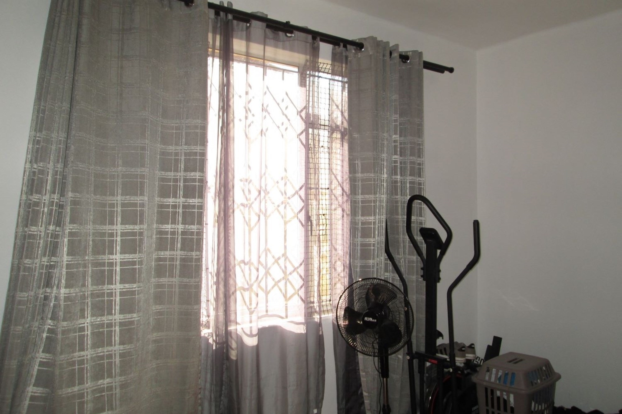 The bedroom has fitted cupboards on an entire wall. Wooden curtain rails. Room may fit a king size bed.