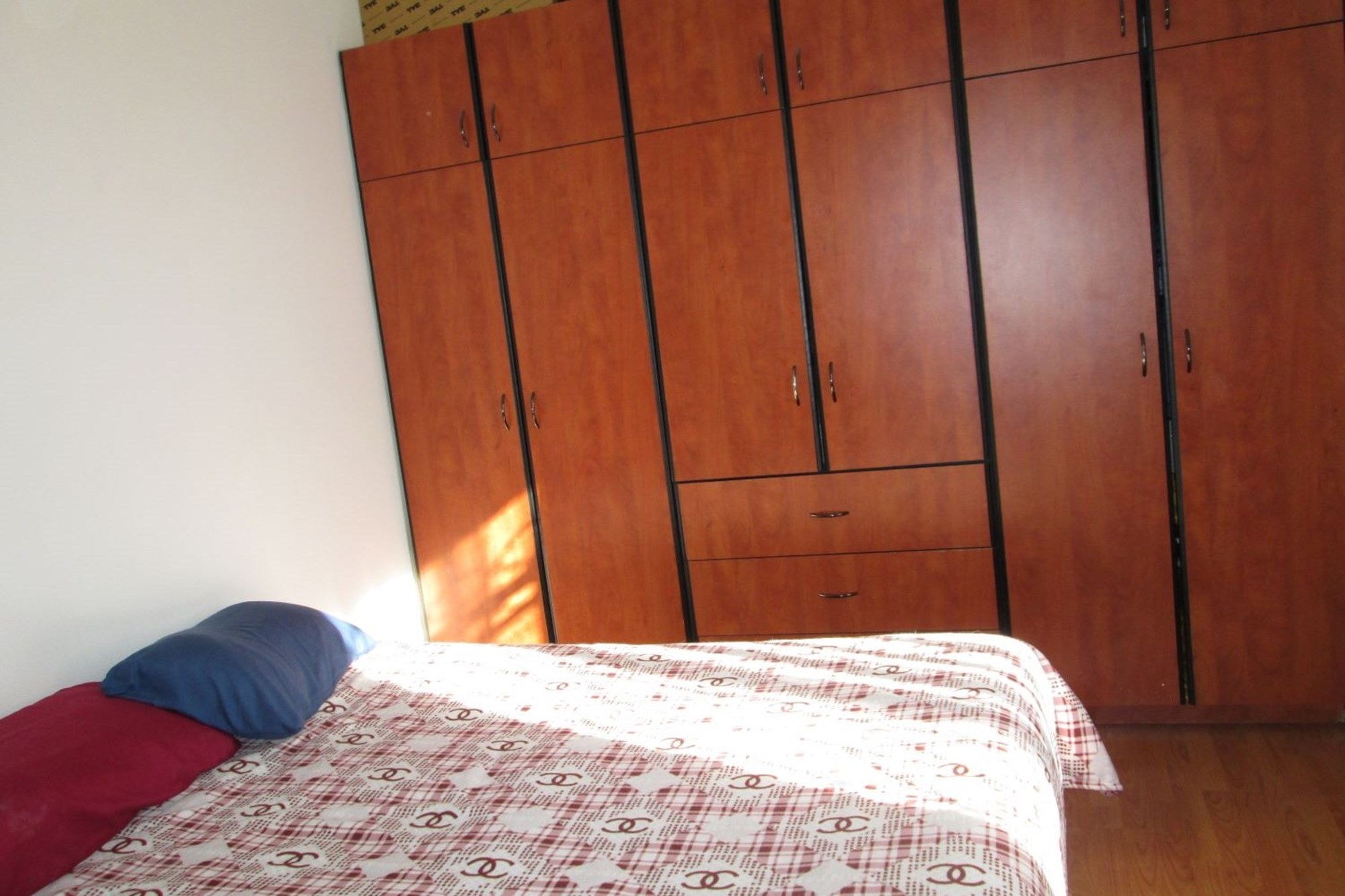 The kitchen is fully fitted with ample cupboards. Grey wooden tops and a double sink. Space for fridge and stove. The kitchen floor is tiled whilst the rest of the unit has laminated flooring.