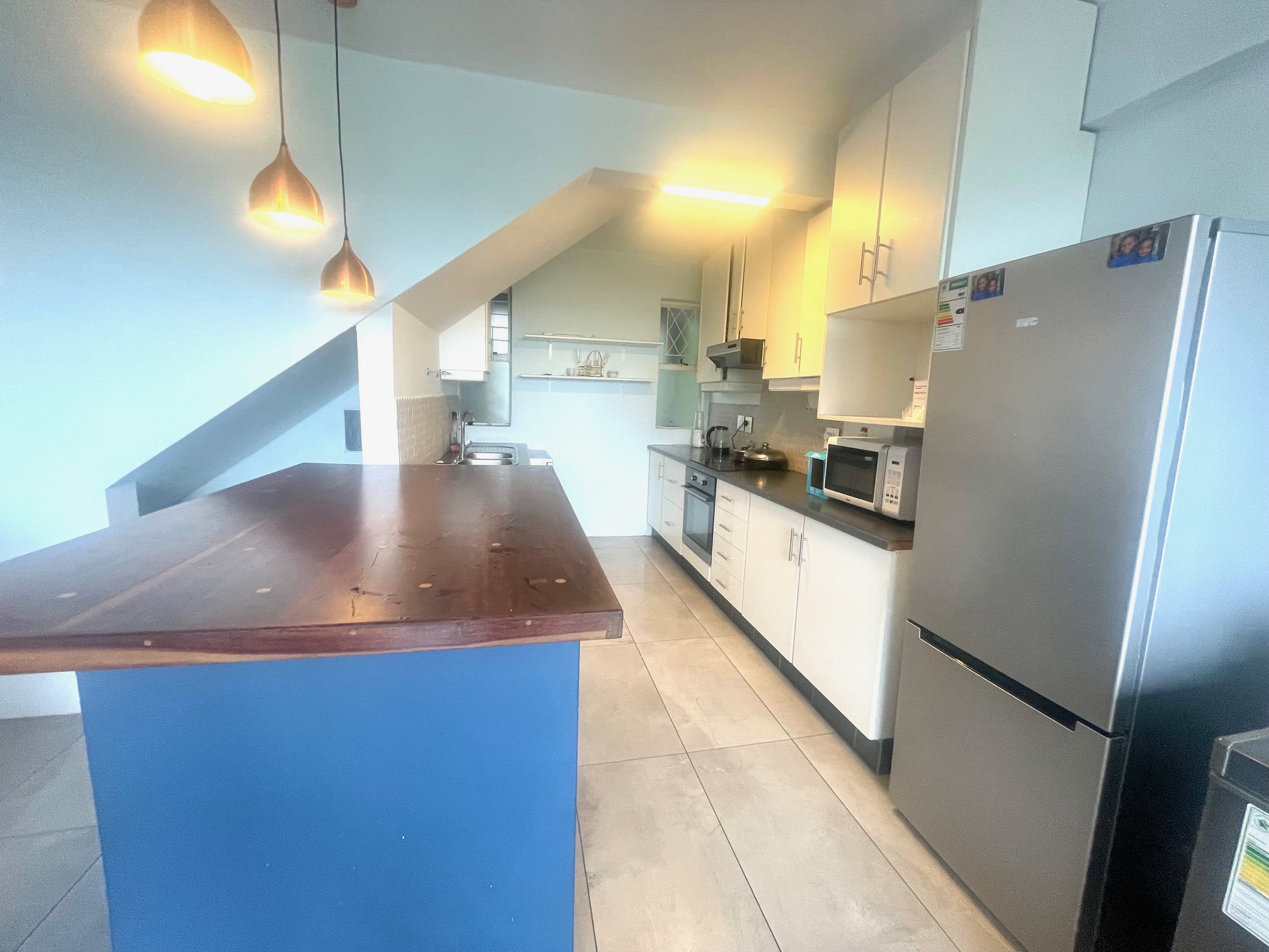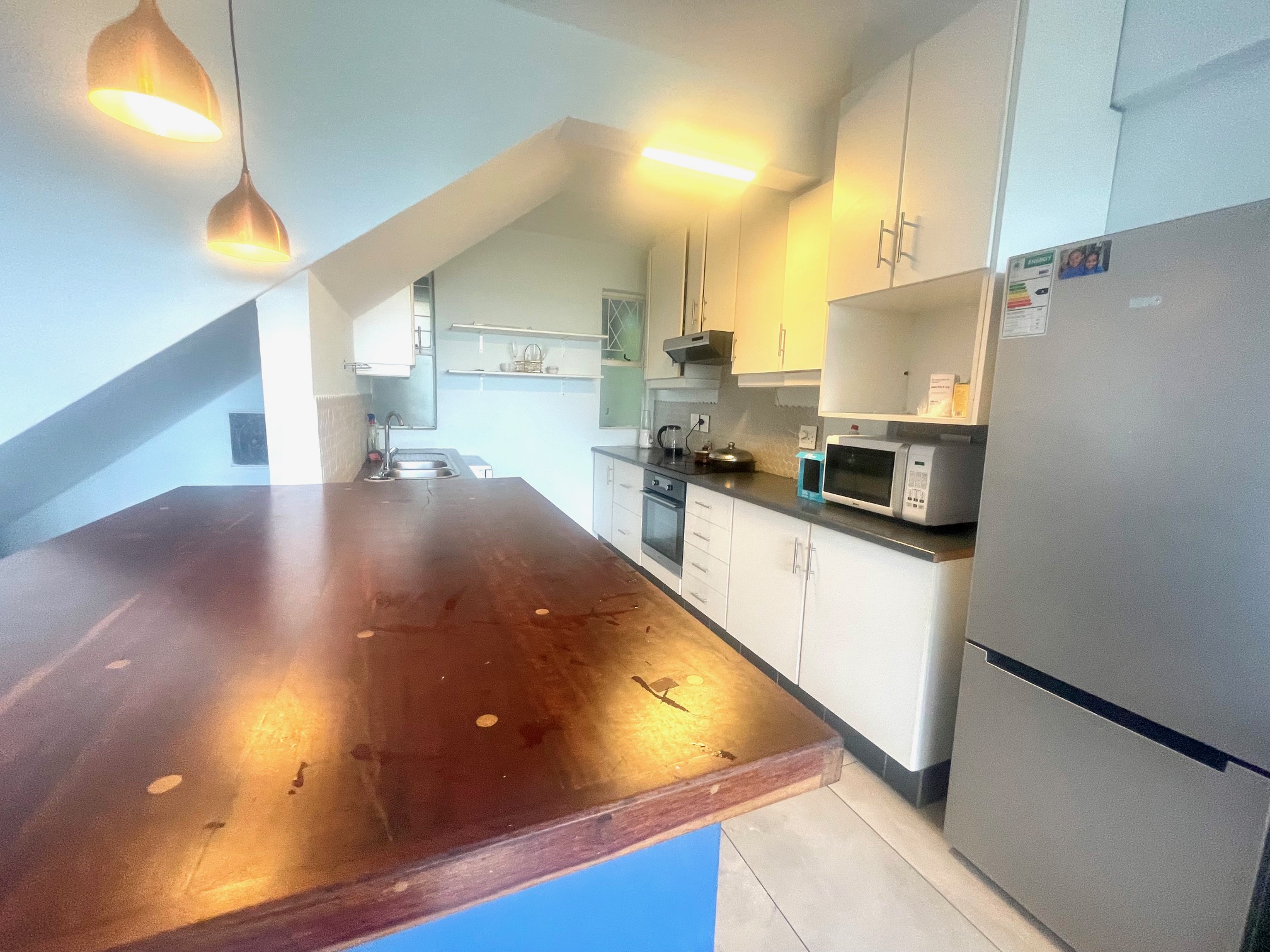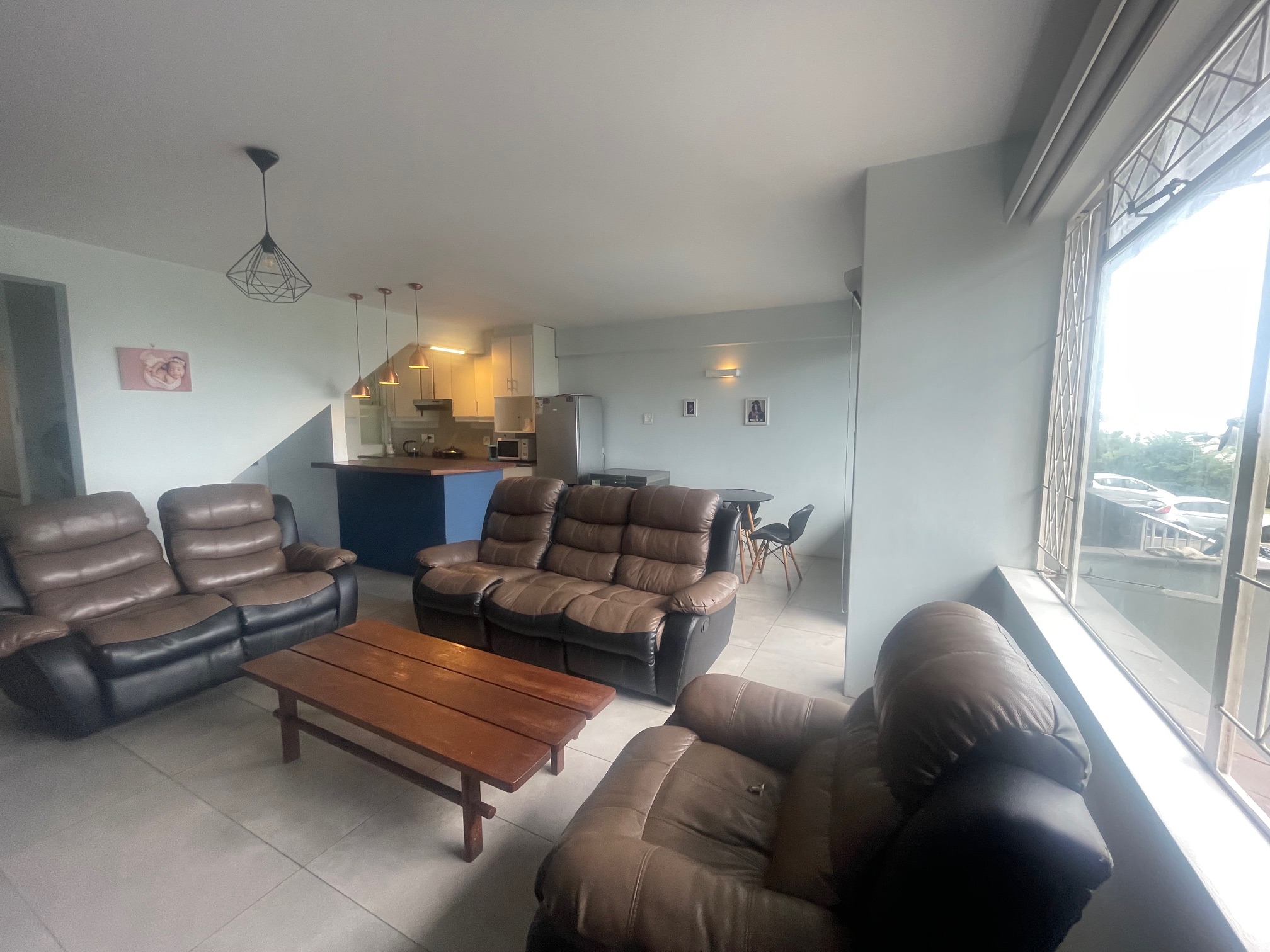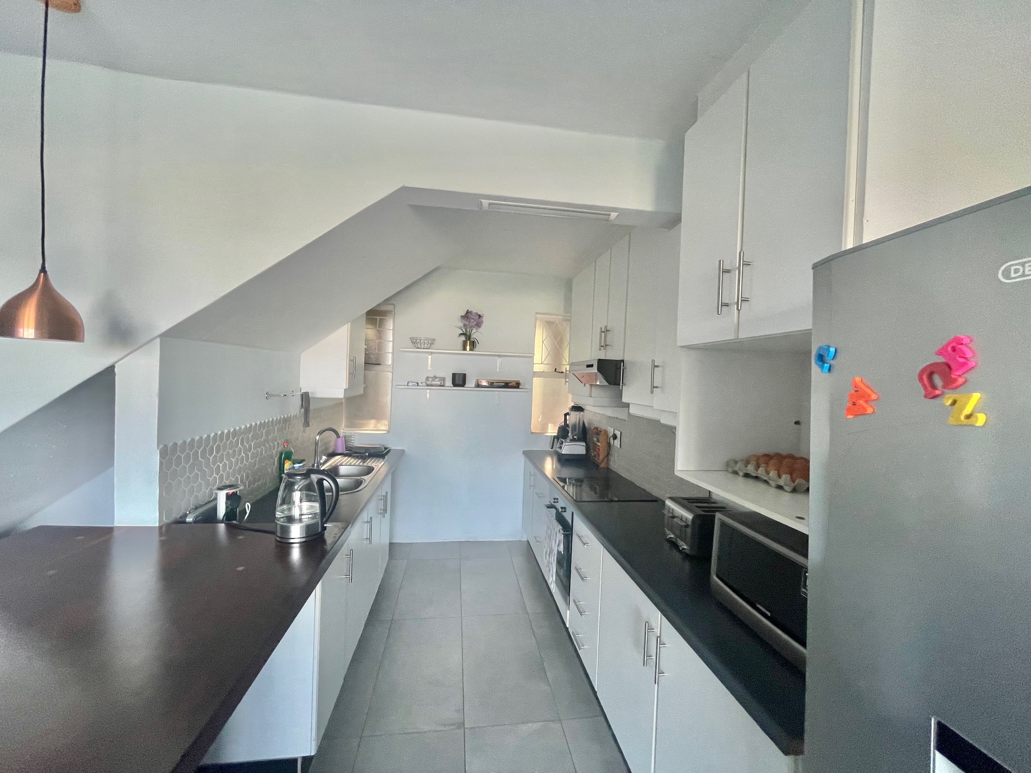 Downstairs, you’re welcomed by a guest loo conveniently located near the entrance. The space opens up to a light-filled open-plan lounge and dining area, perfect for entertaining or relaxing. The kitchen boasts ample cupboard space for all your storage needs. From the dining area, step through a glass door onto an intimate balcony — ideal for morning coffee or evening wind-downs.