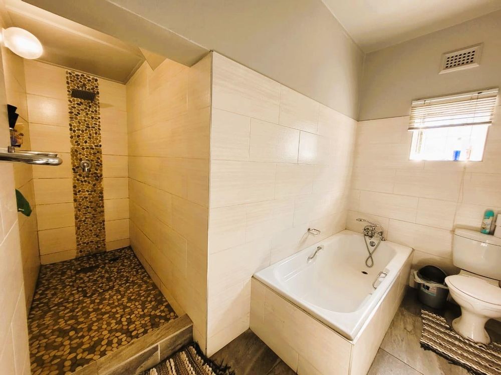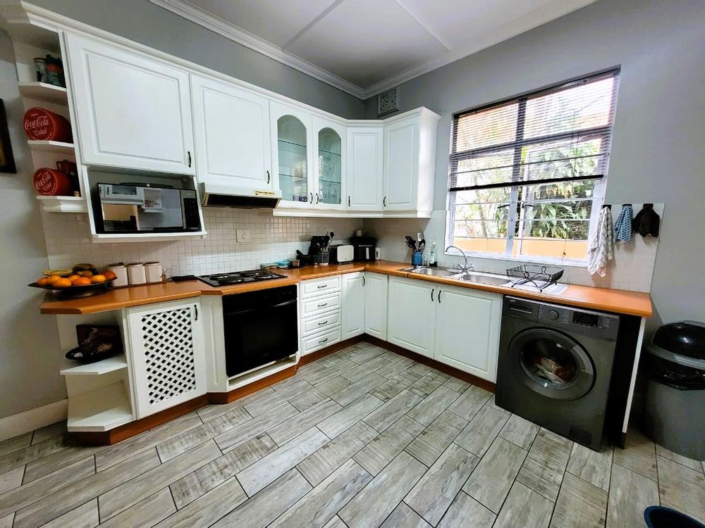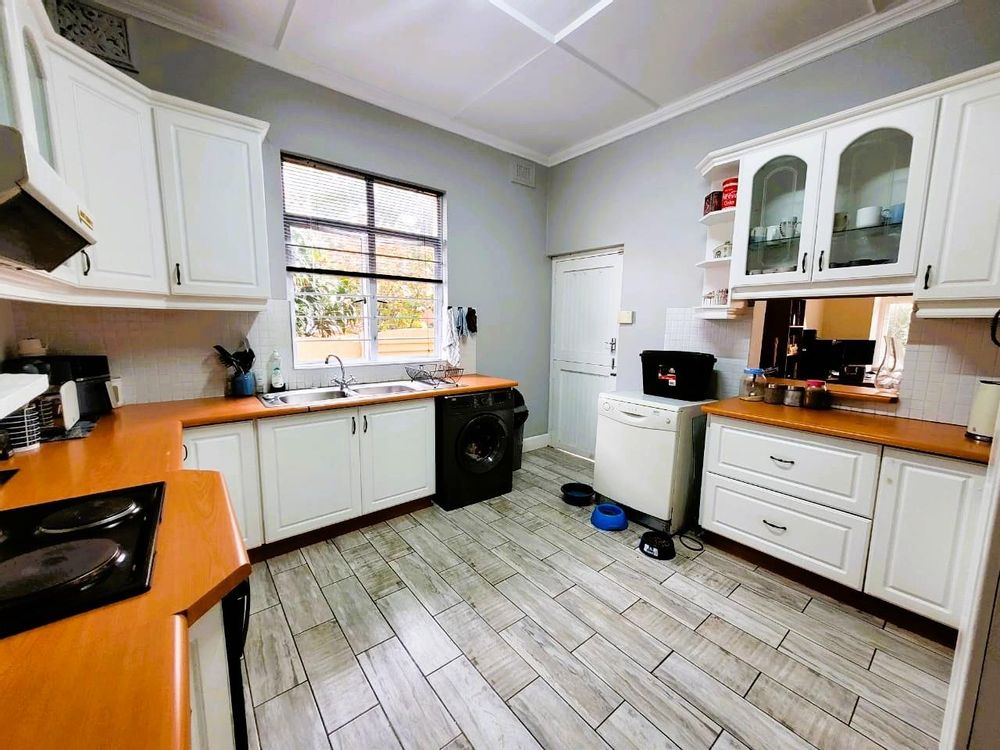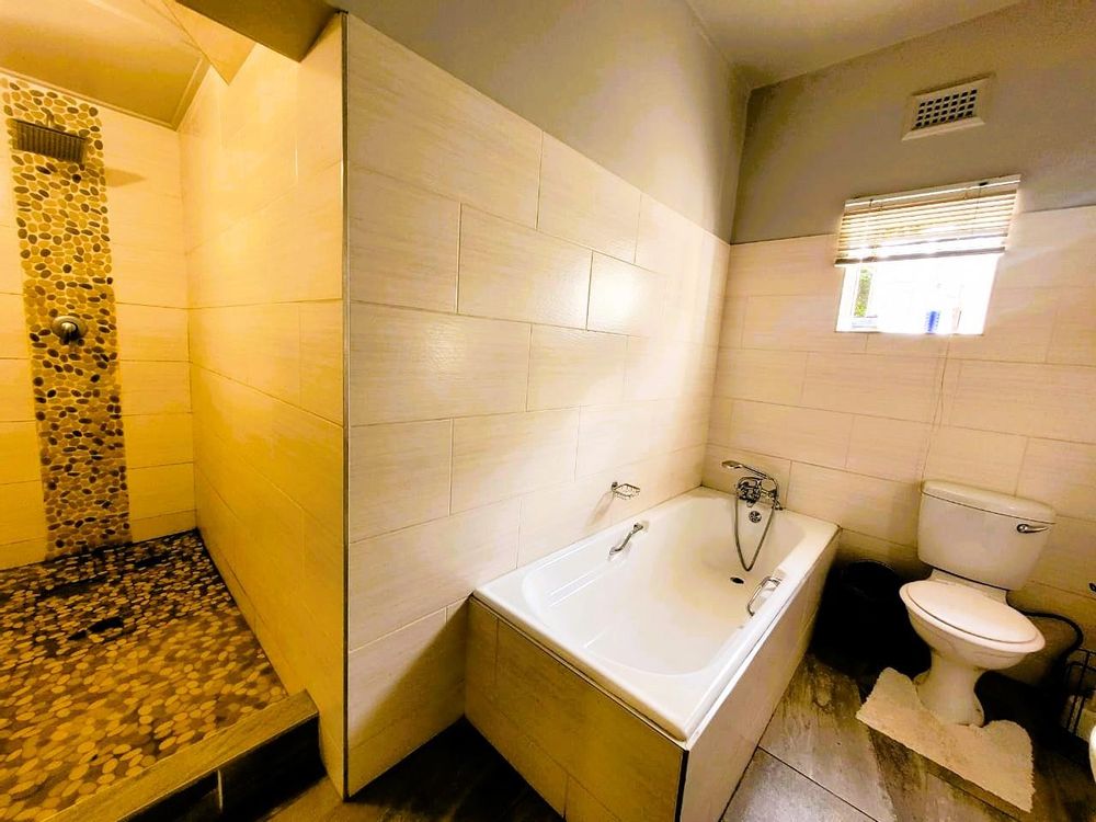 The lower-level residence offers an open plan lounge and dining area, paired with a modern kitchen featuring ample cupboard space. With three bedrooms and two bathrooms, this section of the property is designed for comfortable family living. The lush private garden adds a touch of tranquility, making it perfect for residents or tenants seeking a serene retreat.
