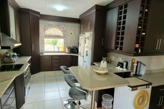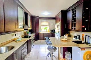 The modern kitchen is a culinary enthusiast's dream, fitted with granite countertops, sleek dark cabinetry, and a breakfast counter with seating. It offers ample cupboard space and functionality designed to suit both everyday living and entertaining. The kitchen flows into an open-plan dining area, perfect for easy family meals and convenient everyday living.