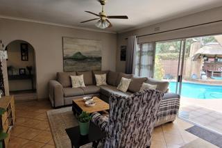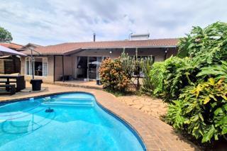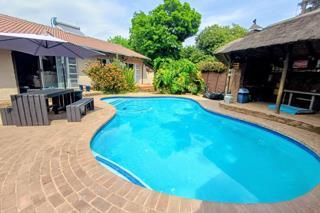 Outdoors, the property is an entertainer’s delight. The sparkling swimming pool is the centerpiece, framed by a paved area and a thatched lapa with built-in seating and space for dining, lounging, and braaing. The garden is spacious and well-maintained, with Wendy houses providing extra storage or flexible use for hobbies and play.